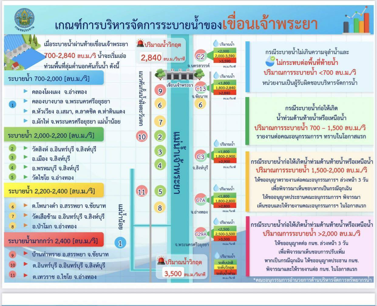 โดยไม่ให้มีผลกระทบต่อพื้นที่การเกษตร หรือหากปริมาณน้ำหลากตอนบนลดลง สำนักงานชลประทานที่ 12 จะปรับลดการระบายน้ำท้ายเขื่อนเจ้าพระยาลงตามลำดับ อย่างไรก็ตาม จึงขอแจ้งเตือนหน่วยงานที่เกี่ยวข้อง บริษัท ห้างร้านที่ประกอบกิจการในแม่น้ำเจ้าพระยา เช่น เขื่อนป้องกันตลิ่ง แพร้านอาหาร และประชาชนที่อาศัยอยู่ในพื้นที่ริมสองฝั่งแม่น้ำเจ้าพระยา เฝ้าระวังติดตามสถานการณ์อย่างใกล้ชิด