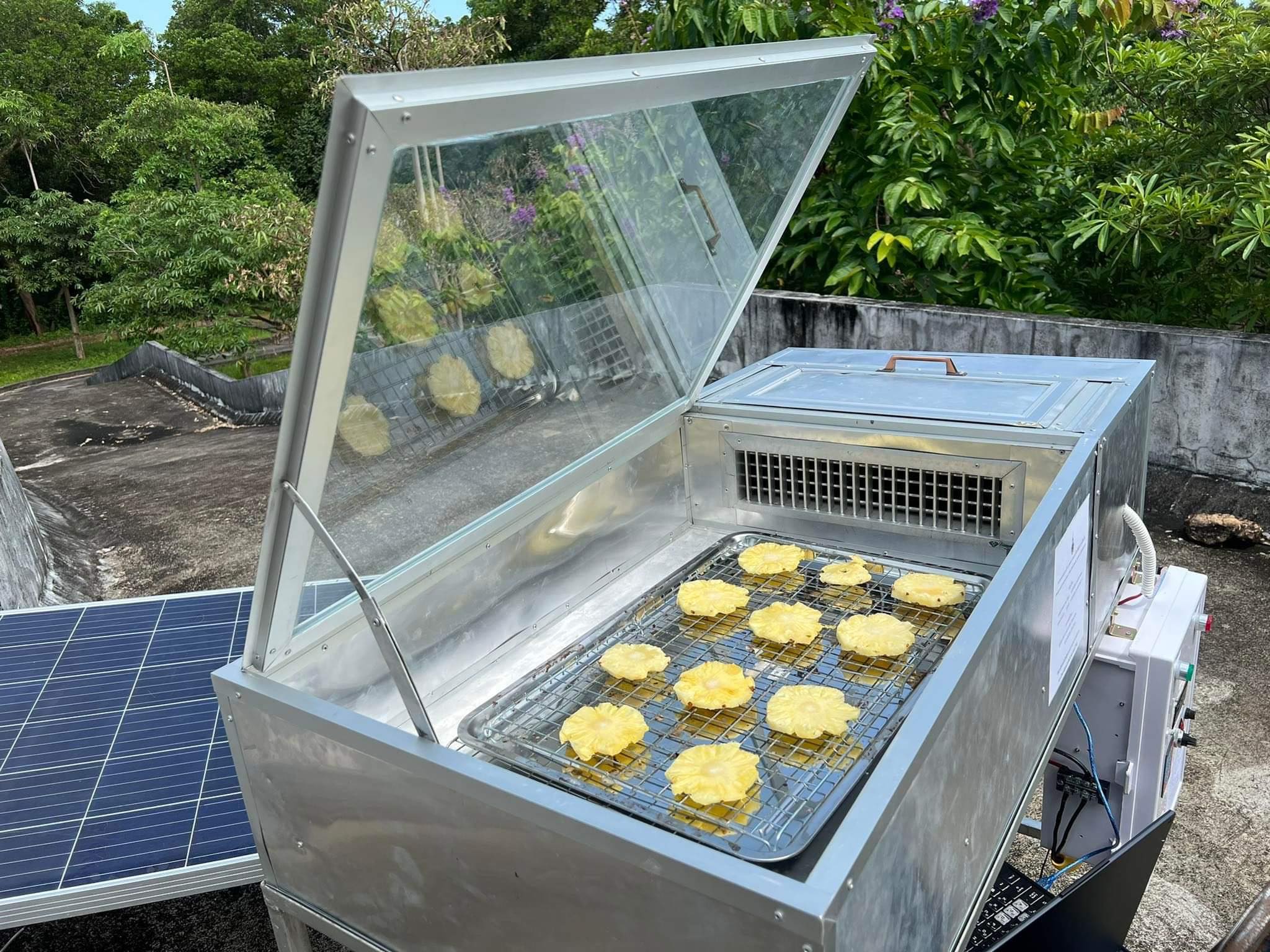 นางสาวกมลพรรณ มีเดช นักศึกษา เปิดเผยว่า จากการศึกษาปัจจุบันการถนอมอาหารจากผลผลิตทางการเกษตร เช่น พืชผักผลไม้หรือสมุนไพร มีหลากหลายวิธีไม่ว่าจะเป็นการอบแห้งด้วยลมร้อน การใช้ตู้อบแห้งที่ใช้พลังงานไฟฟ้า และการทำให้แห้งโดยใช้ความร้อนจากแสงอาทิตย์วิธีที่นิยมใช้คือการลดความชื้นด้วยวิธีการตากแห้งโดยใช้ความร้อน จากแสงอาทิตย์ วิธีนี้แม้ว่าจะเป็นวิธีแบบดั้งเดิมแต่เป็นวิธีที่มีความสะดวก และประหยดัค่าใช้จ่าย อย่างไรก็ตามยังพบว่าวิธีดังกล่าวมีปัญหา เกี่ยวกับความสะอาดที่มาจากฝุ่นละออง สัตว์ และแมลงต่างๆ ที่ได้กลิ่นก็จะตามมาตอมหรือกัดกิน เหล่านี้เป็นพาหะนำพาเชื้อโรค มีเชื้อจุลินทรีย์ และแมลงวันอาจวางไข่ทำให้เกิดหนอนขึ้นได้ และปัจจุบันระบบการอบแห้งโดยทั่วไปมีอยู่ 3 ระบบ คือ การอบแห้งระบบ Passive การอบแห้งระบบ Active และการอบแห้งระบบไฮบริด โดยพบว่า เครื่องอบแห้งระบบไฮบริด ยังมีปัญหาเกี่ยวกับความร้อนในตู้อบไม่สม่ำเสมอ เนื่องจากการกระจายลมร้อนไม่เหมาะสม ส่งผลให้คุณภาพของผลผลิตที่ออกมามีคุณภาพแตกต่างกัน ด้วยเหตุนี้จึงคิดออกแบบและสร้างระบบกระจายความร้อนในตู้อบ เพื่อให้ความร้อนสม่ำเสมอและผลผลิตในตู้อบแห้งทั่วถึง คงสารอาหารเดิมให้มีคุณภาพและปริมาณสูงขึ้น โดยตัวเครื่องมีวิธีการทำให้แห้ง 2 ระบบ คือ ใช้แสงอาทิตย์ร่วมกับพลังงานไฟฟ้าปกติ และใช้แสงอาทิตย์ร่วมกับพลังงานไฟฟ้าจากแสงอาทิตย์ โดยสามารถเลือกใช้งานได้ทั้ง 2 ระบบ