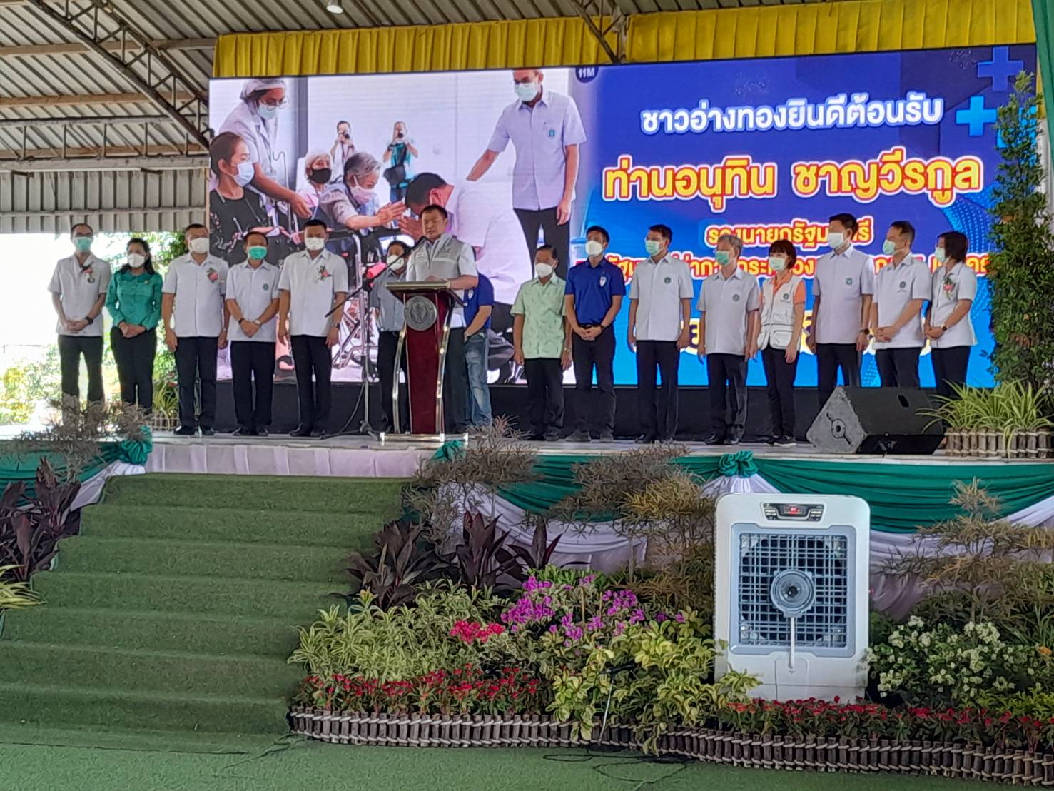 นายอนุทิน ชาญวีรกูล กล่าวว่าแม้ขณะนี้สถานการณ์โรคโควิด 19 จะเริ่มดีขึ้น และเตรียมปรับมาตรการต่าง ๆ เพื่อเข้าสู่การเป็นโรคประจำถิ่น แต่ยังคงต้องเฝ้าระวัง ป้องกันตนเอง และเข้ารับวัคซีนตามกำหนด ซึ่ง อสม. คือกำลังสำคัญของกระทรวงสาธารณสุขในการดำเนินการต่างๆ ในพื้นที่ การพัฒนาองค์ความรู้ให้กับ อสม. ทั้งเรื่องการเฝ้าระวังป้องกันโรคโควิด 19 และโรคอุบัติใหม่ การดูแลรักษาพยาบาลเบื้องต้น รวมถึงทักษะการกู้ชีพ และทักษะอื่นๆ ที่จำเป็นในการช่วยชีวิตเมื่อเกิดเหตุการณ์ฉุกเฉิน เพื่อเตรียมความพร้อมในการเข้ามามีส่วนร่วมในระบบการแพทย์ฉุกเฉิน จะช่วยให้งานสาธารณสุขในพื้นที่มีความเข้มแข็งยิ่งขึ้น และจะเป็นประโยชน์อย่างมากต่อประชาชนในจังหวัดอ่างทองพร้อมให้กำลังใจแก่อาสาสมัครสาธารณสุข (อสม.) ที่เป็นผู้เสียสละอุทิศตนให้กับการปฏิบัติงานด้านสาธารณสุข และได้มอบป้ายศูนย์ร่วมสุข และเสื้อแก่ประธาน อสม.ให้กับ 7 อำเภอ พร้อมทั้งมอบอุปกรณ์ฟื้นฟูสภาพผู้พิการ ผู้สูงอายุ และผู้ด้อยโอกาสและมอบป้ายประจำศูนย์เครื่องช่วยความพิการ ให้แก่องค์การบริหารส่วนจังหวัดอ่างทอง ได้มอบอุปกรณ์ฟื้นฟูสมรรถภาพ อาทิ ขาเทียม รถเข็นนั่ง ไม้เท้าพยุงตัว หมอนป้องกันแผลกดทับ ให้กับผู้พิการ ผู้สูงอายุ และผู้ด้อยโอกาสในพื้นที่ได้นำใช้ในการฟื้นฟูตนเองต่อเนื่องที่บ้าน เป็นการช่วยเพิ่มคุณภาพชีวิตให้ดีขึ้น และมอบเงินกรมธรรม์ให้กับ อสม.ที่ติดเชื้อโควิด 19