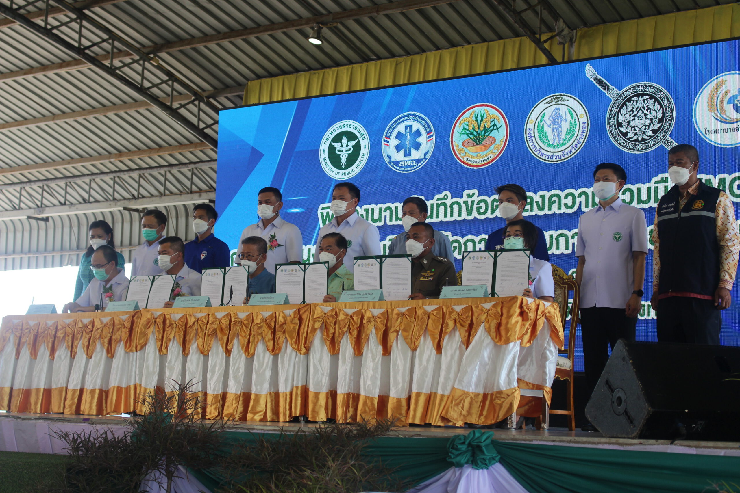 โดยมี นายวีระศักดิ์ วิจิตร์แสงศรี ผู้ว่าราชการจังหวัดอ่างทอง กล่าวต้อนรับ พร้อมด้วยนายสมศักดิ์ ปริศนานันทกุล อดีตรัฐมนตรีว่าการกระทรวงเกษตรและสหกรณ์ นายภราดร –นายกรวีร์ ปริศนานันทกุล ส.ส.จังหวัดอ่างทอง พรรคภูมิใจไทย และคณะผู้บริหารกระทรวงสาธารณสุข รองผู้ว่าราชการจังหวัดอ่างทองทั้งสองท่าน หัวหน้าส่วนราชการ ให้การต้อนรับ โดยมีอาสาสมัครสาธารณสุข (อสม.) จังหวัดอ่างทอง ทั้ง 7 อำเภอ จำนวน 5,290 คน ในการนี้มีผู้บริหารร่วมลงนามบันทึกข้อตกลงความร่วมมือ (MOU) ระหว่าง นายวีระศักดิ์ วิจิตร์แสงศรี ผู้ว่าราชการจังหวัด เรืออากาศเอก นพ.อัจฉริยะ แพงมา เลขาธิการสถาบันการแพทย์ฉุกเฉินแห่งชาติ นายสุรเชษ นิ่มกุล นายกองค์การบริหารส่วนจังหวัดอ่างทอง พลตำรวจตรีวิชิต บุญชินวุฒิกุล ผู้บังคับการตำรวจภูธรจังหวัดอ่างทอง นพ. ธนะวัฒน์ วงศ์ผัน นายแพทย์สาธารณสุขจังหวัดอ่างทอง และ พญ.ดวงพร อัศวราชันย์ ผู้อำนวยการโรงพยาบาลอ่างทอง เพื่อบูรณาการร่วมกันในการบริหารจัดการให้ประชาชนที่เจ็บป่วยฉุกเฉินในพื้นที่ สามารถเข้าถึงการรักษาได้อย่างทันท่วงที ปลอดภัย และเท่าเทียมกันเป็นการลดความพิการ และเสียชีวิต