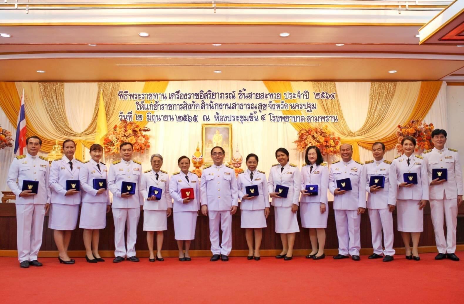 ซึ่งมีผู้ที่ได้รับพระราชทานเครื่องราชอิสริยาภรณ์ชั้นสายสะพาย ชั้นประถมาภรณ์ข้างเผือก (ป.ช.) จำนวน 1ราย และชั้นประถมาภรณ์มงกุฎไทย (ป.ม.) จำนวน12ราย และ รวม ทั้งสิ้น13 ราย จากหน่วยงานในสังกัดสำนักงานสาธารณสุขจังหวัดนครปฐม