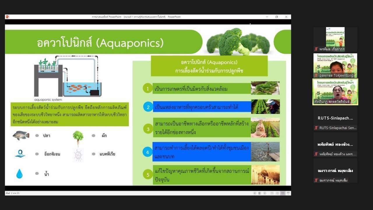 นางสาวกัตตินาฏ สกุลสวัสดิพันธ์ อาจารย์สาขาวิทยาศาสตร์ทางทะเลและสิ่งแวดล้อม พร้อมด้วยคณะทำงานในโครงการหลักสูตรสระยะสั้น “Future Crops : อควาโปนิกส์ (Aquaponics)” กล่าวว่าระบบ อควาโปนิกส์ (Aquaponics) เป็นระบบการเลี้ยงปลาร่วมกับการปลูกผัก โดยยึดถือหลักการนำเสียของระบบชีววิทยา จากการศึกษาพบว่าสามารถผลิตสารอาหารให้กับระบบชีววิทยาอีกชนิดหนึ่งได้อย่างเหมาะสม เป็นระบบนิเวศน์แบบเกื้อกูลกัน โดยน้ำที่ผ่านการเลี้ยงปลาใช้ในการหมุนเวียน ให้เกิดประโยชน์ในการปลูกพืช แบบไร้ดิน ถือเป็นการเกษตรที่เป็นมิตรต่อสิ่งแวดล้อม และประหยัดในการใช้พื้นที่สามารถทำการเกษตร ทั้งชนบท และชุมชนเมือง
