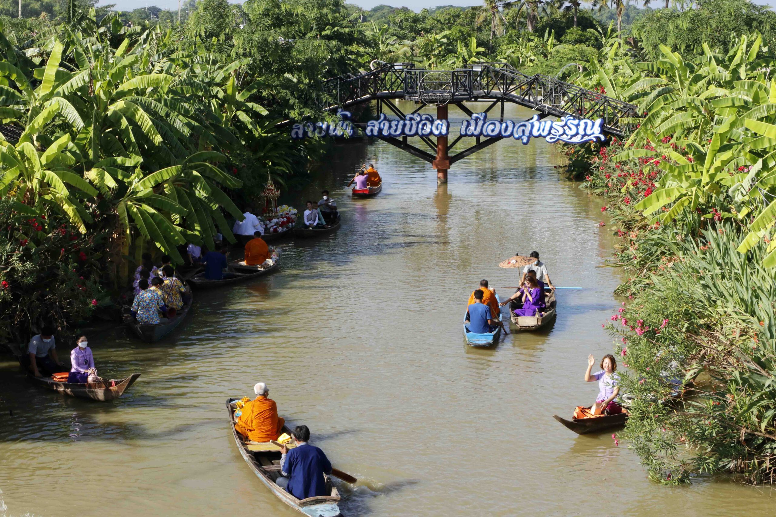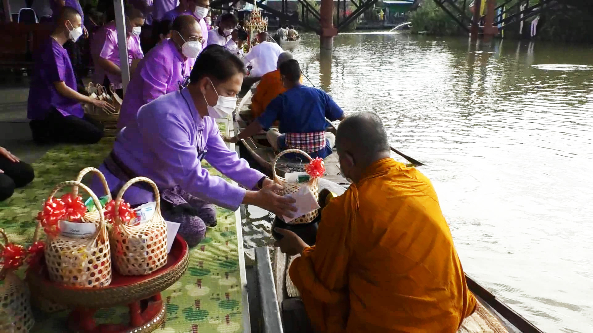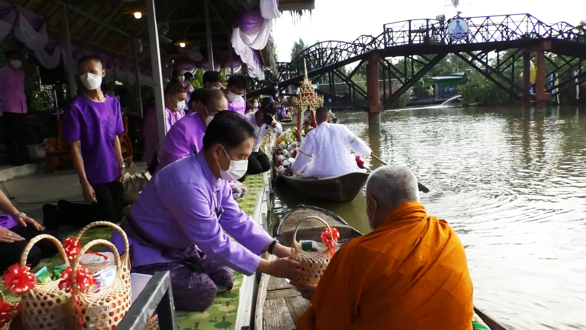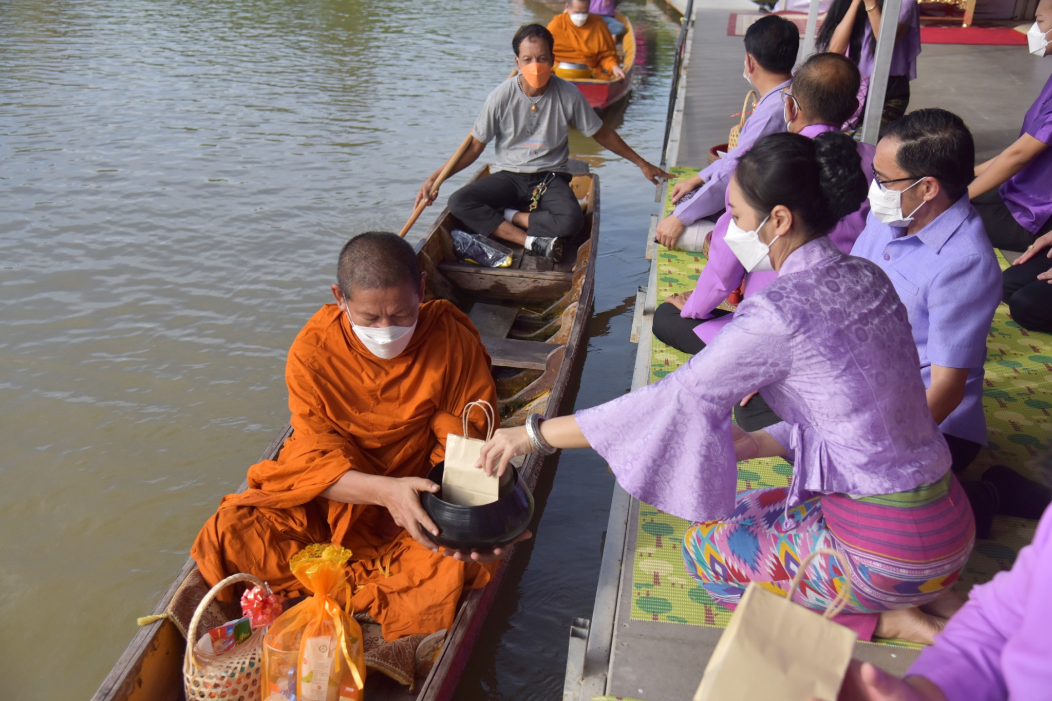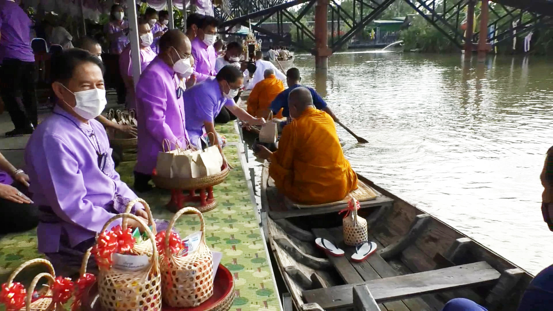 สุพรรณบุรี แต่งชุดไทยสีม่วงตักบาตรทางน้ำนาวาภิกขาจารถวายเป็นพระราชกุศล