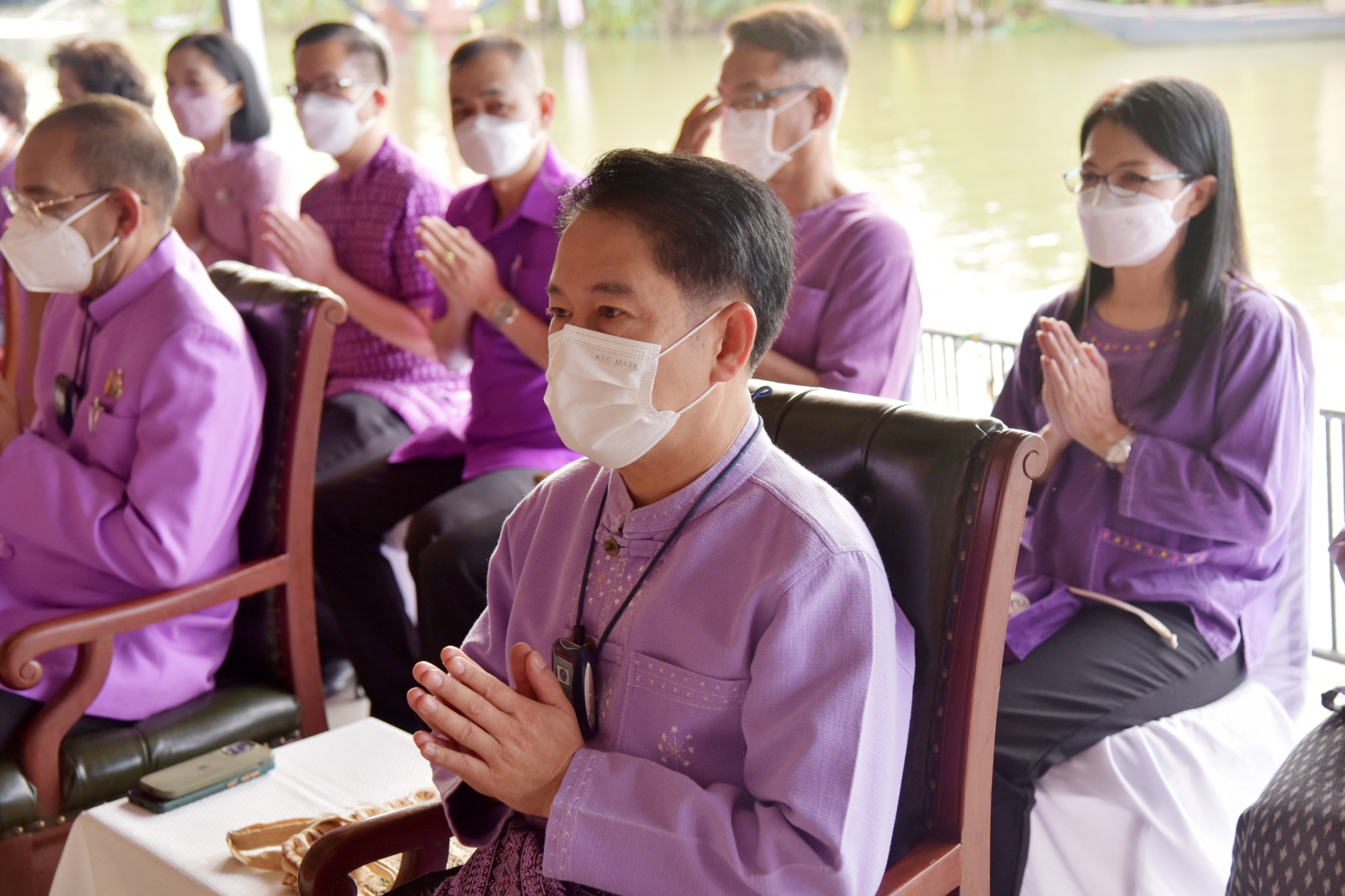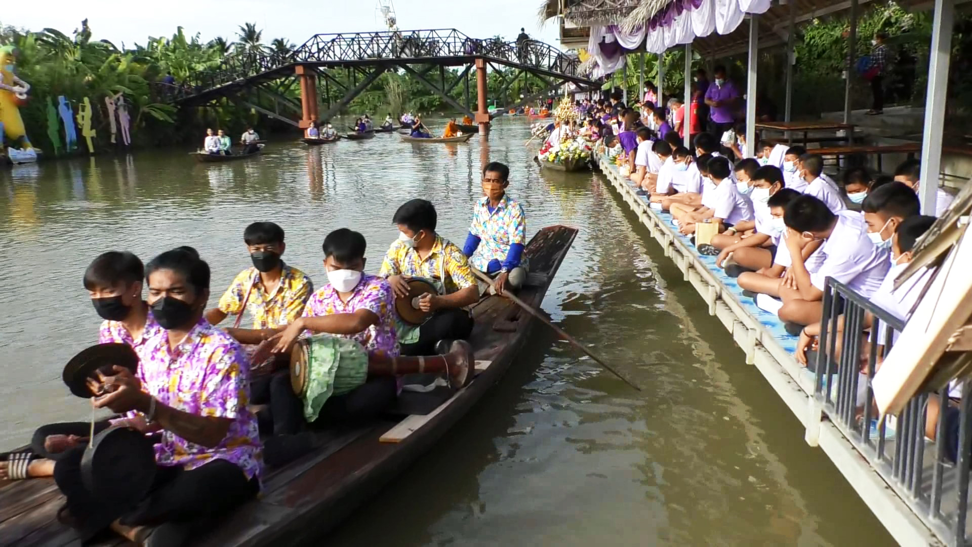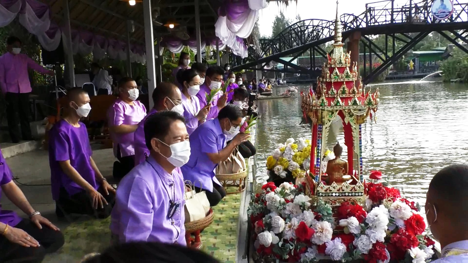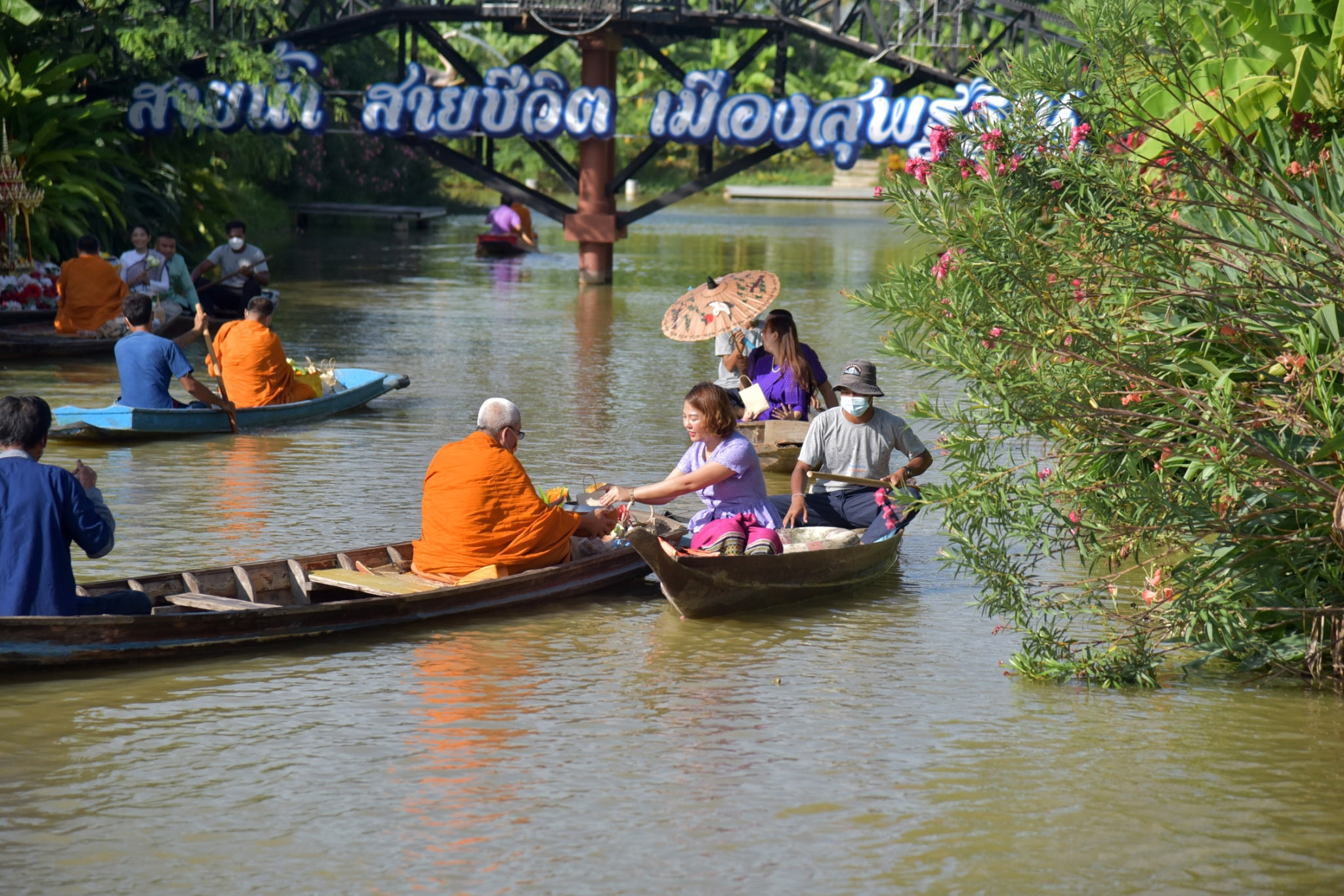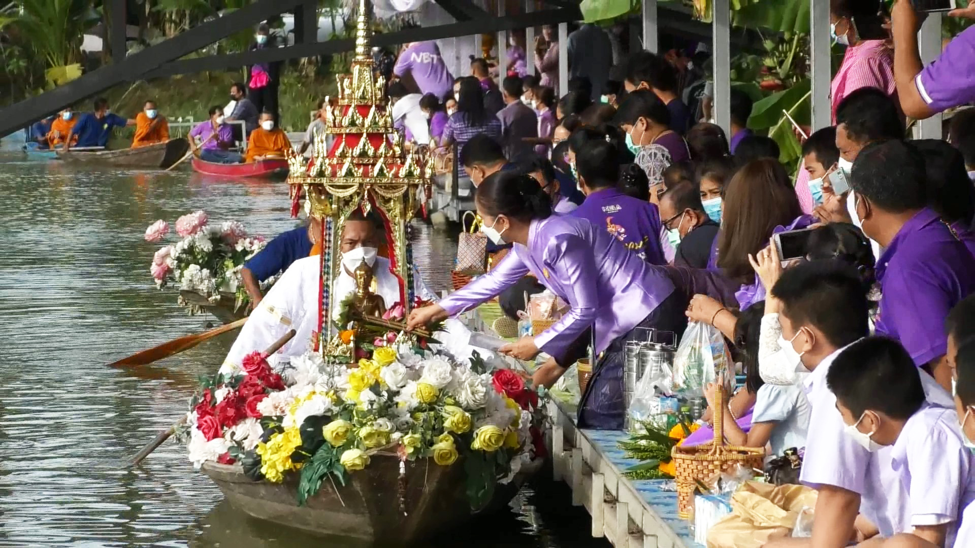 สุพรรณบุรี แต่งชุดไทยสีม่วงตักบาตรทางน้ำนาวาภิกขาจารถวายเป็นพระราชกุศล