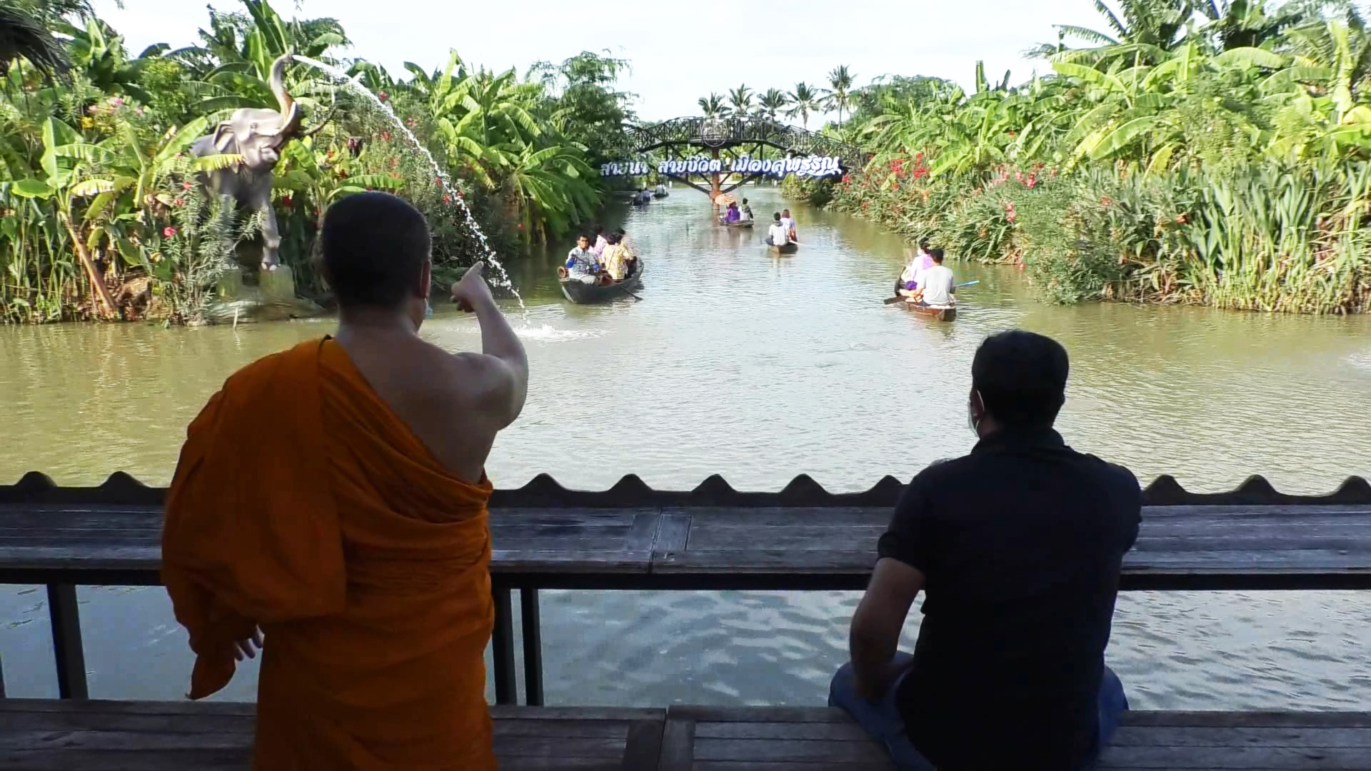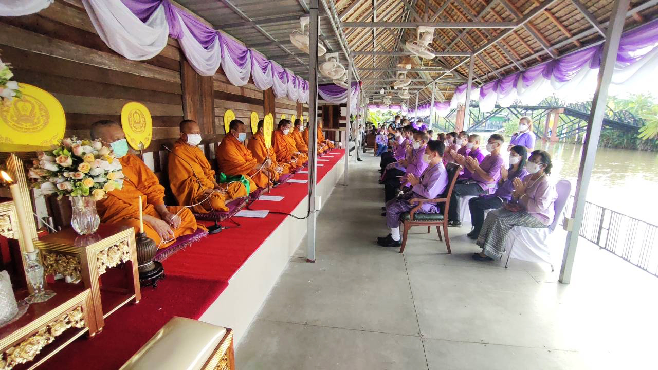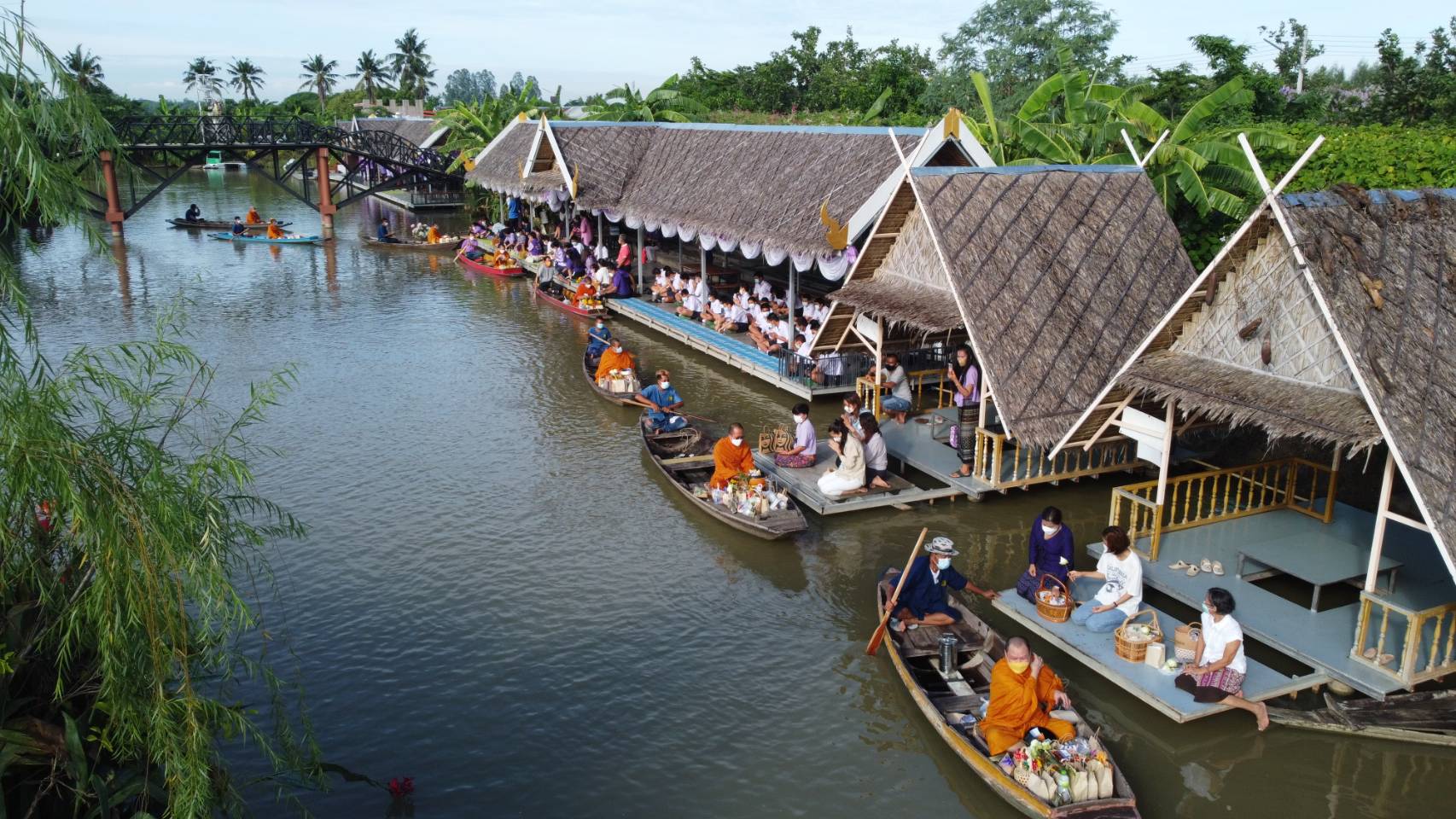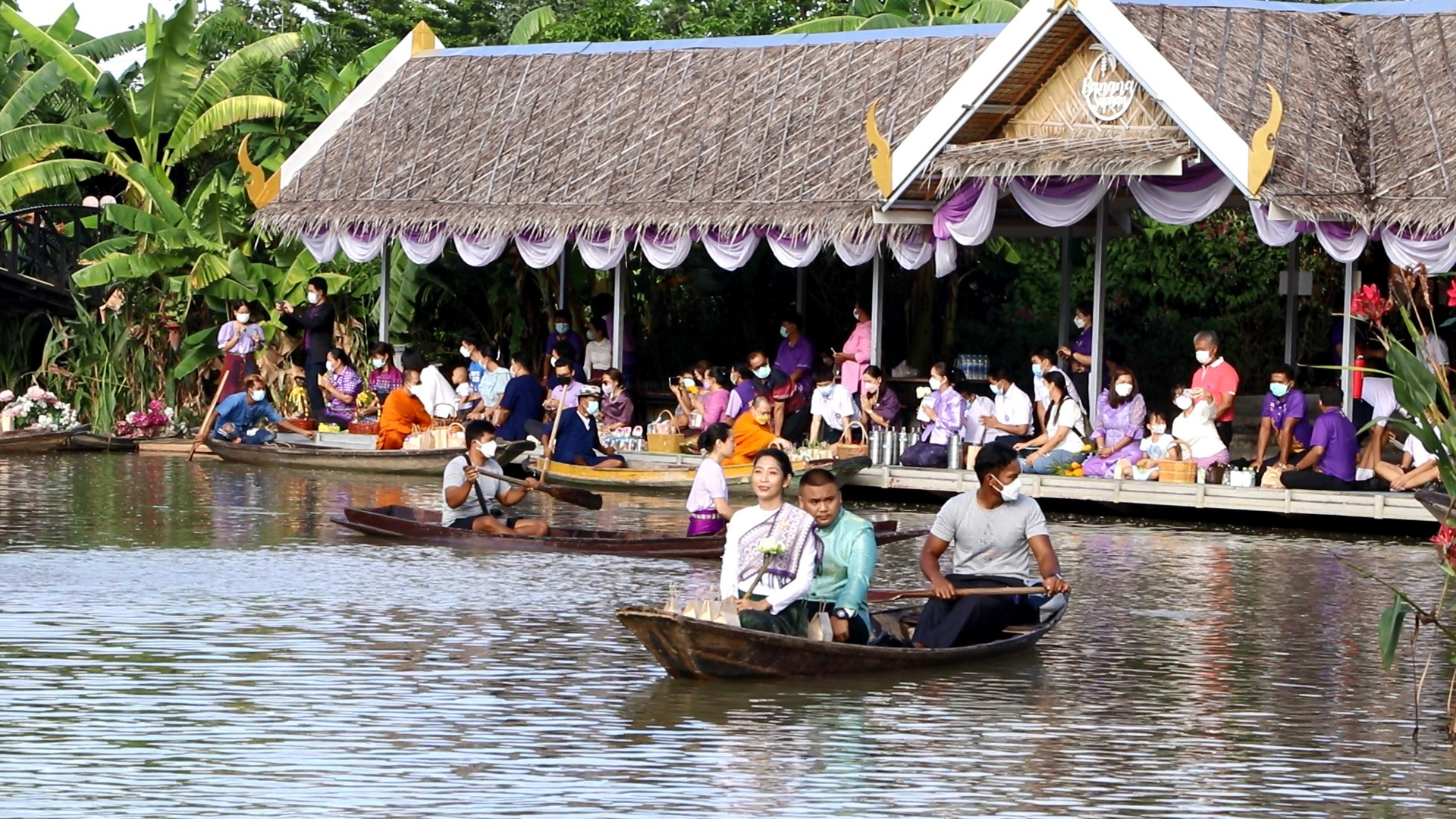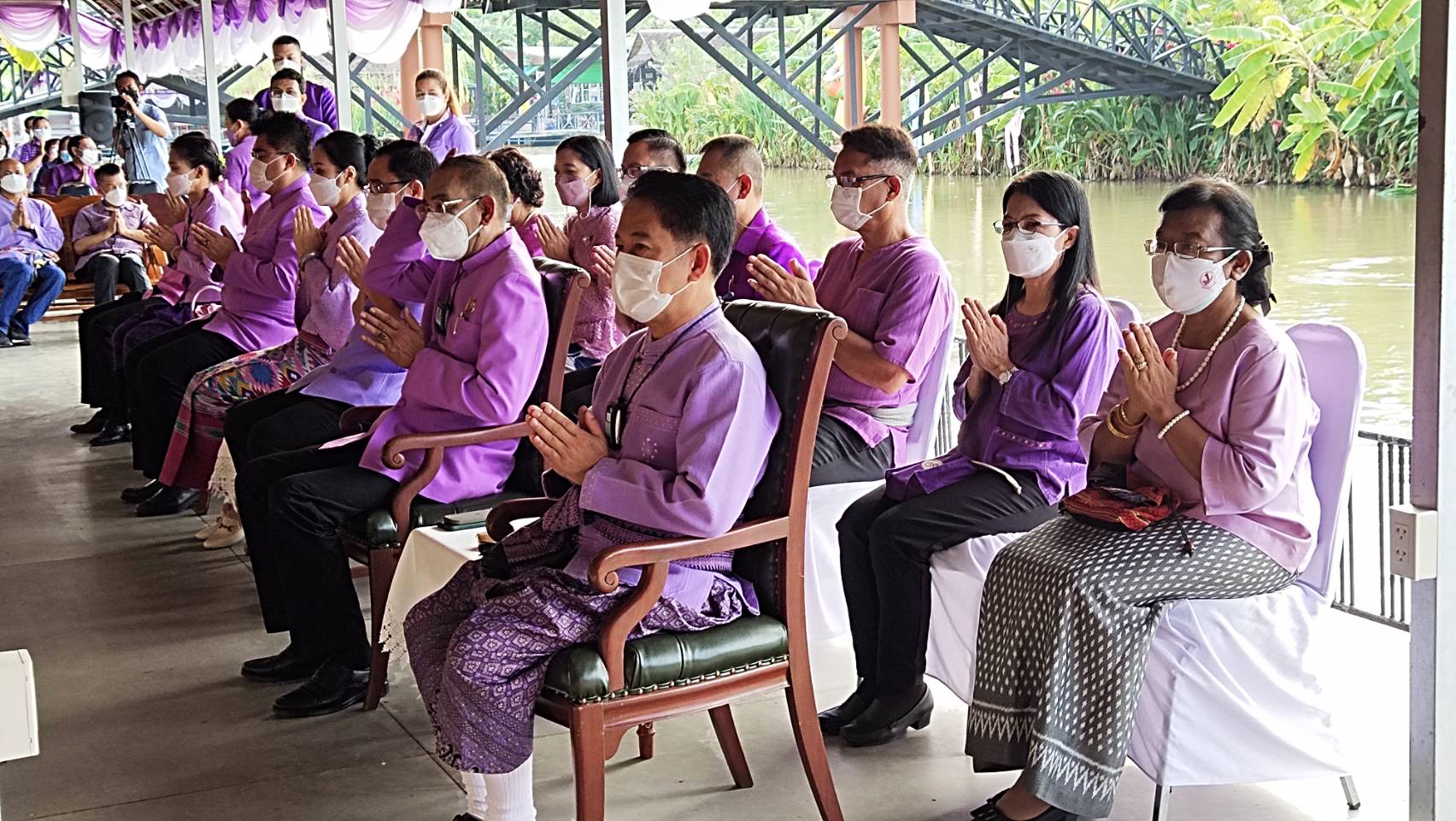 สุพรรณบุรี แต่งชุดไทยสีม่วงตักบาตรทางน้ำนาวาภิกขาจารถวายเป็นพระราชกุศล