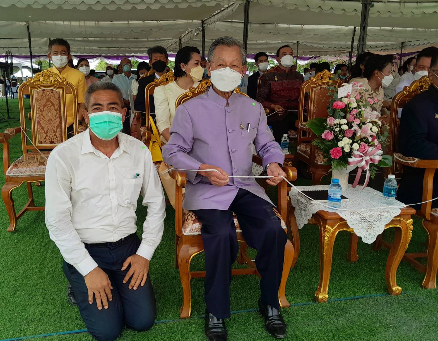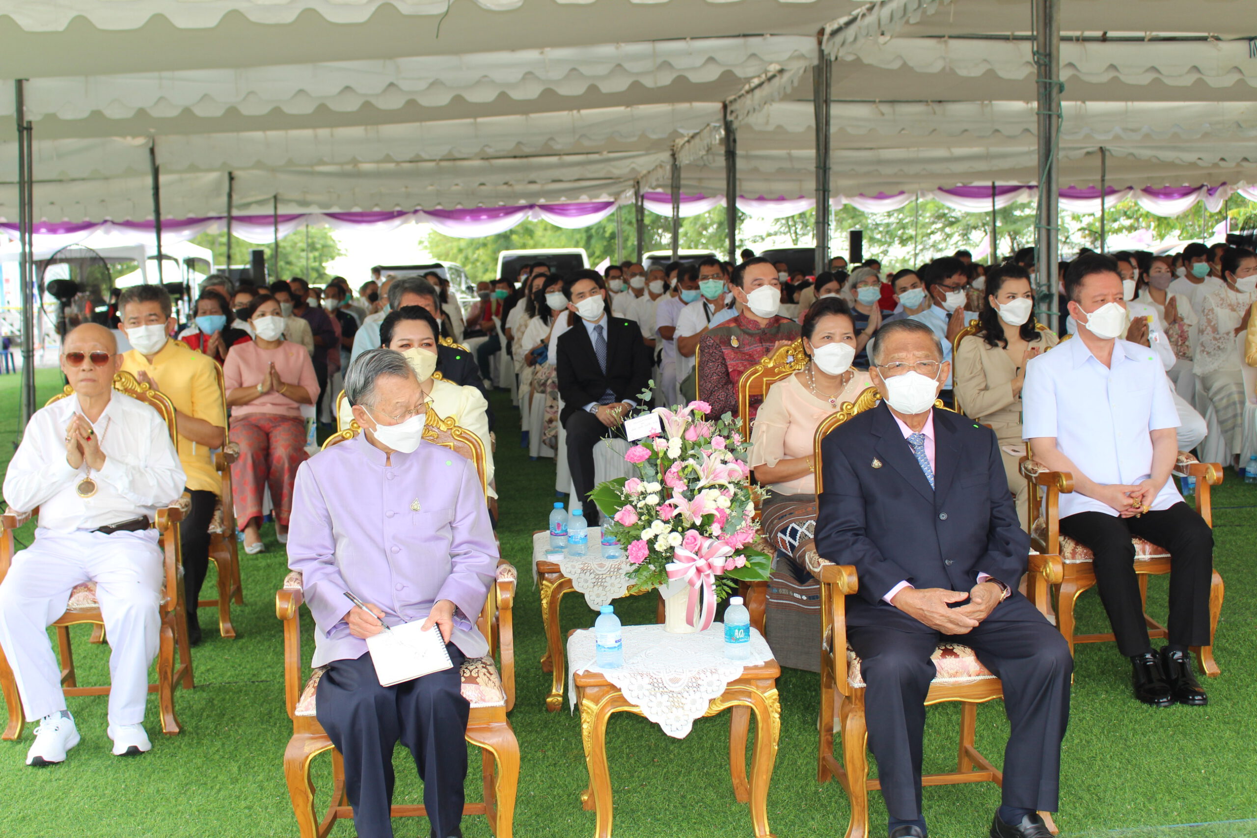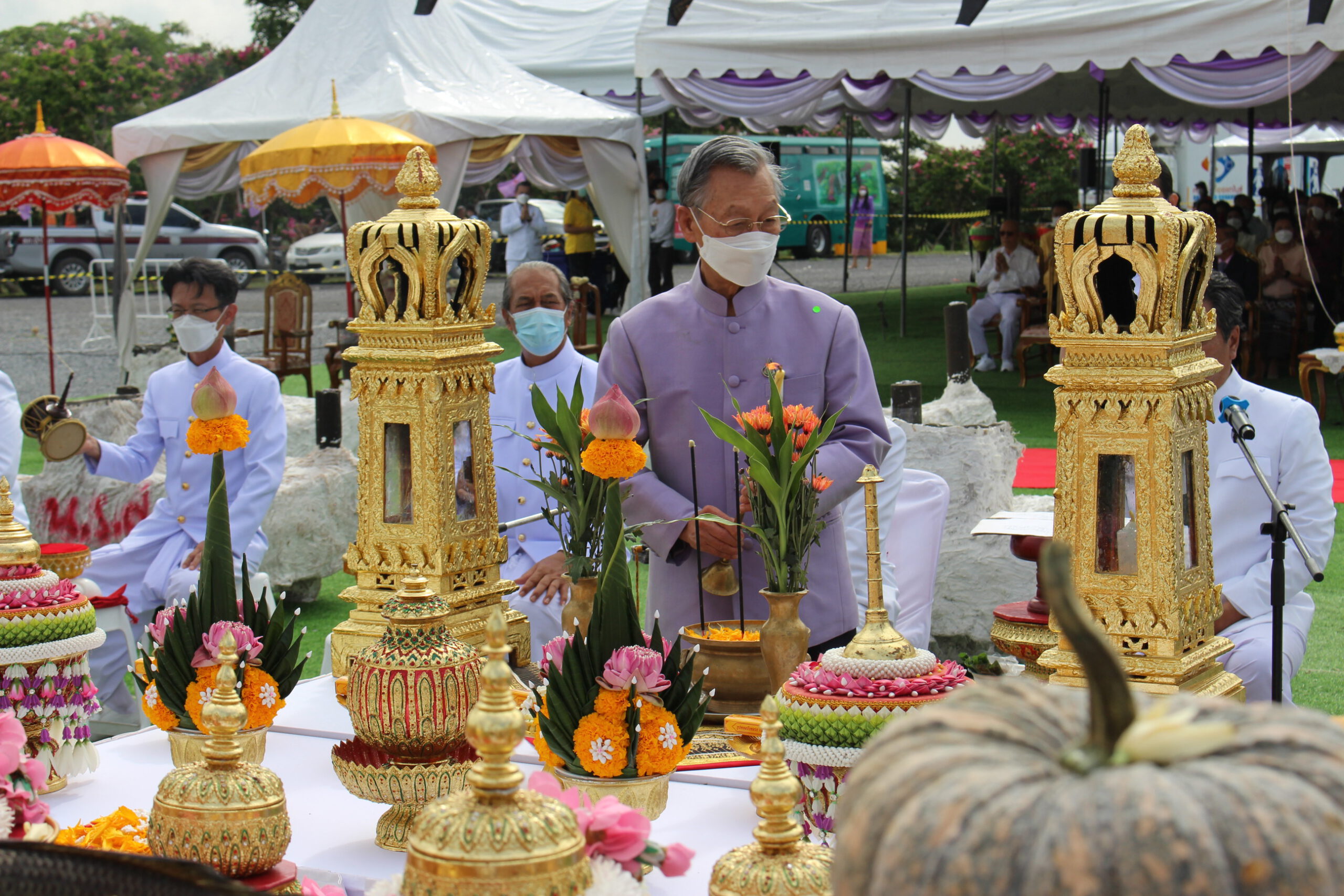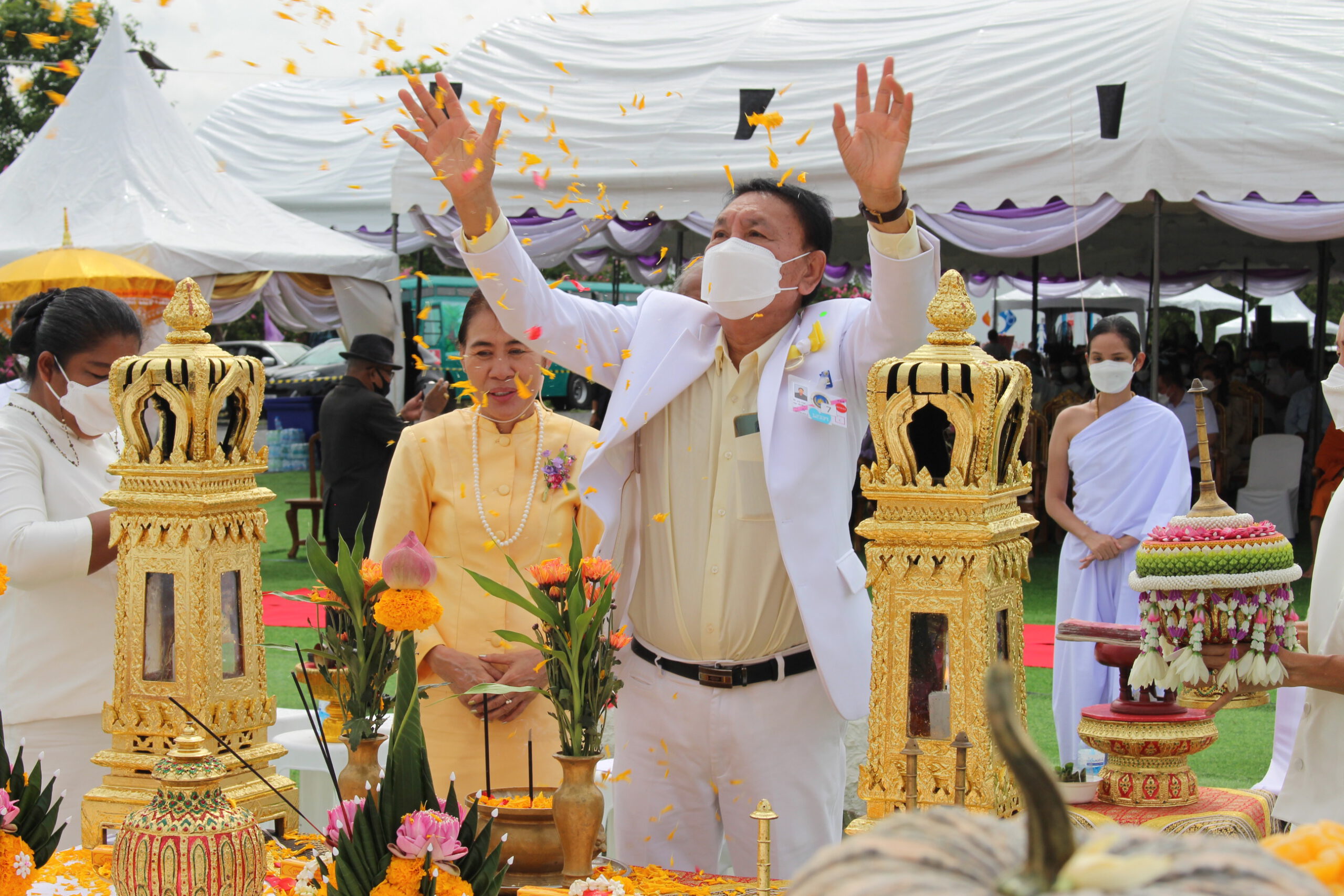 เริ่มตั้งแต่ เวลา9.๐9 น.ซึ่งเป็นพิธีบวงสรวงสิ่งศักดิ์สิทธิ์ และเป็นพิธีสงฆ์เจริญพุทธมนตร์ โดยมีพระครูมงคลธรรมโสภณ (หลวงปู่โทน) สิริมังคโร วัดแจ้งประจันตคาม จังหวัดปราจีนบุรี เป็นประธานฝ่ายสงฆ์ ต่อมาเมื่อเวลา 10.๐9 เป็นมงคลฤกษ์ นายชวน หลีกภัย ประธานในพิธี ประกอบพิธีเสาเอก จำนวน 4 พระองค์ จากนั้นท่านประธานในพิธี ได้มอบใบประกาศเกียรติคุณผู้สนับสนุนโครงการฯ จำนวน 25 ท่าน แล้วเดินทางกลับ