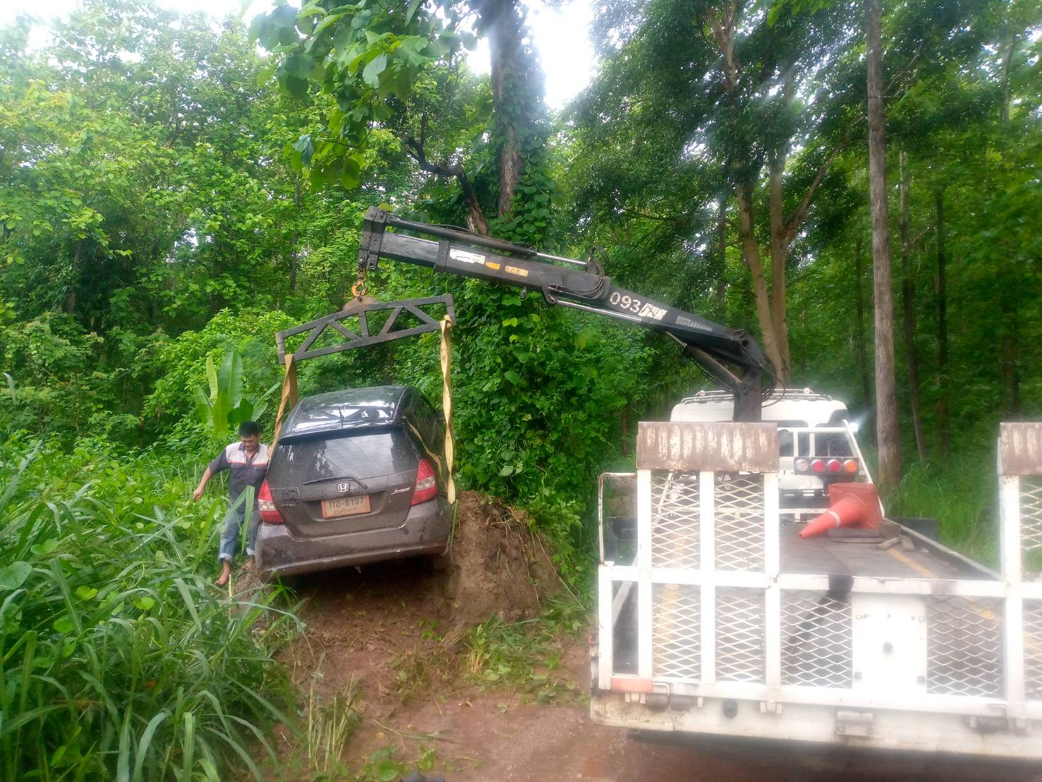 กาญจนบุรี หนุ่มชะแล ซิ่งเก๋งแจ๊สดำ ขนต่างด้าวหนีการจับกุมมกลางดึก สุดท้ายไม่รอดรถเสียหลักลงข้างทางเกยกองดิน พบแรงงานบาดเจ็บถึงสลบ 8 ราย สารภาพจ่ายค่าหัว 28,000 บาท หวังไปทำงาน จังหวัดชั้นใน