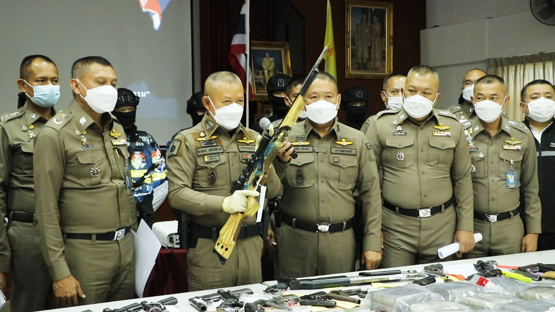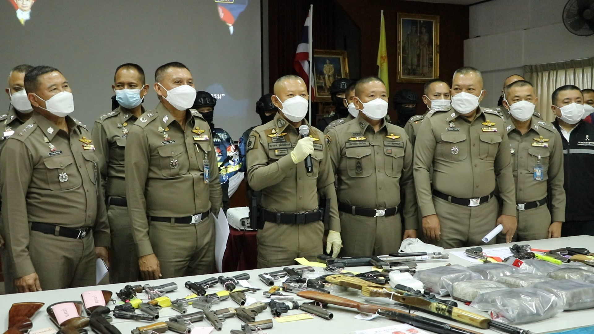 ที่ จ.สุพรรณบุรี พล.ต.ท.ธนายุตม์ วุฒิจรัสธำรง ผู้บัญชาการตำรวจภูธรภาค 7 พล.ต.ต.บุญฤทธิ์ รอดมา รองผู้บัญชาการตำรวจภูธรภาค 7 พล.ต.ต.เกรียงไกร วุฒิพานิช ผู้บังคับการตำรวจภูธรจังหวัดสุพรรณบุรี พร้อมผู้บังคับการตำรวจภูธรจังหวัดสุพรรณบุรี และผู้กำกับทั้ง 16 โรงพัก แถลงข่าวผลการกวาดล้างอาชญากรรมของตำรวจภูธรจังหวัดสุพรรณบุรี