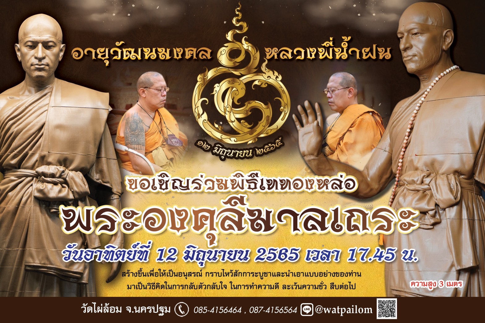 วัดไผ่ล้อม เชิญศิษยานุศิษย์ พุทธศาสนิกชน ร่วมพิธีเททองหล่อพระองคุลีมาลเถระ เนื่องในโอกาสอายุวัฒนะมงคล หลวงพี่น้ำฝน 50 ปี เพื่อเป็นอนุสรณ์ให้เป็นแบบอย่างสำหรับนำมาเป็นหลักสำหรับชีวิตในการกลับตัวกลับใจ ประพฤติตัวเป็นคนดี เลิกข้อเกี่บวกับสิ่งไม่ดีทั้งปวง วันอาทิตย์ ที่ 12 มิถุนายน 65 เวลา 17.45 น. นี้