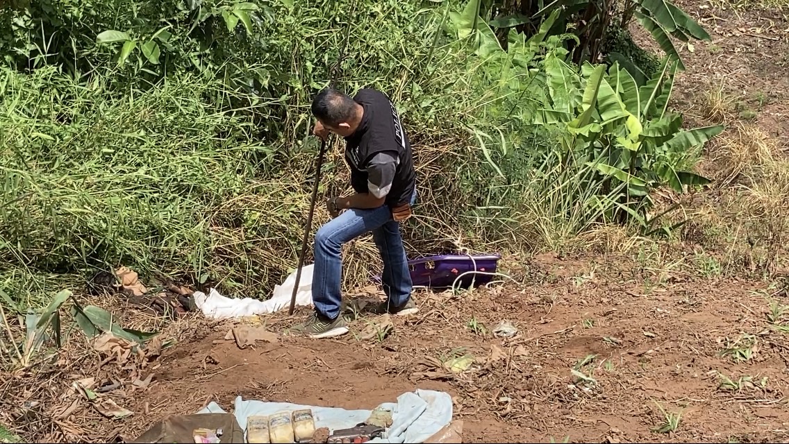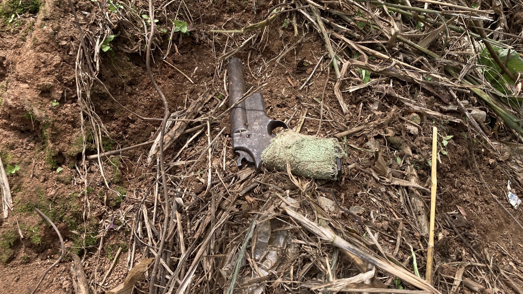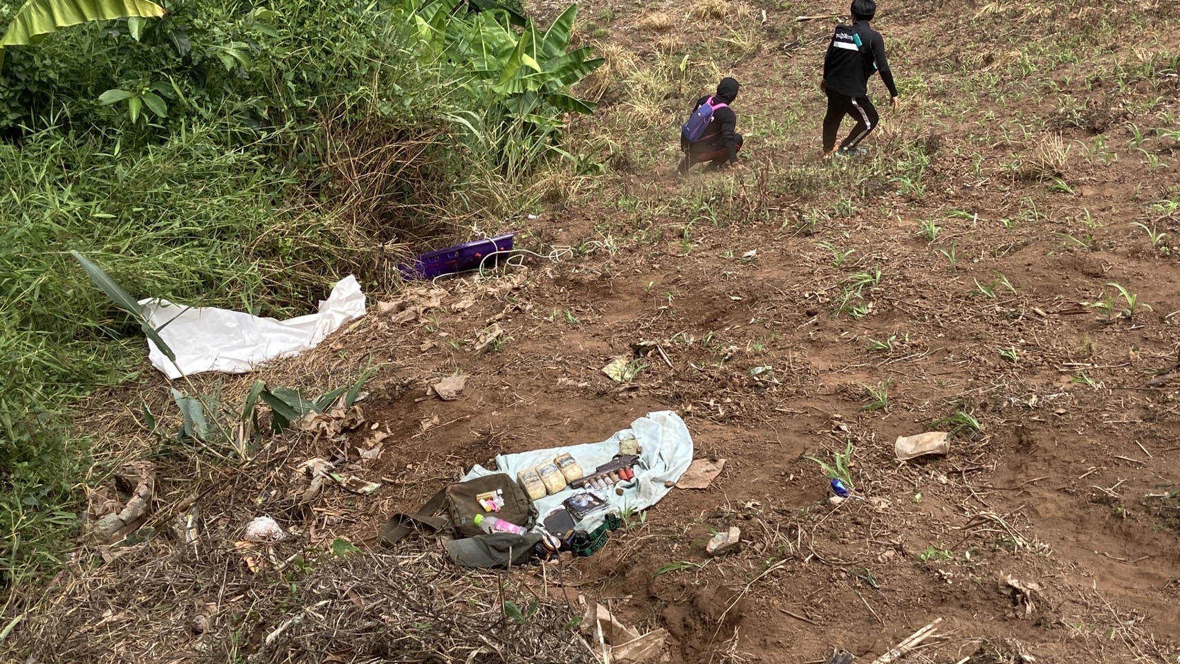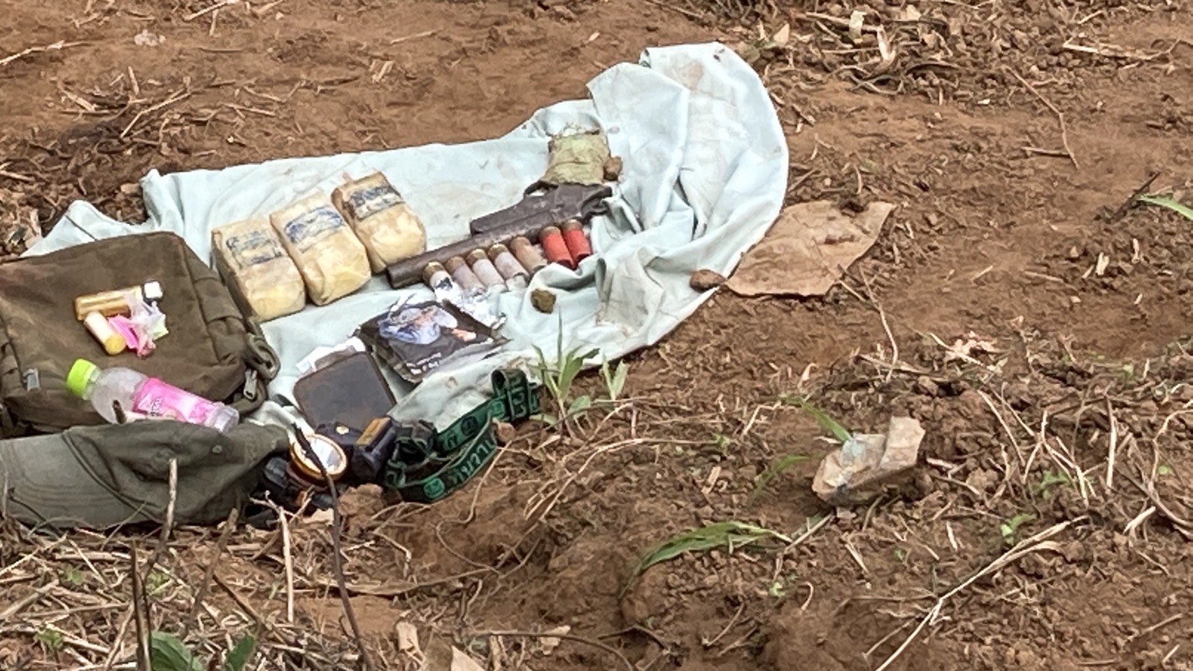 ปืนลูกซองสั้นไทยประดิษฐ์ พร้อมปลอกกระสุนคาอยู่ในลำเพลิง จำนวน 1กระบอก กระสุนปืนลูกซอง จำนวน นัด โทรศัพท์มือถือ จำนวน 1 เครื่อง ยาบ้า จำนวน 6,000เม็ด อยู่ในกระเป๋าสะพายข้างสีเขียวตกอยู่ข้างลำตัว และยาบ้า 7 เม็ด ซุกซ่อนอยู่ในกระเป๋าเสื้อที่สวมใส่อยู่ เฮโรอีน บรรจุในหลอดพลาสติก จำนวน 1หลอด และบรรจุในหลอดกาแฟ จำนวน 3หลอด อยู่ในถุงยาเส้นซุกซ่อนอยู่ในกระเป๋าเสื้อที่สวมใส่อยู่ และอุปกรณ์เสพจำนวน 1ชุด มีดยาว ขนาด 1ฟุต คาดอยู่ข้างลำตัว