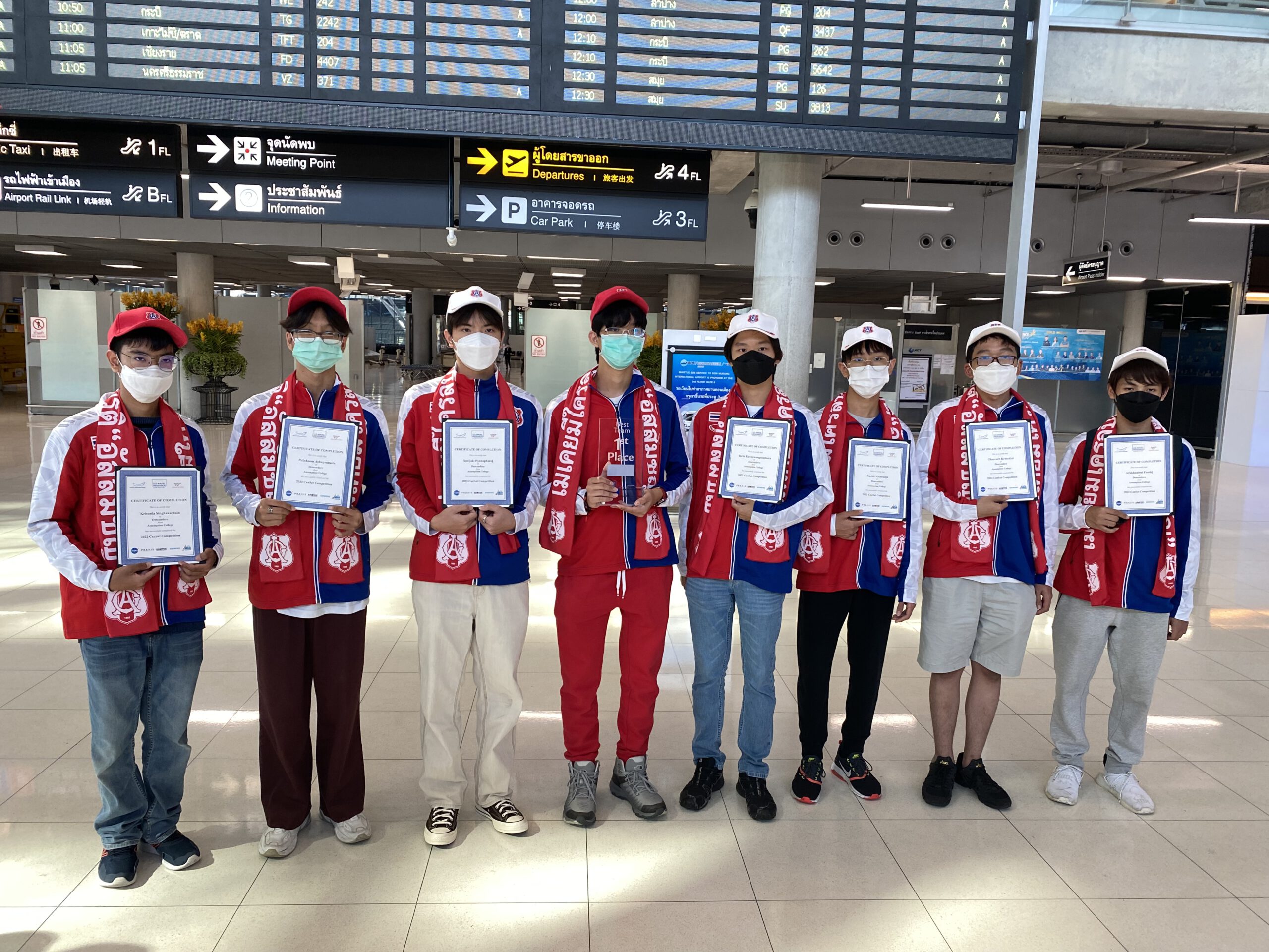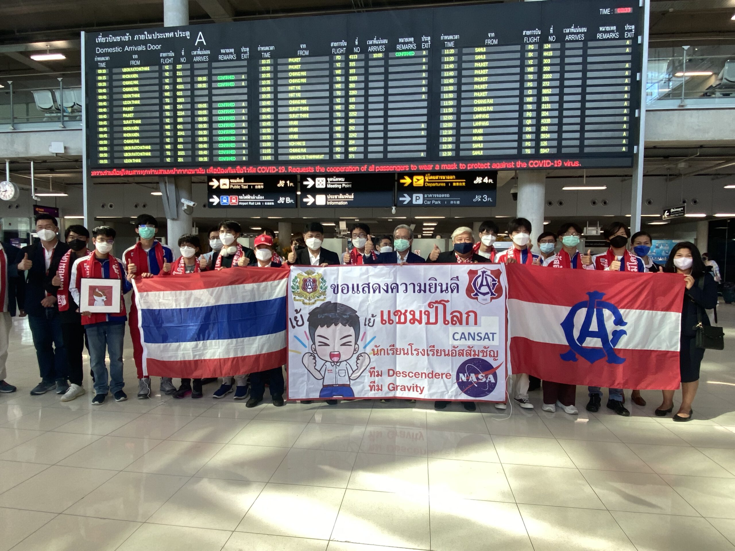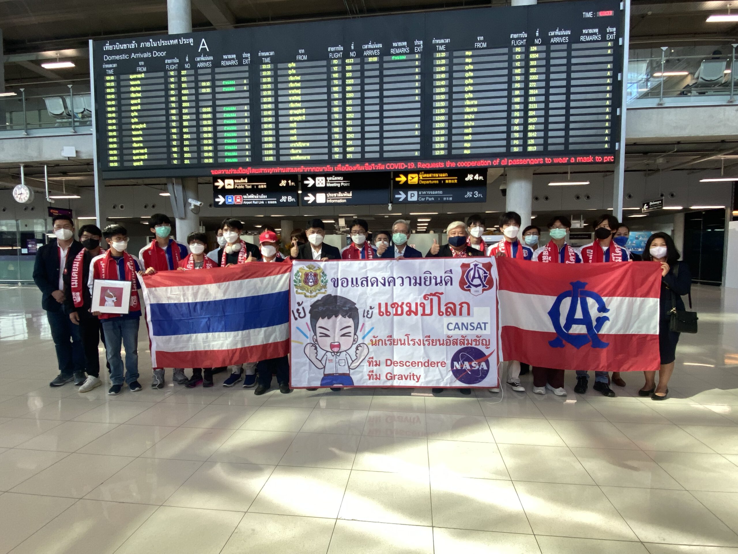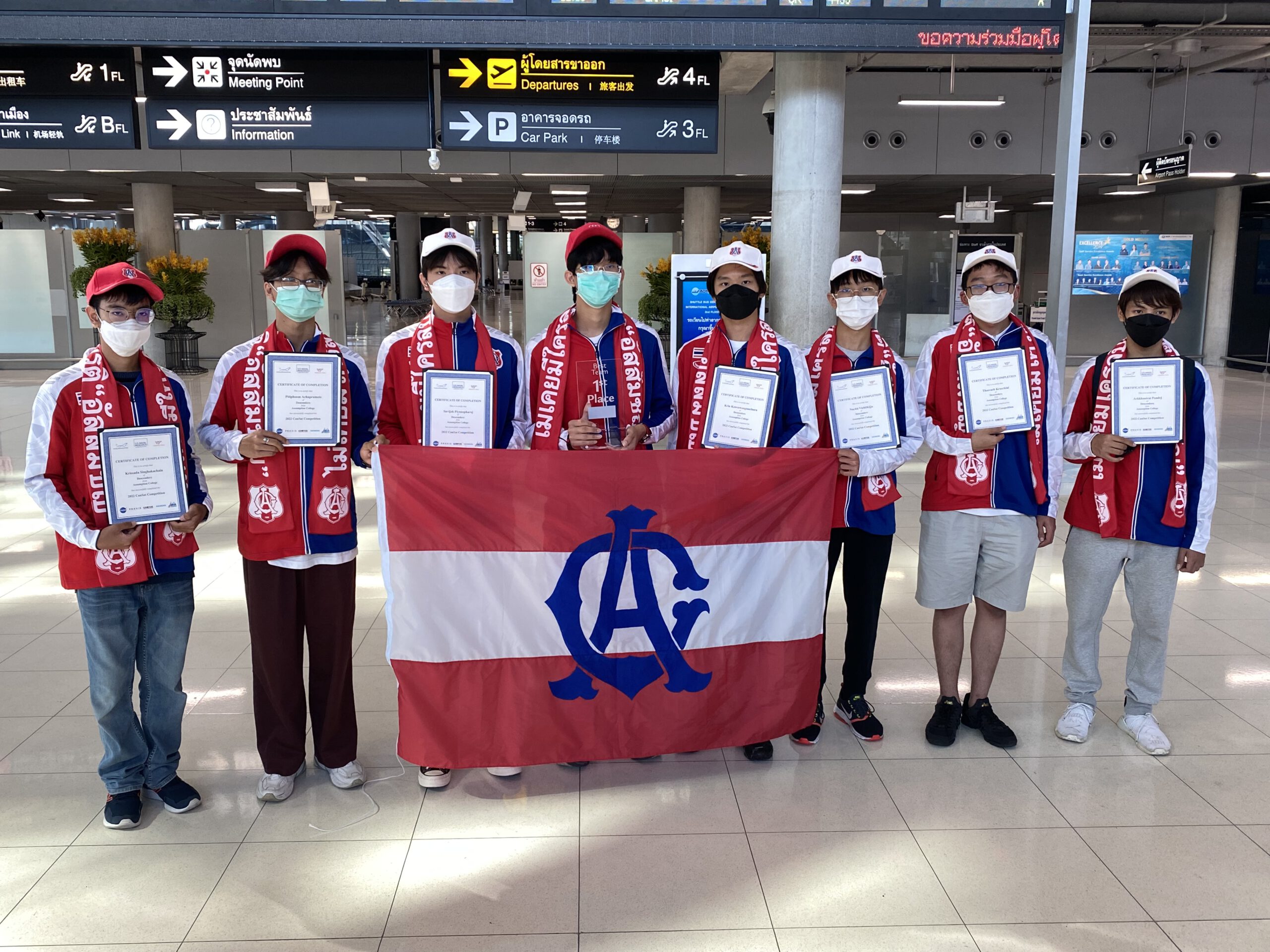 *****เมื่อเวลา 8.30น.วันที่ 19 มิ.ย.2565 ภราดา ดร.อาวุธ ศิลาเกษ ผู้อำนวยการโรงเรียนอัสสัมชัญ กรุงเทพ พลเรือเอก ประพฤติพร อักษรมัต นายกสมาคมอัสสัมชัญ ดร.ธะนาชัย ธีรพัฒนวงศ์ นายกสมาพันธ์สมาคมศิษย์เก่าคณะเซนต์คาเบรียลแห่งประเทศไทย พร้อมคณะ รวมทั้งผู้ปกครอง ร่วมกันต้อนรับ คณะนักเรียนมัธยมไทย จากโรงเรียนอัสสัมชัญ กรุงเทพ เดินทางกลับถึงประเทศไทย สนามบินสุวรรณภูมิ โดยสายการบินกาตาร์แอร์เวย์ เที่ยวบิน QR 830 เครื่องลงเวลา 7.05 น.หลังจากคว้าแชมป์โลก สร้างดาวเทียมจำลอง อันดับที่ 1 และ อันดับที่ 7 ที่สหรัฐอเมริกา ในการแข่งขัน Annual CANSAT Competition 2022 เป็นการแข่งขันสร้างดาวเทียมจำลองที่มีขนาดเล็กจิ๋วเท่ากระป๋องเครื่องดื่ม หรือ ที่เรียกว่า “CANSAT” จาก จำนวนผู้เข้าร่วมในรอบสุดท้าย 23 ทีม 11 ประเทศ 4 ทวีป ทั่วโลก ณ สถาบันโพลีเทคนิค และ มหาวิทยาลัยรัฐเวอร์จิเนีย เมืองแบล็กส์เบิร์ก รัฐเวอร์จิเนีย ประเทศสหรัฐอเมริกา เมื่อ 12 มิถุนายน 2565