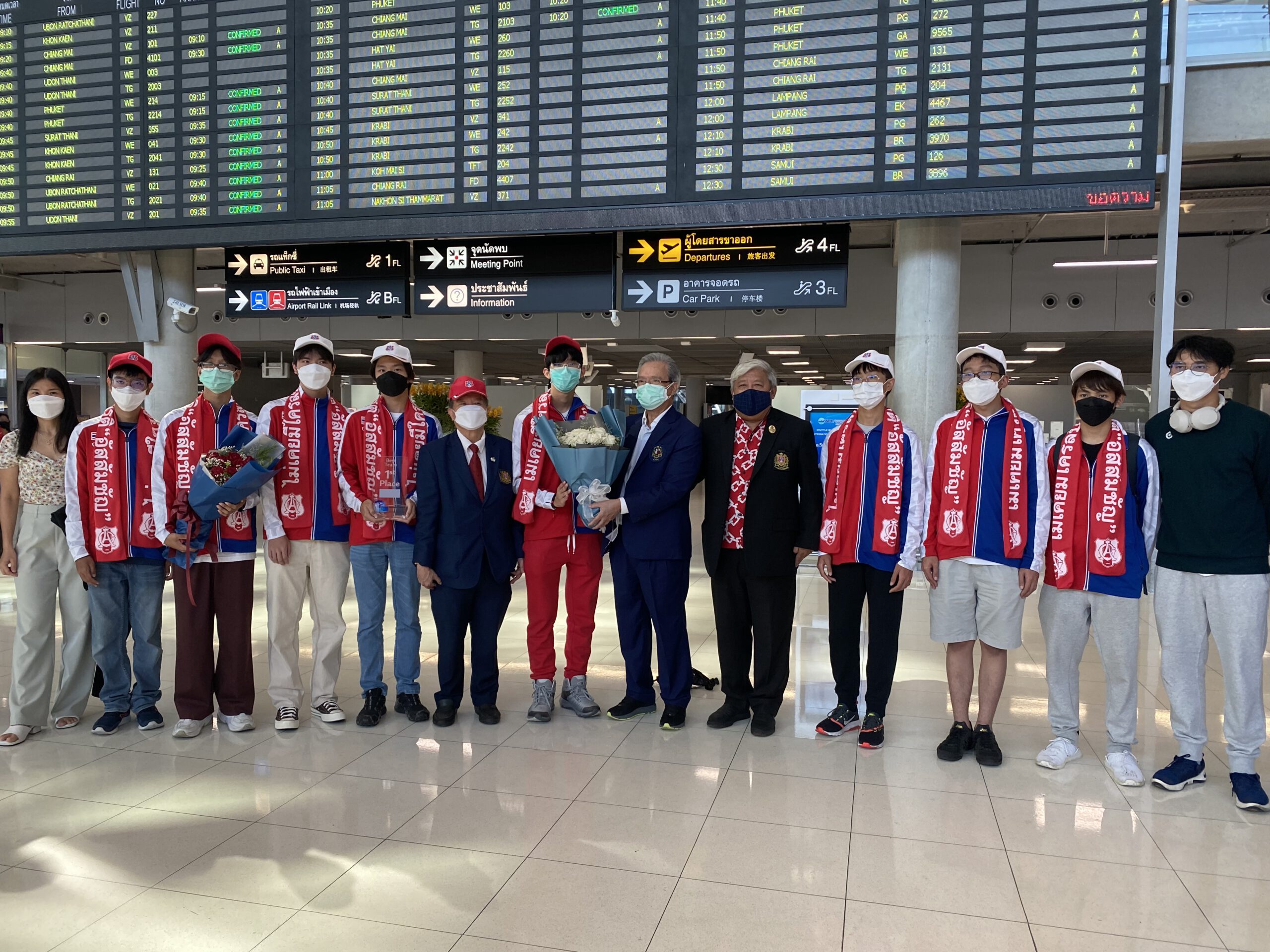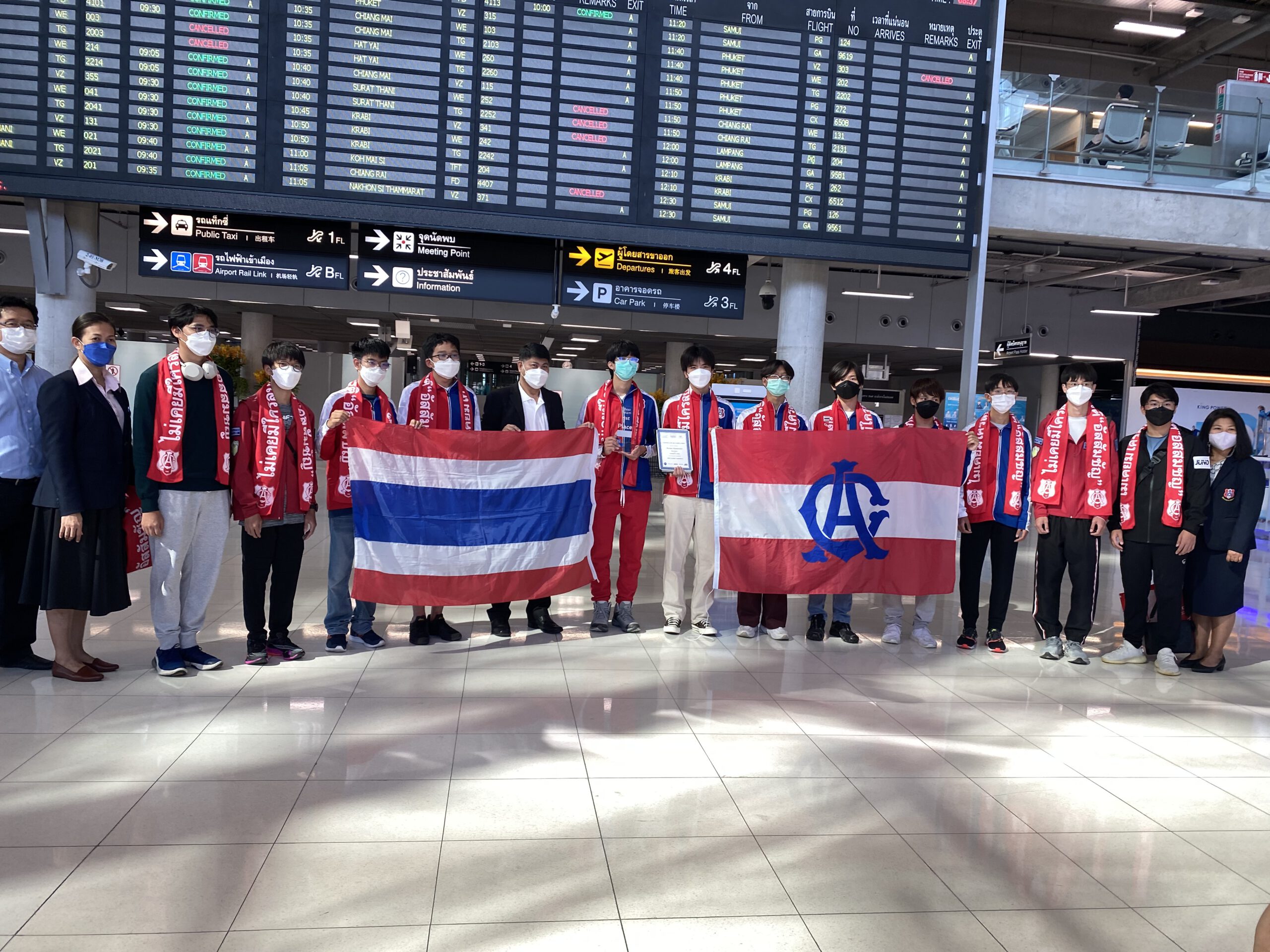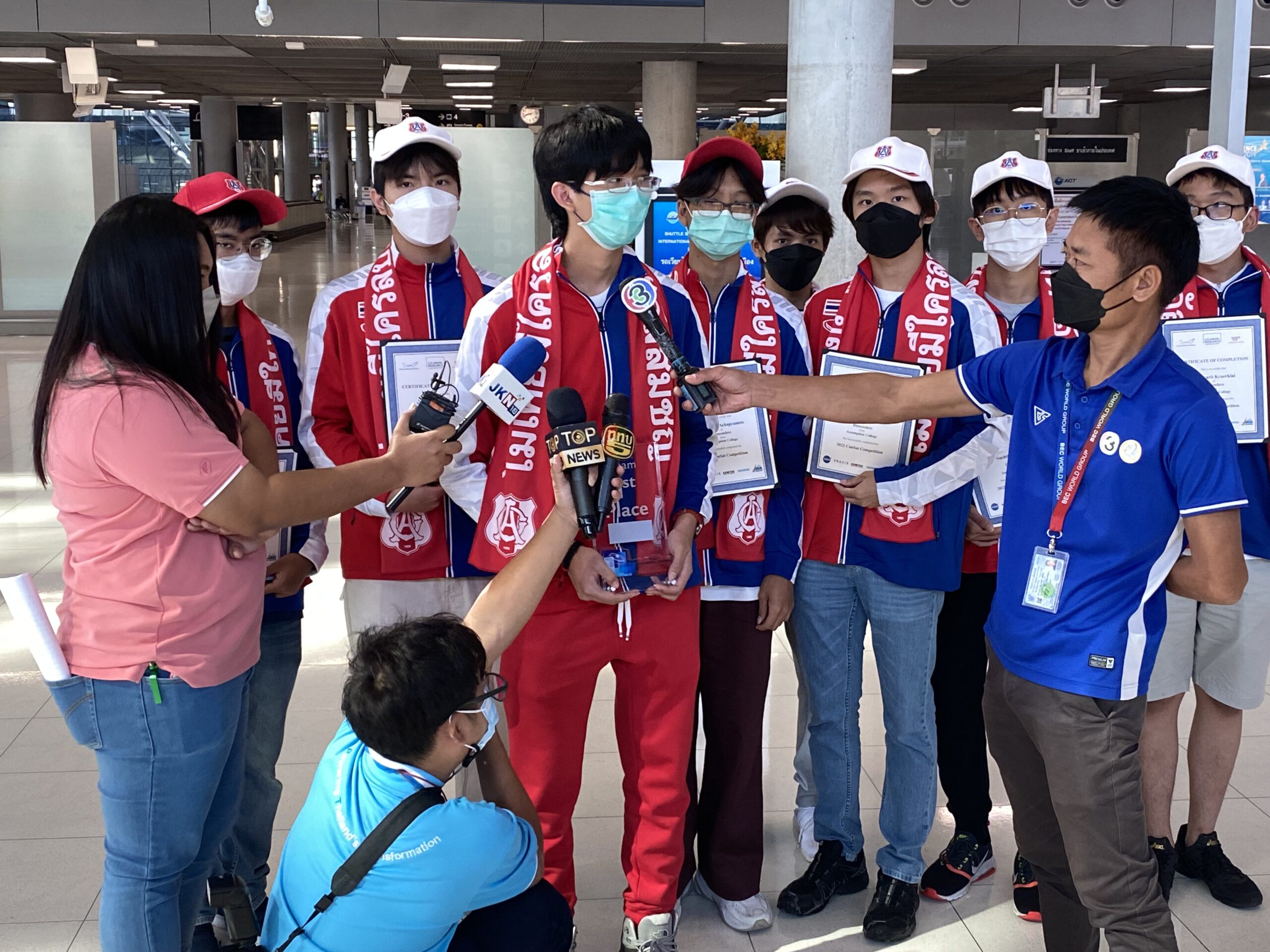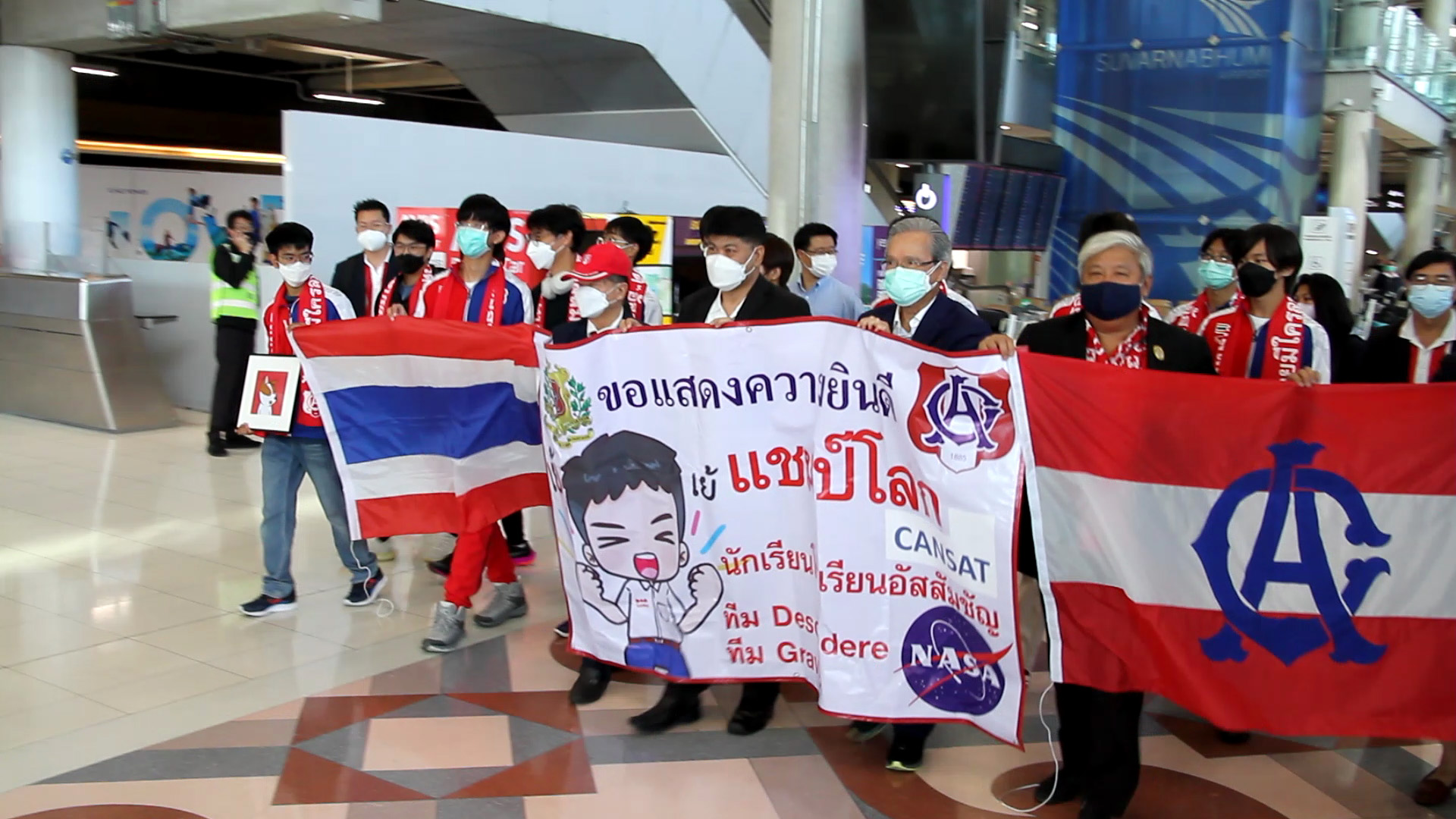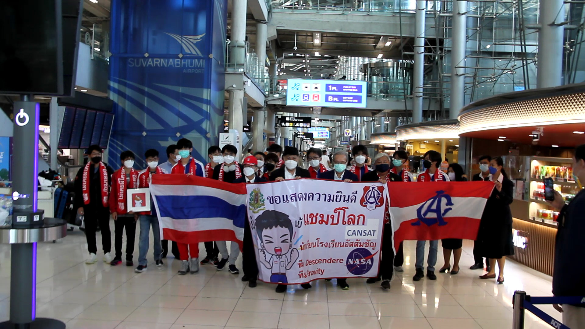 *****เมื่อเวลา 8.30น.วันที่ 19 มิ.ย.2565 ภราดา ดร.อาวุธ ศิลาเกษ ผู้อำนวยการโรงเรียนอัสสัมชัญ กรุงเทพ พลเรือเอก ประพฤติพร อักษรมัต นายกสมาคมอัสสัมชัญ ดร.ธะนาชัย ธีรพัฒนวงศ์ นายกสมาพันธ์สมาคมศิษย์เก่าคณะเซนต์คาเบรียลแห่งประเทศไทย พร้อมคณะ รวมทั้งผู้ปกครอง ร่วมกันต้อนรับ คณะนักเรียนมัธยมไทย จากโรงเรียนอัสสัมชัญ กรุงเทพ เดินทางกลับถึงประเทศไทย สนามบินสุวรรณภูมิ โดยสายการบินกาตาร์แอร์เวย์ เที่ยวบิน QR 830 เครื่องลงเวลา 7.05 น.หลังจากคว้าแชมป์โลก สร้างดาวเทียมจำลอง อันดับที่ 1 และ อันดับที่ 7 ที่สหรัฐอเมริกา ในการแข่งขัน Annual CANSAT Competition 2022 เป็นการแข่งขันสร้างดาวเทียมจำลองที่มีขนาดเล็กจิ๋วเท่ากระป๋องเครื่องดื่ม หรือ ที่เรียกว่า “CANSAT” จาก จำนวนผู้เข้าร่วมในรอบสุดท้าย 23 ทีม 11 ประเทศ 4 ทวีป ทั่วโลก ณ สถาบันโพลีเทคนิค และ มหาวิทยาลัยรัฐเวอร์จิเนีย เมืองแบล็กส์เบิร์ก รัฐเวอร์จิเนีย ประเทศสหรัฐอเมริกา เมื่อ 12 มิถุนายน 2565