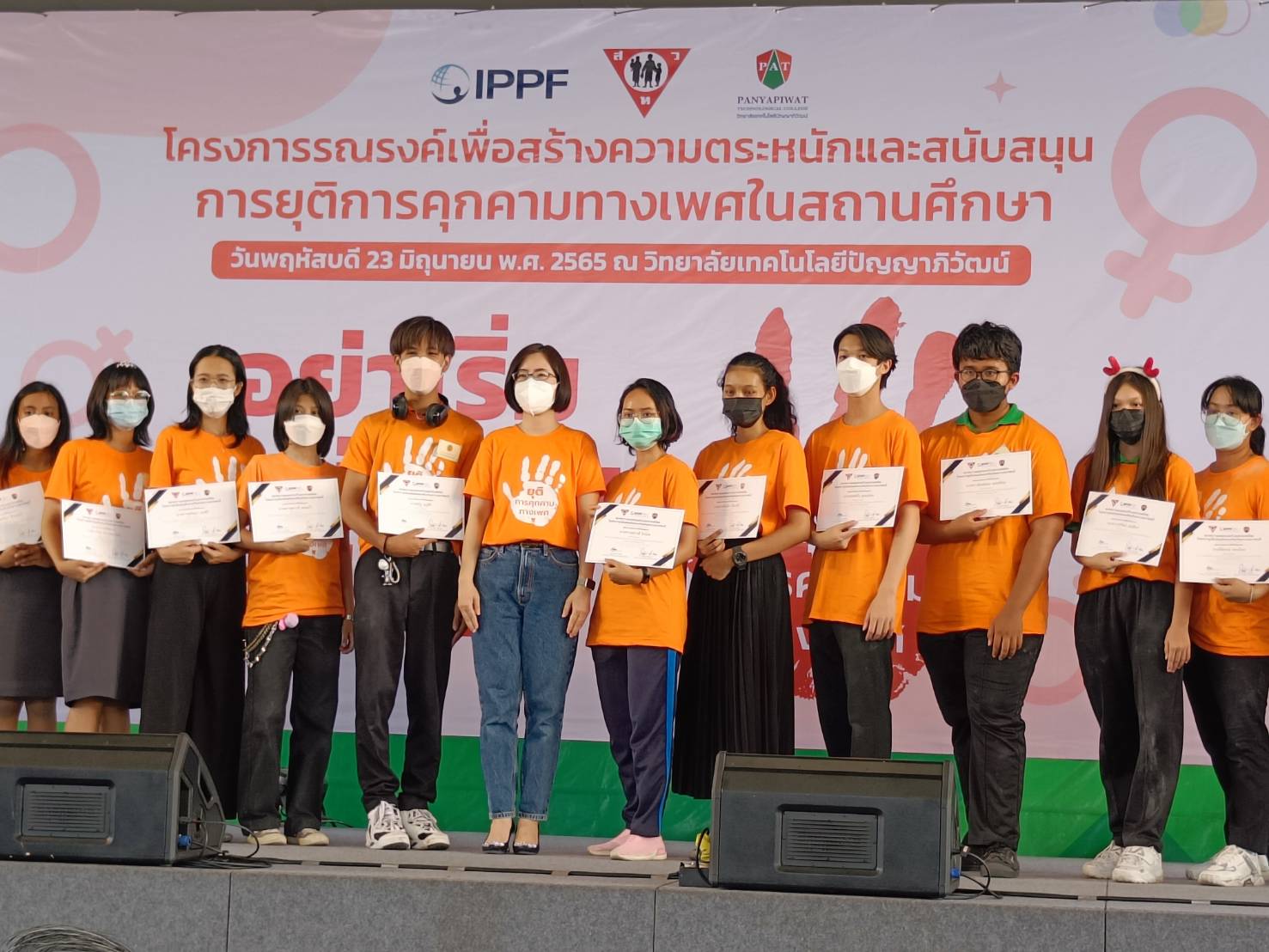 โดยมีนายสมเจตน์ ศรีกนก ผู้อำนวยการสมาคมวางแผนครอบครัวแห่งประเทศไทย,คุณลัดดา จิตรวัฒนแพทย์ ผู้จัดการโครงการฯ และนายวิเชียร เนียมน้อม ผู้แทนผู้รับใบอนุญาตและผู้อำนวยการวิทยาลัยเทคโนโลยีปัญญาภิวัฒน์ ร่วมในพิธี พร้อมร่วมรับฟังการเสวนา ” อย่ายอม อย่าเริ่ม อย่าทน ” เพื่อให้นักเรียน นักศึกษา ได้ตระหนักถึงภัยอันตรายจากการคุกคามทางเพศ