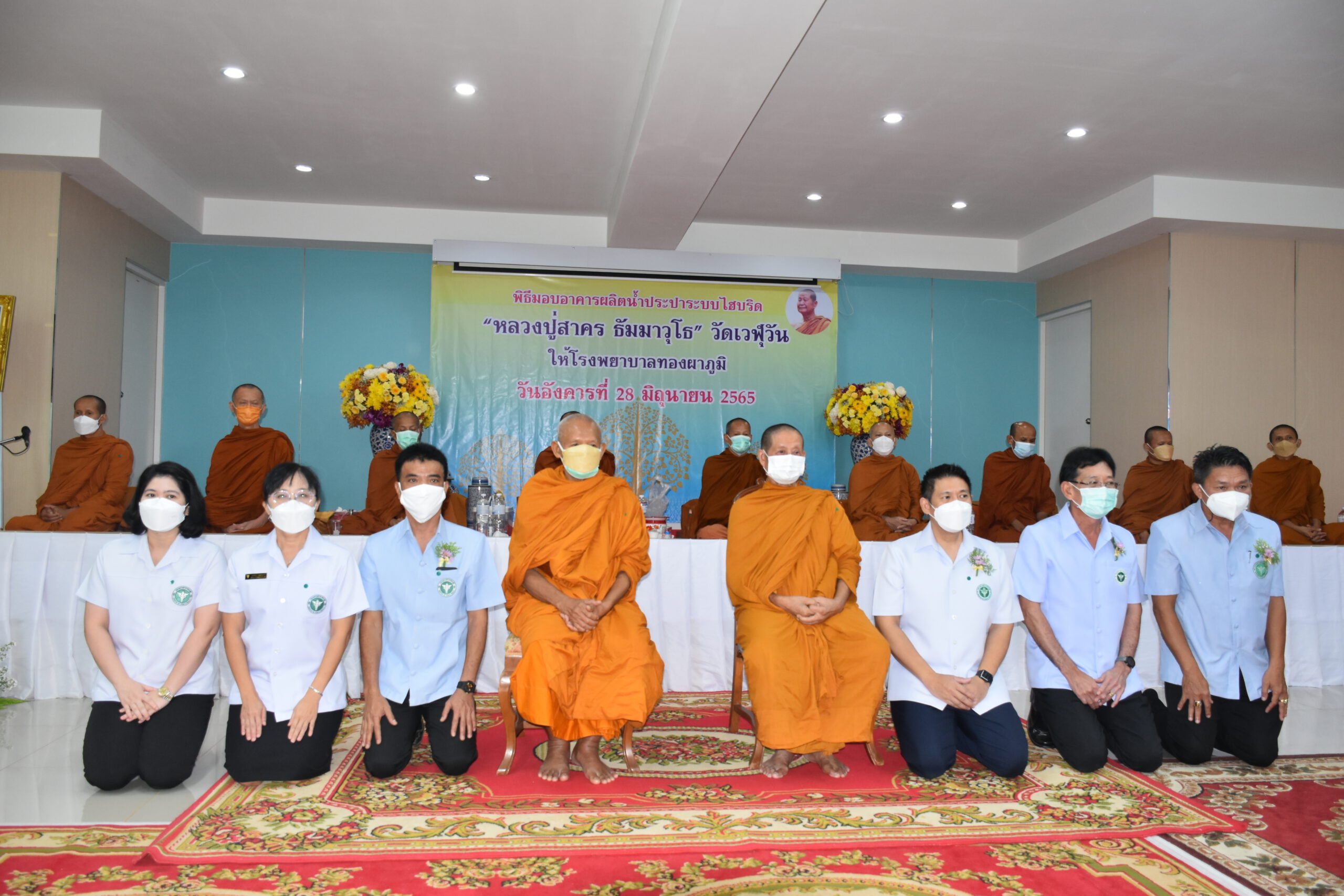 จากการขยายบริการ พบว่าปริมาณการใช้น้ำประปาเพิ่มขึ้น ตามสัดส่วนของจำนวนผู้รับบริการและจำนวนเจ้าหน้าที่ที่เพิ่มขึ้น ส่งผลให้บางช่วงเวลาปริมาณน้ำไม่เพียงพอในการให้บริการ หลวงปู่สาคร ธัมมาวุโธ เจ้าอาวาสวัดเวฬุวัน อ.ทองผาภูมิ มีแนวคิดจัดทำระบบน้ำให้เพียงพอกับปริมาณการใช้ของ รพ.ทองผาภูมิ ก่อสร้างอาคารระบบผลิตน้ำประปาระบบไฮบริด กำลังการผลิต 40 ลูกบาศก์เมตรต่อชั่วโมง ประกอบด้วยอาคารถังน้ำใส โรงกรองน้ำ หอถังสูง งบประมาณทั้งสิ้น 10,138,000 บาท เริ่มดำเนินการก่อสร้างตั้งแต่เดือนพฤศจิกายน 2564จนแล้วเสร็จ จึงทำพิธีมอบอาคารผลิตน้ำประปาระบบไฮบริด “หลวงปู่สาคร ธัมมาวุโธ”ให้กับ รพ.ทองผาภูมิ เพื่อนำอาคารนี้ใช้ประโยชน์แก่ประชาชนในพื้นที่ อ.ทองผาภูมิและอ.ใกล้เคียงต่อไป
