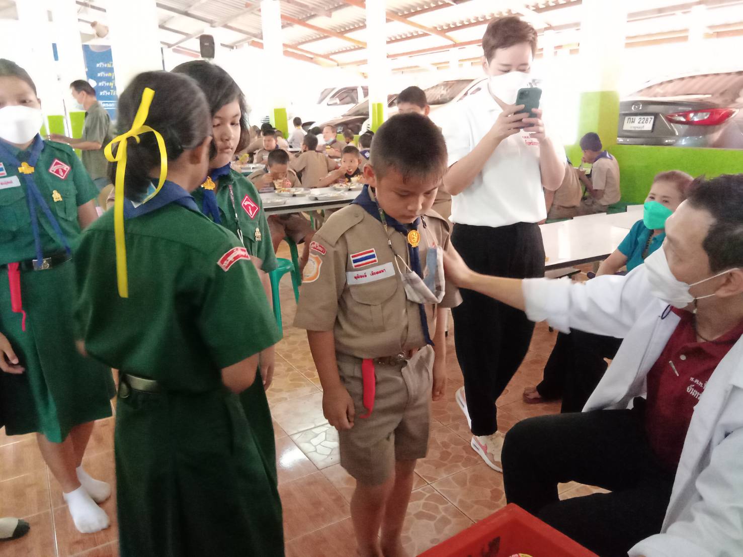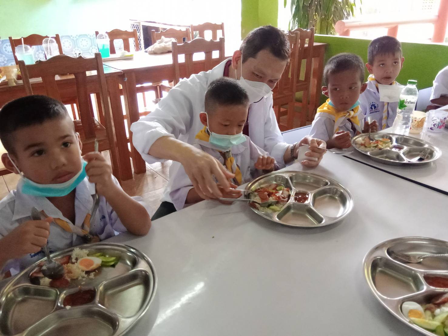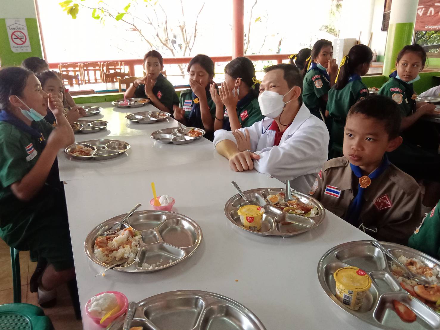 ต่อจากนั้น พ.ต.ท.กิตติพิชญ์ จันทร์สมบูรณ์ (รองเด่น) ว่าที่ผู้สมัครสมาชิกสภาผู้แทนราษฎรจังหวัดกาญจนบุรี เขต 5 พร้อมด้วย นางจุฑาทิพย์ จันทร์สมบูรณ์ และ นายจรัญ รุ่งมณี นายกสมาคมสื่อท้องถิ่นไทยและคณะได้นำอาหารซึ่งเป็นข้าวหมูแดง ผลไม้ ไอศครีม ขนมต่างๆที่ได้จัดเตรียมมานำมาตั้งและวางไว้บนโต๊ะที่ทางโรงเรียนได้จัดเตรียมไว้ให้ และเมื่อถึงเวลาพักเที่ยงคณะน้องๆนักเรียนเริ่มทยอยกันเดินทางเข้ามารับถาดข้าวหมูแดงจากทางคณะของ พ.ต.ท.กิตติพิชญ์ จันทร์สมบูรณ์(รองเด่น)ว่าทึ่ผู้สมัคร ส.ส.จ.กาญจนบุรี เขต 5 และ คณะของนายจรัญ โดยทาง ดร.ชนะชัย แจ้งสว่าง ผู้อำนวยการโรงเรียนพุทธวิมุติวิทยา ได้ปล่อยให้นักเรียนน้องๆนักเรียนชั้นอนุบาลเดินทางเข้ามารับข้าวหมูแดงเป็นชุดแรกจนถึงชั้นมัธยมศึกษาชั้นปีที่ 3 ตามลำดับชั้นอย่างเป็นระเบียบ