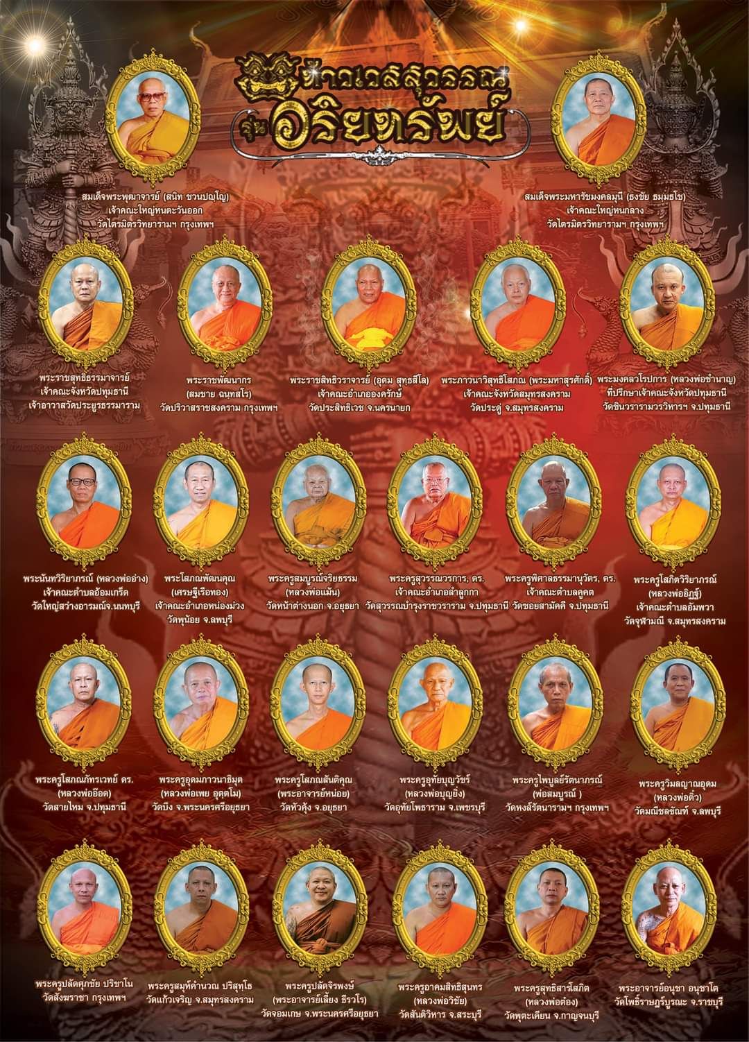 โดยมี พระเกจิภาวนาจารย์ดังแห่งยุค มาร่วม นั่งอฐิษฐานจิตปลุกเสกวัตถุมงคล อาทิ พระราชสุทธิธรรมาจารย์ เจ้าคณะจังหวัดปทุมธานี เจ้าอาวาสวัดประยูรธรรมาราม พระราชสิทธิวราจารย์ (อุดม สุทฺธสีโล) เจ้าคณะอำเภอองครักษ์ วัดประสิทธิเวช จ.นครนายก พระภาวนาวิสุทธิโสภณ (พระมหาสุรศักดิ์) เจ้าคณะจังหวัดสมุทรสงครามวัดประดู่ จ.สมุทรสงคราม พระมงคลวโรปการ (หลวงพ่อชํานาญ) ที่ปรึกษาเจ้าคณะจังหวัดปทุมธานี วัดชินวรารามวรวิหารฯ จ.ปทุมธานี พระโสภณพัฒนคุณ (เศรษฐีเรือทอง) เจ้าคณะอำเภอหนองม่วง วัดพุน้อย จ.ลพบุรีพระครูโสภิตวิริยาภรณ์ (หลวงพ่ออิฏฐ์) เจ้าคณะตำบลอัมพวาวัดจุฬามณี จ.สมุทรสงคราม พระครูโสภณภัทรเวทย์ ดร.(หลวงพ่ออ๊อด) วัดสายไหม จ.ปทุมธานี พระครูอุทัยบุญวัชร์ (หลวงพ่อบุญยิ่ง)วัดอุทัยโพธาราม จ.เพชรบุรี พระครูอาคมสิทธิสุนทร (หลวงพ่อวิชัย) วัดสันติวิหาร จ.สระบุรี โดยมี นายดรณ์ สมิตะเกษตริน ปลัดจังหวัดปทุมธานี นายสมชาย ตรีณาวงษ์ นายอำเภอลำลูกกา คณะสงฆ์ ข้าราชการ ประชาชน พุทธศาสนิกชน และศิษยานุศิษย์ ผู้มีจิตศรัทธาเข้าร่วมพิธี กันอย่างคับคั่ง