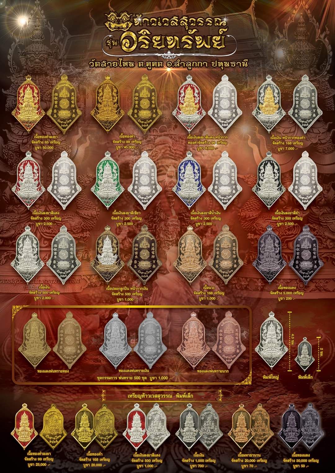 เหรียญท้าวเวสสุวรรณพิมพ์ใหญ่ เนื้อทองคำลงยา จำนวนการสร้าง 20 เหรียญ เหรียญท้าวเวสสุวรรณ เนื้อทองคำ จำนวนการสร้าง 13 เหรียญ เหรียญท้าวเวสสุวรรณ เนื้อเงินลงยาแดง หน้ากากทองคำ จำนวนการสร้าง 99 เหรียญ เหรียญท้าวเวสสุวรรณ เนื้อเงินหน้ากากทองคำ จำนวนการสร้าง 168 เหรียญ เหรียญท้าวเวสสุวรรณ เนื้อเงินลงยา แดง เขียว น้ำเงิน ดำ สีละ 300 เหรียญ เหรียญท้าวเวสสุวรรณ เนื้อเงิน จำนวนการสร้าง 500 เหรียญ เหรียญท้าวเวสสุวรรณ เนื้อปลอกลูกปืนหน้าการเงิน จำนวนการสร้าง 500 เหรียญ เหรียญท้าวเวสสุวรรณ เนื้อนวะจำนวนการสร้าง 168 เหรียญ เหรียญท้าวเวสสุวรรณ เนื้อทองแดง จำนวนการสร้าง 5,000 เหรียญ และเหรียญท้าวเวสสุวรรณ ชุดกรรมการพ่นทราย (ทองแดงพ่นทรายทอง ทองแดงพ่นทรายเงิน ทองแดงพ่นทรายนาค)จำนวนการสร้าง 150 ชุด