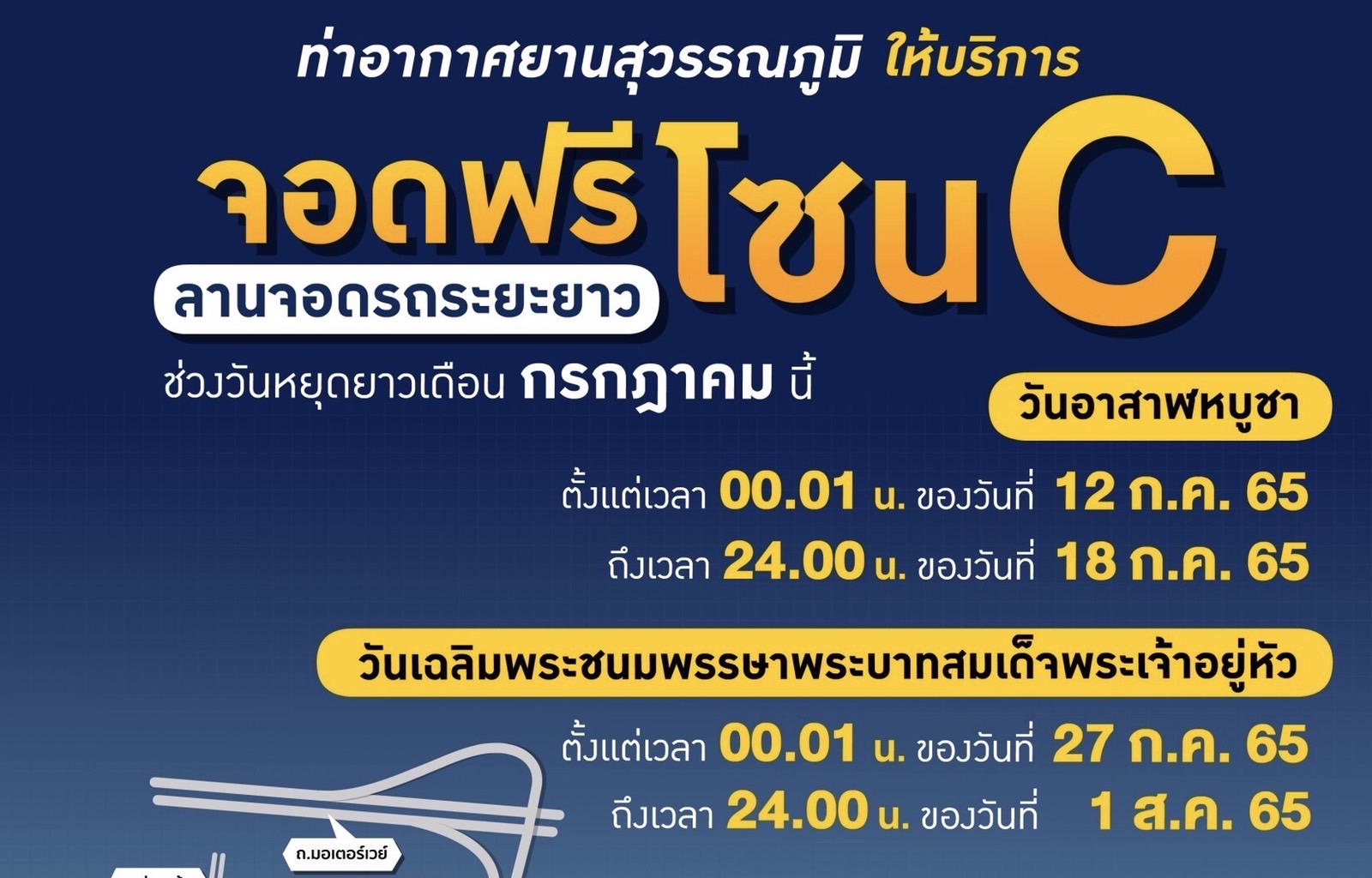 *****วันที่ 6 กรกฎาคม 2565 ท่าอากาศยานสุวรรณภูมิ (ทสภ.) ได้ทำการยกเว้นอัตราค่าบริการจอดรถยนต์ที่ลานจอดรถระยะยาว (Long Term Parking) โซน C ซึ่งสามารถจอดรถยนต์ได้จำนวน 718 คัน ในวันหยุดยาวเดือนกรกฎาคม 2 ช่วง ได้แก่ วันอาสาฬหบูชา ระหว่างวันที่ 12 – 18 กรกฎาคม 2565 ตั้งแต่เวลา 00.01 น. ของวันอังคารที่ 12 กรกฎาคม 2565 ถึงเวลา 24.00 น. ของวันจันทร์ที่ 18 กรกฎาคม 2565 รวมทั้งสิ้น 7 วัน และ วันเฉลิมพระชนมพรรษา พระบาทสมเด็จพระเจ้าอยู่หัว ระหว่างวันที่ 27 กรกฎาคม – 1 สิงหาคม 2565 ตั้งแต่เวลา 00.01 น. ของวันพุธที่ 27 กรกฎาคม 2565 ถึงเวลา 24.00 น. ของวันจันทร์ที่ 1 สิงหาคม 2565 รวมทั้งสิ้น 6 วัน