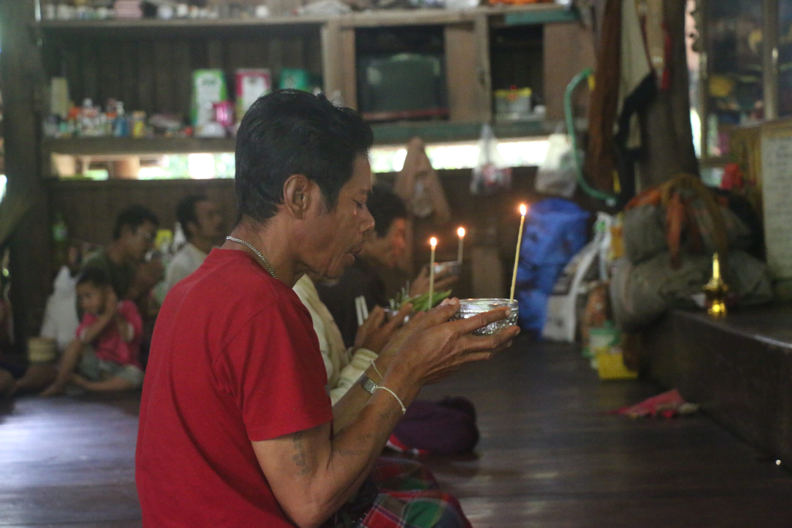 กาญจนบุรี ชาวไทยเชื้อสายกะเหรี่ยงบ้านไล่โว่เข้าวัดตักบาตรรับศีล 5 ในวันอาสาฬหบูชาขณะครูพานักเรียนตัวน้อยถวายเทียนพรรษาเพื่อสืบสานประเพณีถวายเทียนแก่พระสงฆ์เนื่องในวันเข้าพรรษา