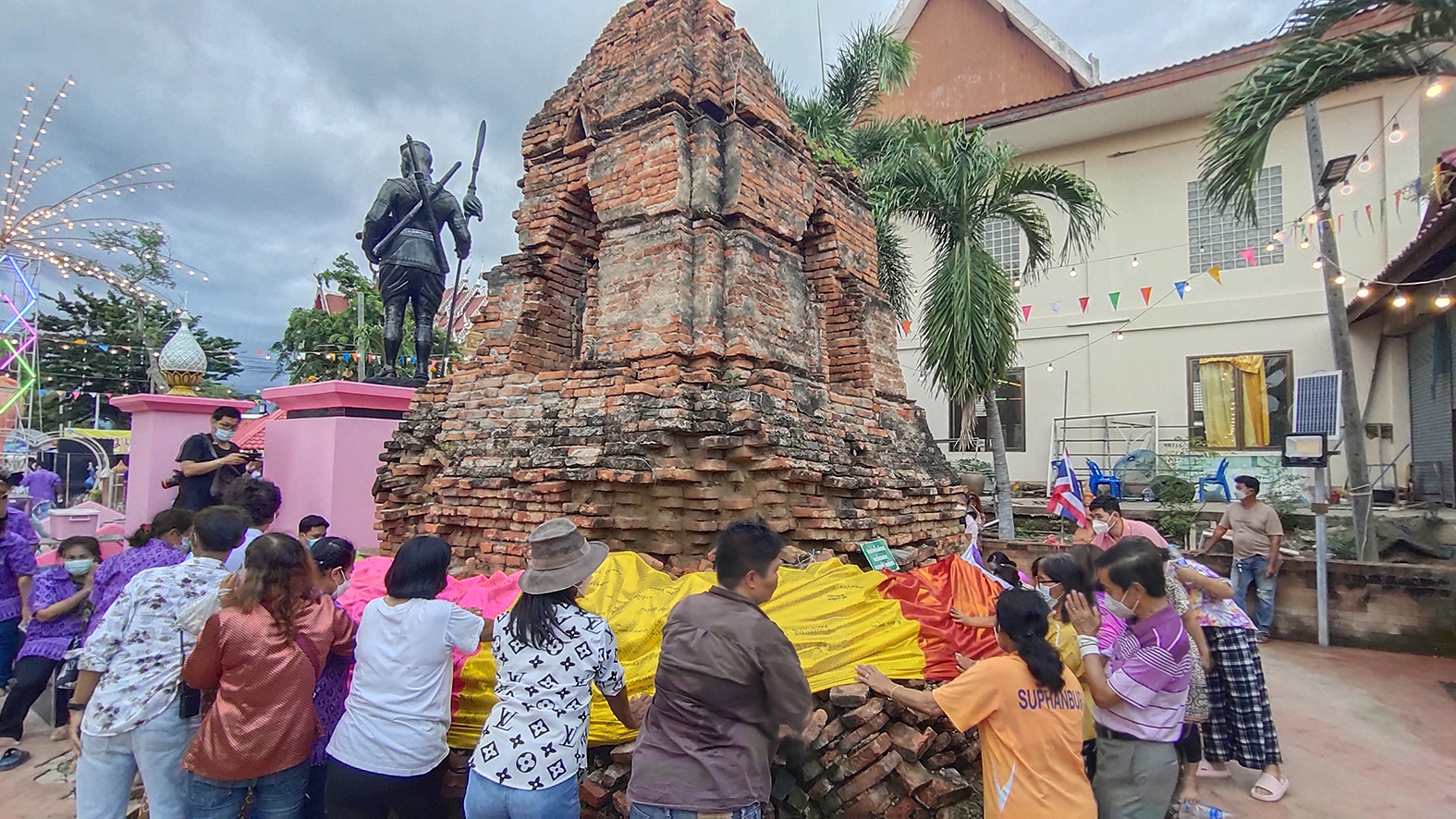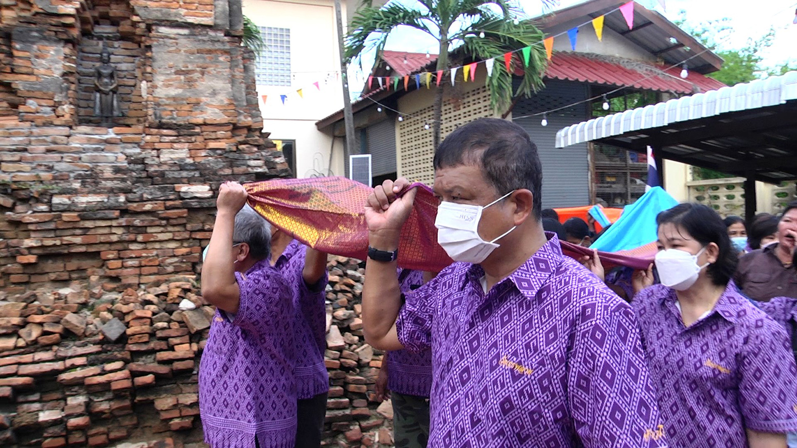 สุพรรณบุรี สืบสานประเพณีแห่ผ้า8สีห่มเจดีย์เก่าสมัยกรุงศรีอยุธยาคึกคัก