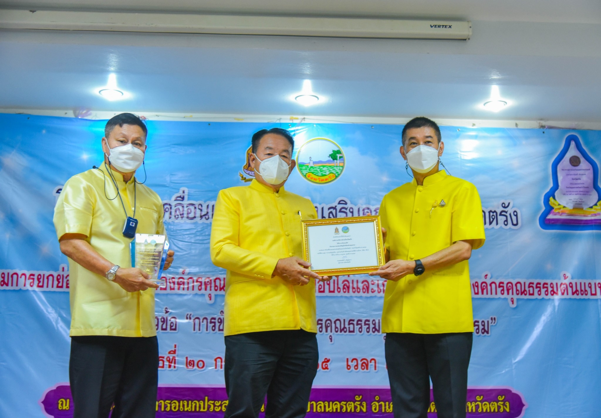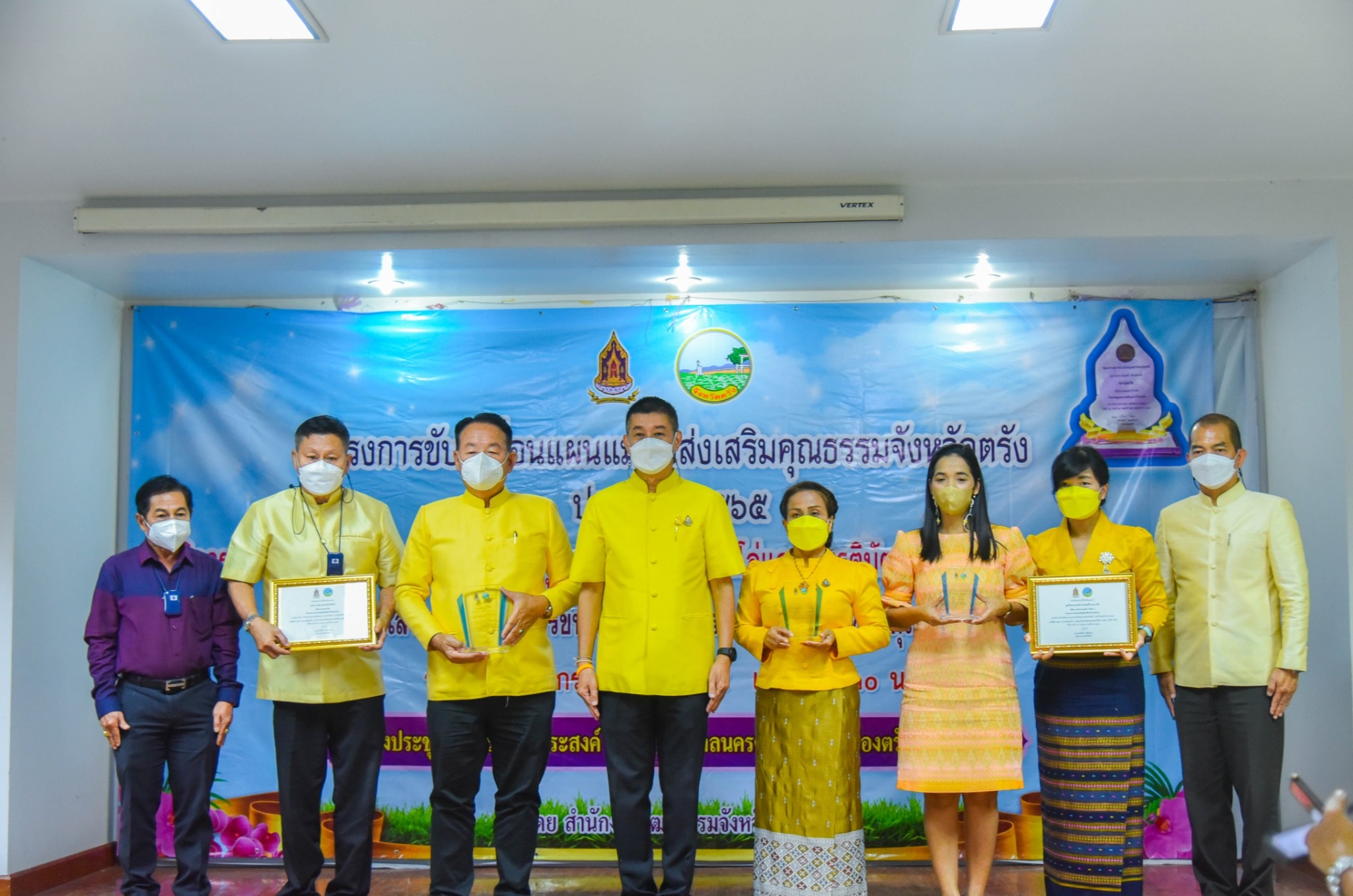 นายก อบจ.ตรัง พร้อมปลัด อบจ.ตรัง รับมอบรางวัลชนะเลิศ “องค์กรคุณธรรมต้นแบบโดดเด่น” ประจำปี 2565 โดยผ่านคัดเลือกจากคณะกรรมการพิจารณาคัดเลือกและประเมินชุมชน องค์กร และอำเภอคุณธรรมต้นแบบโดดเด่นจังหวัดตรัง ประจำปี 2565