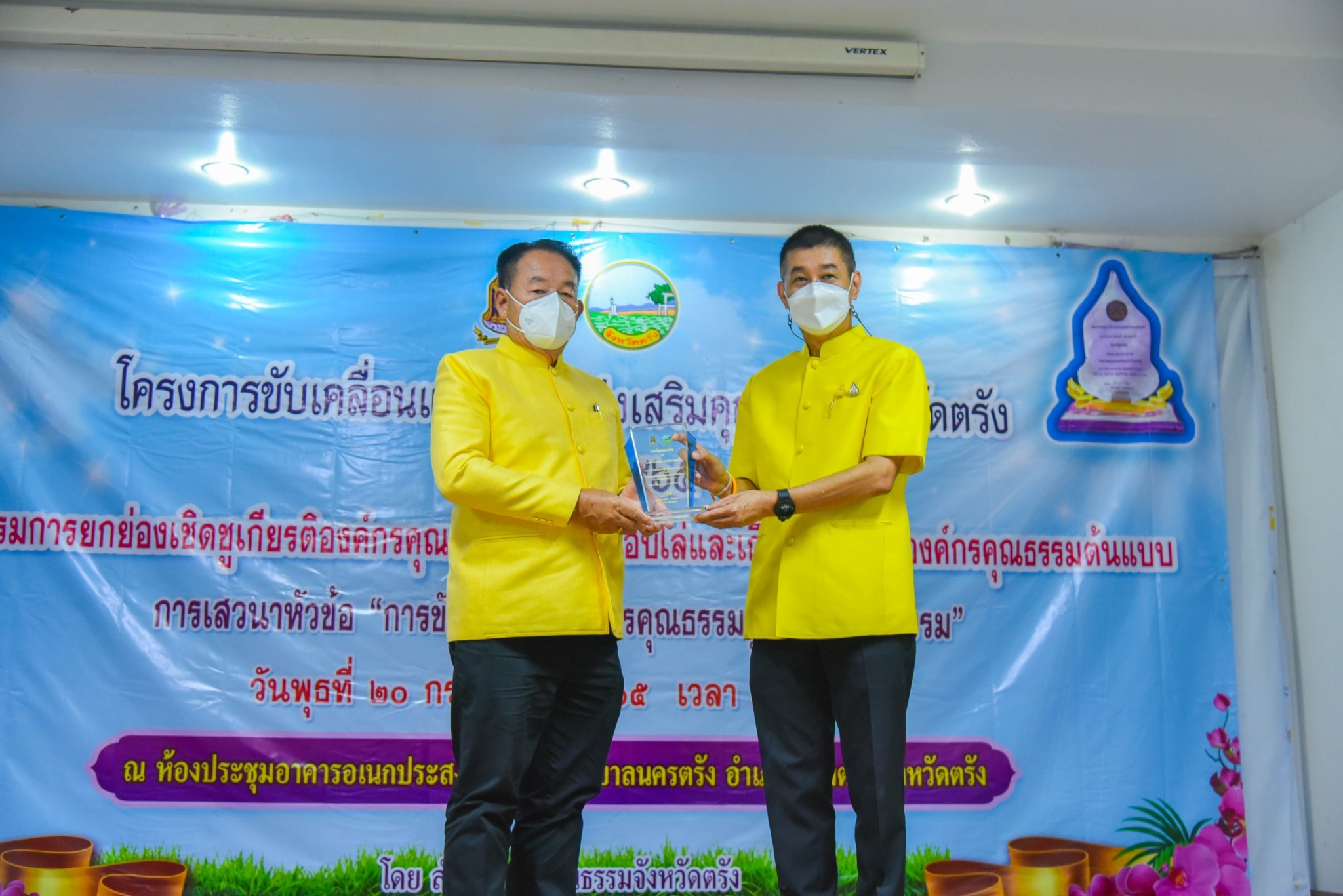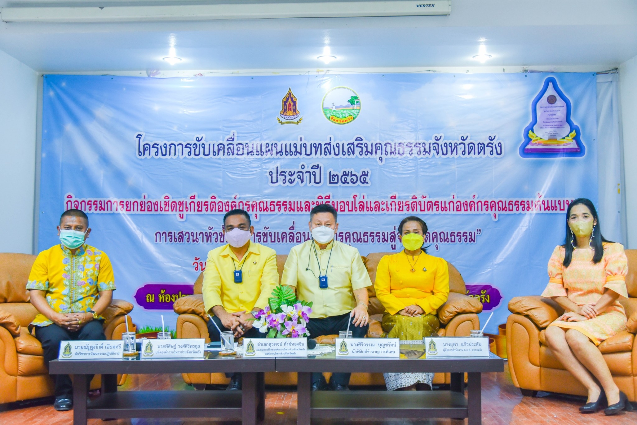 นายขจรศักดิ์ เจริญโสภา ผู้ว่าราชการจังหวัดตรัง เป็นประธานมอบ โล่รางวัลพร้อมเกียรติบัตรยกย่องเชิดชูเกียรติชุมชน องค์กร และอำเภอคุณธรรมต้นแบบโดดเด่น ประจำปี 2565 และแสดงความยินดีกับผู้ที่ได้รับรางวัลและเข้าร่วมกิจกรรม จำนวน 13 องค์กร ณ ห้องประชุมอาคารอเนกประสงค์ ชั้น 1 เทศบาลนครตรัง อำเภอเมืองตรัง ในส่วนของ อบจ.ตรัง ได้รับการประเมินและพิจารณาเป็นองค์กรคุณธรรมต้นแบบโดดเด่น มีนายบุ่นเล้ง โล่สถาพรพิพิธ นายก อบจ.ตรัง นายวิศิษฎ์ วงศ์สิริพรกุล ปลัด อบจ.ตรัง เข้ารับมอบโล่รางวัลชนะเลิศพร้อมเกียรติบัตร “องค์กรคุณธรรมต้นแบบโดดเด่น” จังหวัดตรัง ประจำปี 2565 และร่วมกิจกรรมเสวนาจังหวัดคุณธรรม หัวข้อ “การขับเคลื่อนองค์กรคุณธรรมสู่จังหวัดคุณธรรม” เพื่อรณรงค์ปลูกฝังให้ทุกภาคส่วนมีส่วนร่วมในการส่งเสริมคุณธรรม และยกย่องหน่วยงาน องค์กรที่สนับสนุนการดำเนินงานด้านการส่งเสริมคุณธรรม อีกทั้งเป็นเวทีกลางให้องค์กรเครือข่ายทุกภาคส่วนได้แลกเปลี่ยนเรียนรู้การขับเคลื่อนและพัฒนาคุณธรรมจริยธรรมในระดับองค์กรต่อไป