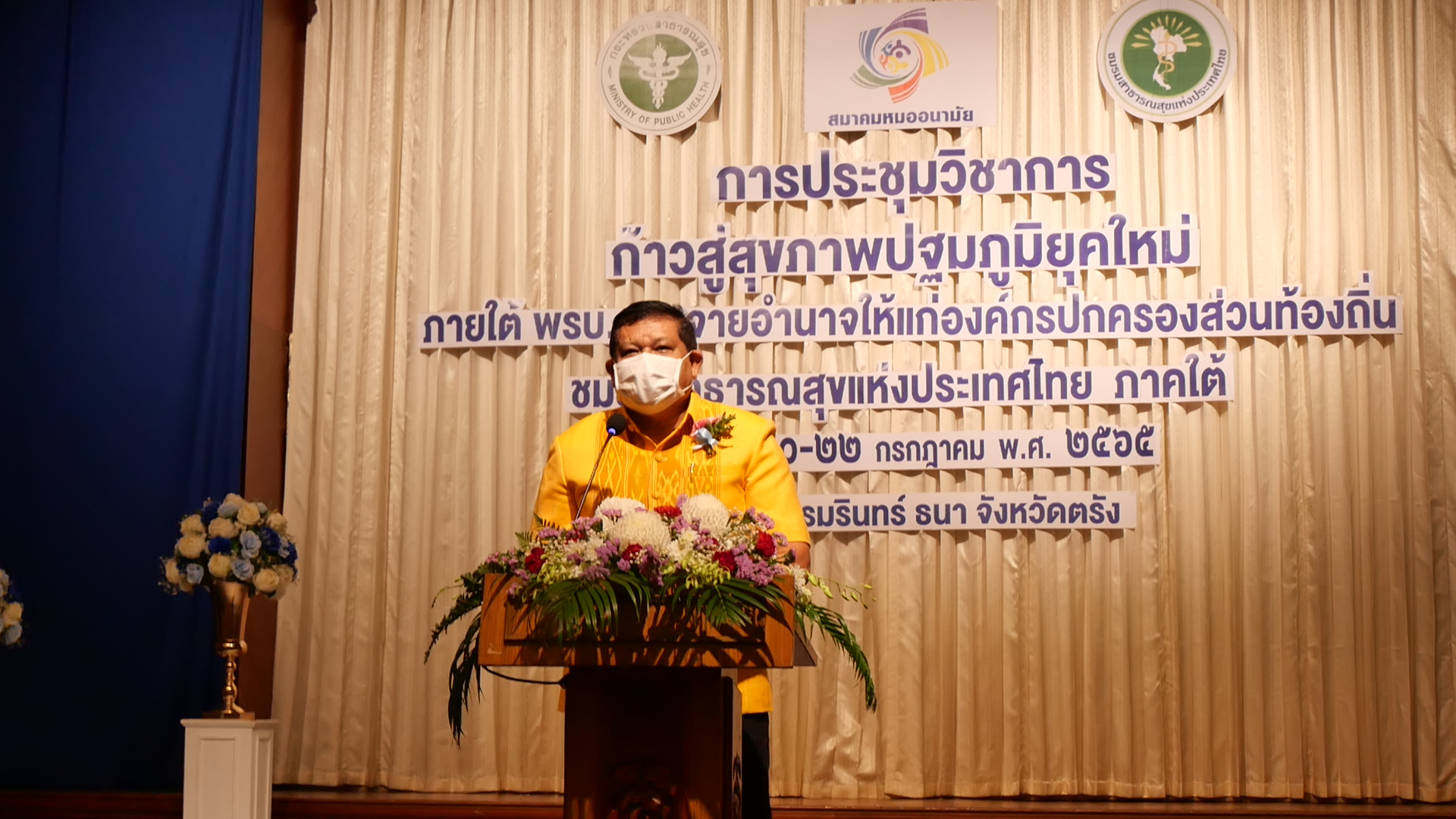 ที่ โรงแรมธรรมรินทร์ธนา อ.เมืองตรัง นายแพทย์สุเทพ เพชรมาก ผู้ตรวจราชการกระทรวงสาธารณสุข เขตสุขภาพที่ 12 เป็นประธานในพิธีเปิดการประชุมวิชาการชมรมสาธารณสุขแห่งประเทศไทยภาคใต้ ประจำปี 2565 โดยมี นายภูวนัฐ สมใจ รองผู้ว่าราชการจังหวัดตรัง กล่าวต้อนรับ และมี นายรัตน์นริศ สุวรรณรัตน์ ประธานชมรมสาธารณสุขแห่งประเทศไทยภาคใต้ กล่าวรายงาน ตามที่รัฐบาลและคณะกรรมการการกระจายอำนาจให้แก่องค์กรปกครองส่วนท้องถิ่น มีมติเห็นชอบและออกประกาศหลักเกณฑ์และขั้นตอน การถ่ายโอนภารกิจสถานีอนามัยเฉลิมพระเกียรติ 60 พรรษา นวมินทราชินีและโรงพยาบาลส่งเสริมสุขภาพตำบล ให้แก่องค์การบริหารส่วนจังหวัด โดยมาตรา 250 ของรัฐธรรมนูญแห่งราชอาณาจักรไทย ได้บัญญัติให้องค์กรปกครองส่วนท้องถิ่นมีหน้าที่ และอำนาจดูแล และจัดบริการสาธารณะ และกิจกรรมสาธารณะเพื่อประโยชน์ของประชาชน