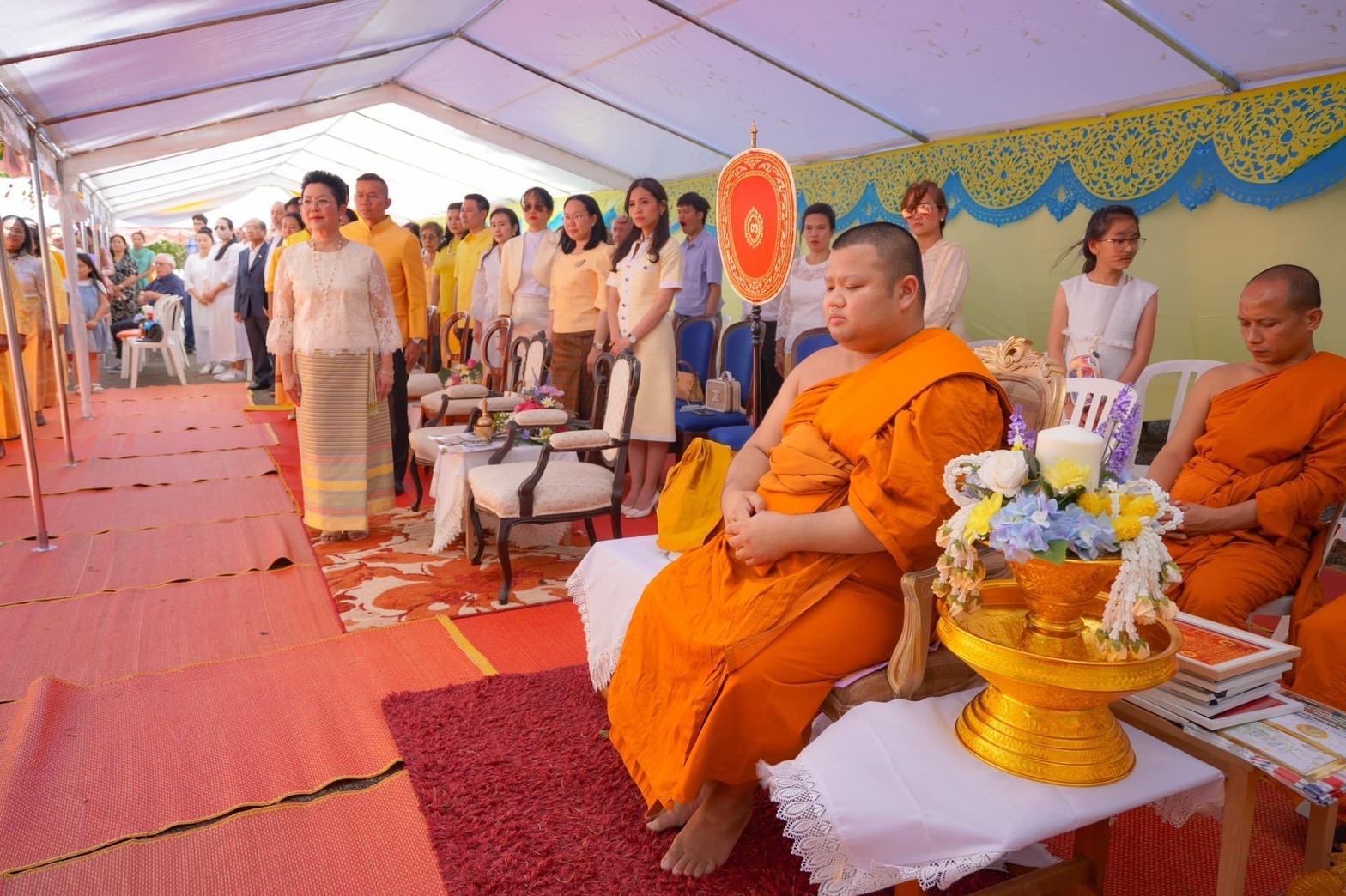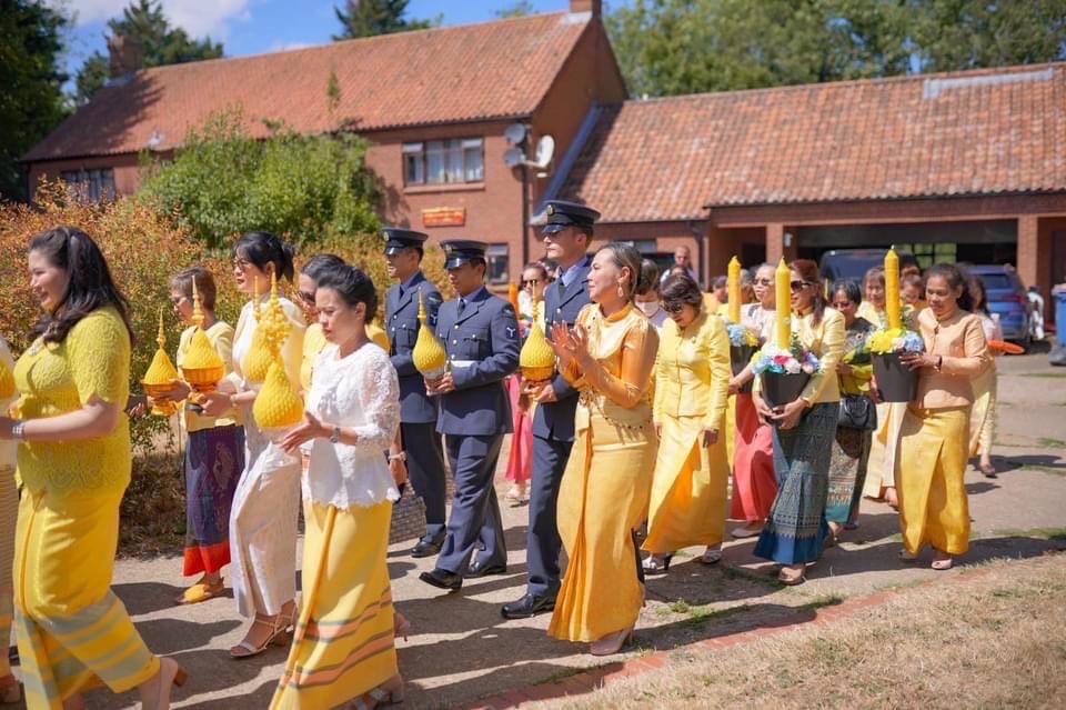 ในงานพิธีได้กราบอาราธนาพระสงฆ์ทรงสมณศักดิ์ที่ปฏิบัติศาสนกิจอยู่ในสหราชอาณาจักร นำโดยพระเดชพระคุณพระราชวิเทศปัญญาคุณ ประธานองค์กรพระธรรมทูตไทยในสหราชอาณาจักรและไอร์แลนด์ เป็นประธานฝ่ายสงฆ์ และมีท่านพิษณุ สุวรรณะชฏ เอกอัครราชทูตประจำกรุงลอนดอน เป็นประธานฝ่ายฆราวาส ในการนี้ได้รับพระมหากรุณาธิคุณโปรดพระราชทานผ้าไตรถวายพระสงฆ์สมณศักดิ์ที่เจริญพระพุทธมนต์ นับเป็นพระมหากรุณาธิคุณอย่างหาที่สุดมิได้
