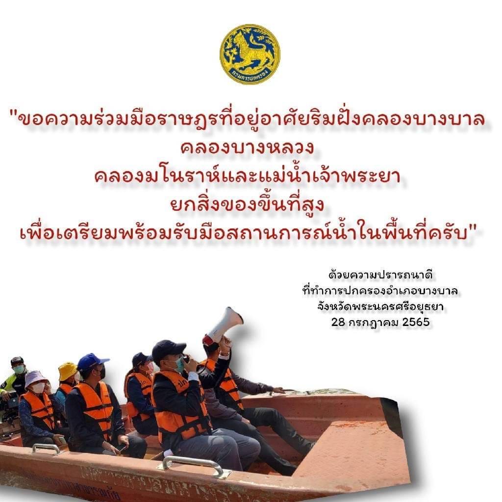 จึงขอให้ราษฎรที่อยู่อาศัยริมฝั่งแม่น้ำเจ้าพระยา แม่น้ำน้อย คลองบางบาล คลองบางหลวง คลองมโนราห์ เตรียมยกสิ่งของขึ้นที่สูง เพื่อเตรียมพร้อมรับมือสถานการณ์น้ำล้นตลิ่งในพื้นที่