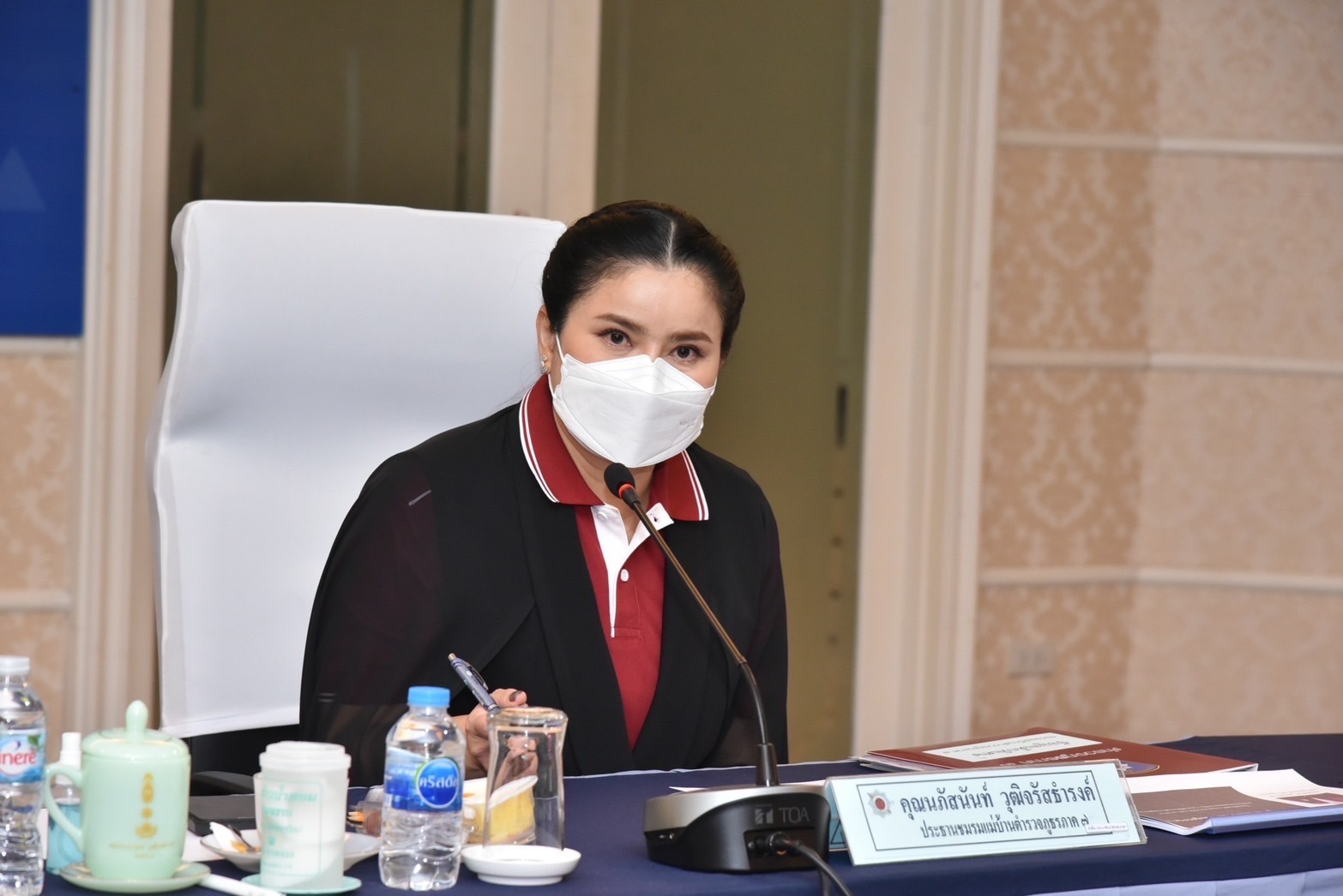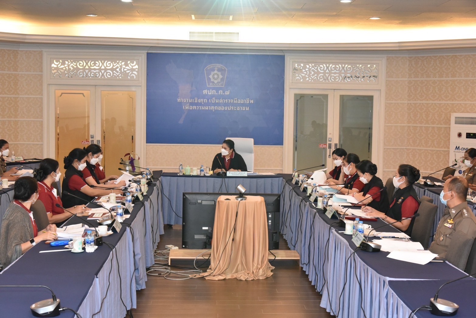นางนภัสนันท์ วุฒิจรัสธำรงค์ ประธานชมรมแม่บ้านตำรวจภูธรภาค 7 เป็นประธานในประชุม
