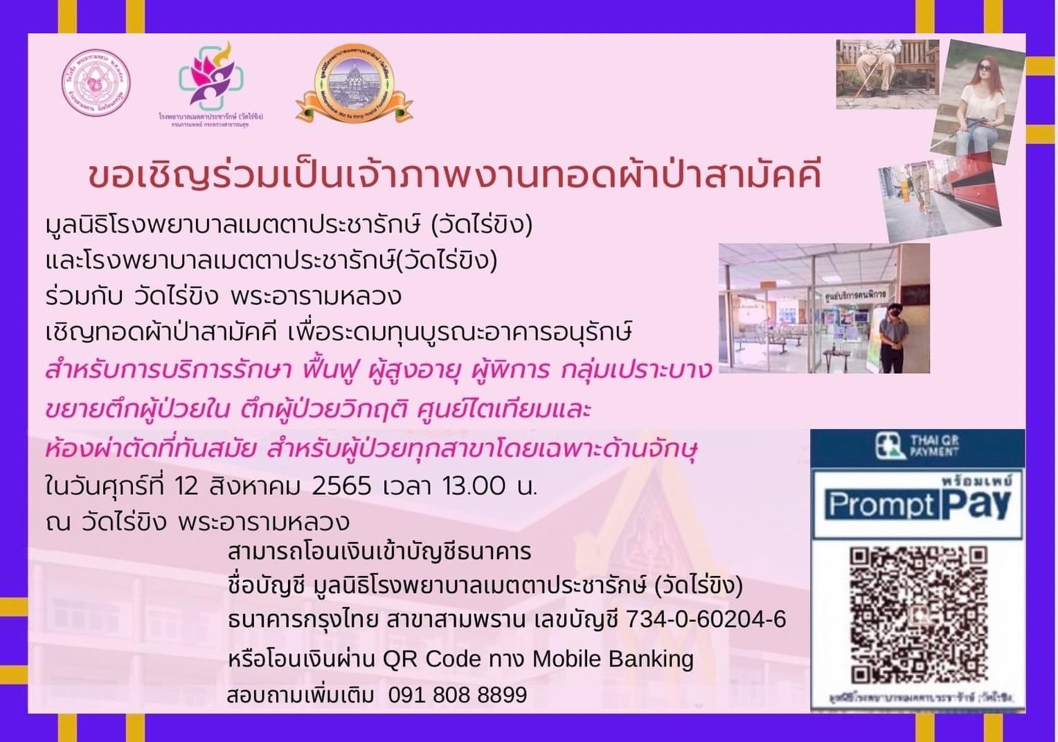 มูลนิธิโรงพยาบาลเมตตาประชารักษ์ (วัดไร่ขิง)อ.สามพราน จ.นครปฐม และโรงพยาบาลเมตตาประชารักษ์(วัดไร่ขิง)ร่วมกับ วัดไร่ขิง พระอารามหลวง ขอเชิญทอดผ้าป่าสามัคคี เพื่อระดมทุนบูรณะอาคารอนุรักษ์ สำหรับการบริการรักษา ฟื้นฟู ผู้สูงอายุ ผู้พิการ กลุ่มเปราะบาง ขยายตึกผู้ป่วยใน ตึกผู้ป่วยวิกฤติ ศูนย์ไตเทียมและห้องผ่าตัดที่ทันสมัย สำหรับผู้ป่วยทุกสาขาโดยเฉพาะด้านจักษุ ในวันศุกร์ที่ 12 สิงหาคม 2565 เวลา 13.00 น. ณ วัดไร่ขิง พระอารามหลวง อ.สามพราน จ.นครปฐม