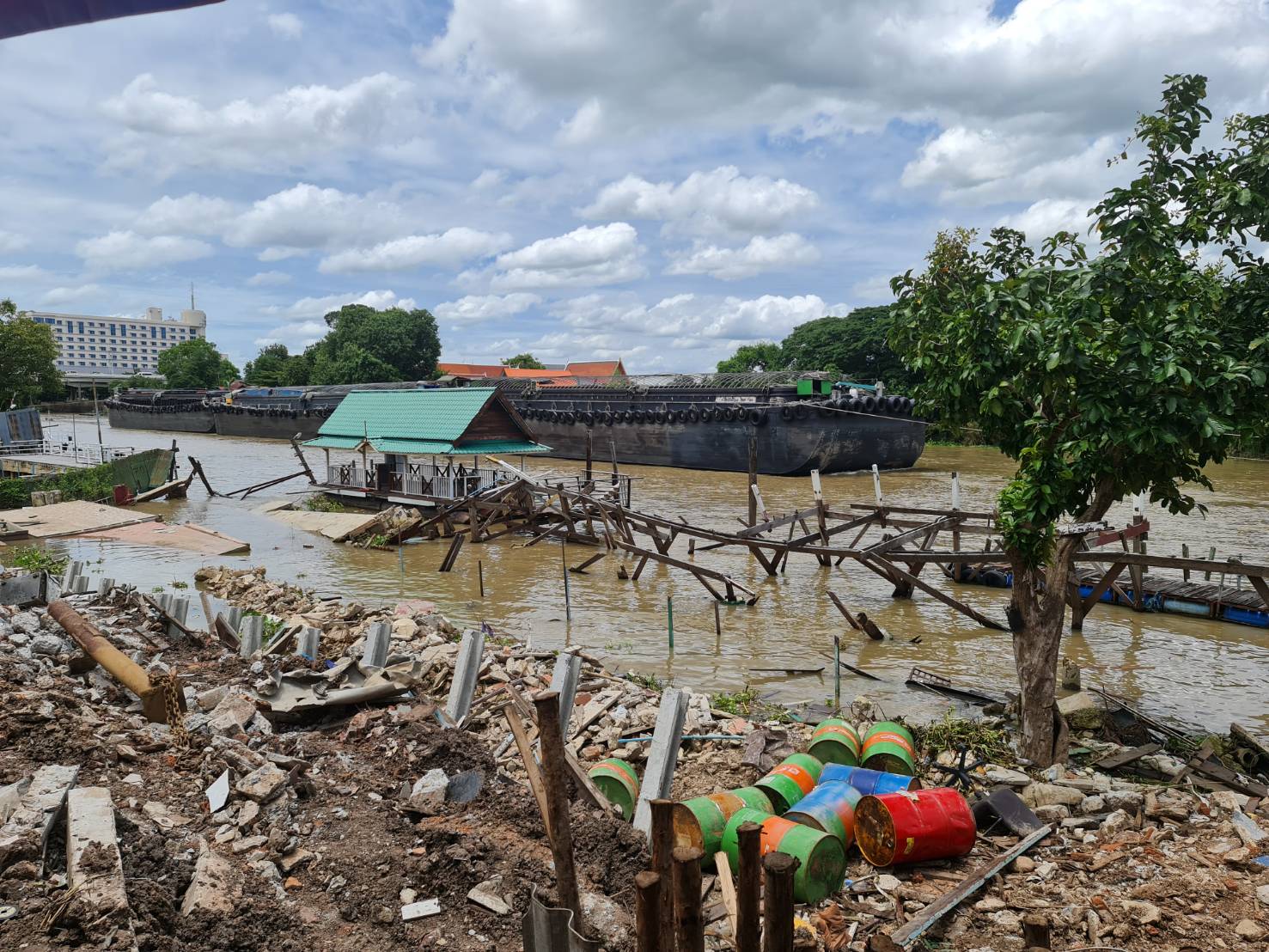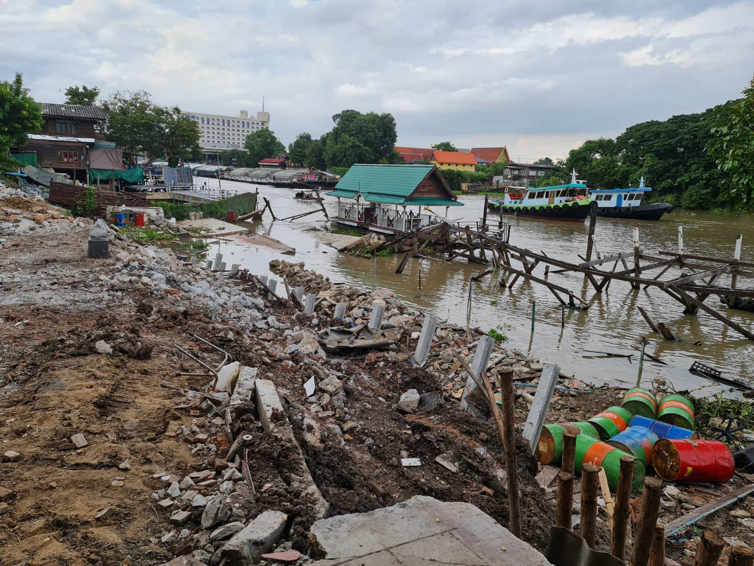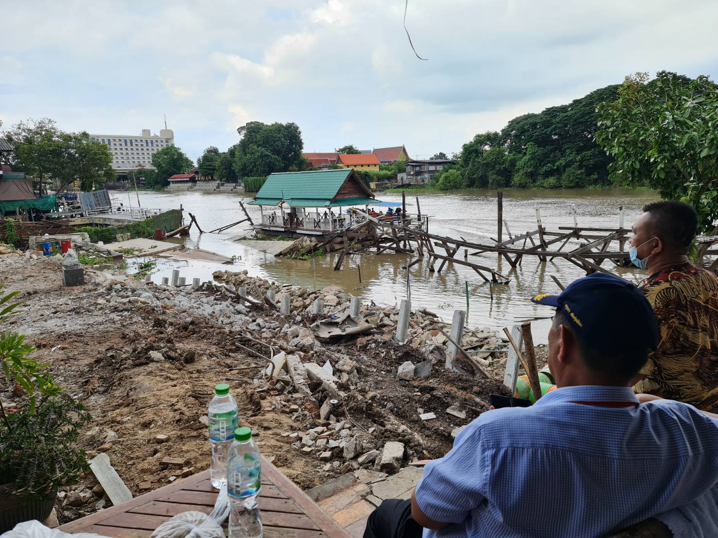 ร้านอาหารดัง แพกรุงเก่า ดินสไลน์ทรุดตัว พังลงแม่น้ำ ต้องปิดซ่อม ปรับปรุงใหม่ เกรงจะทรุดตัวลงอีก.