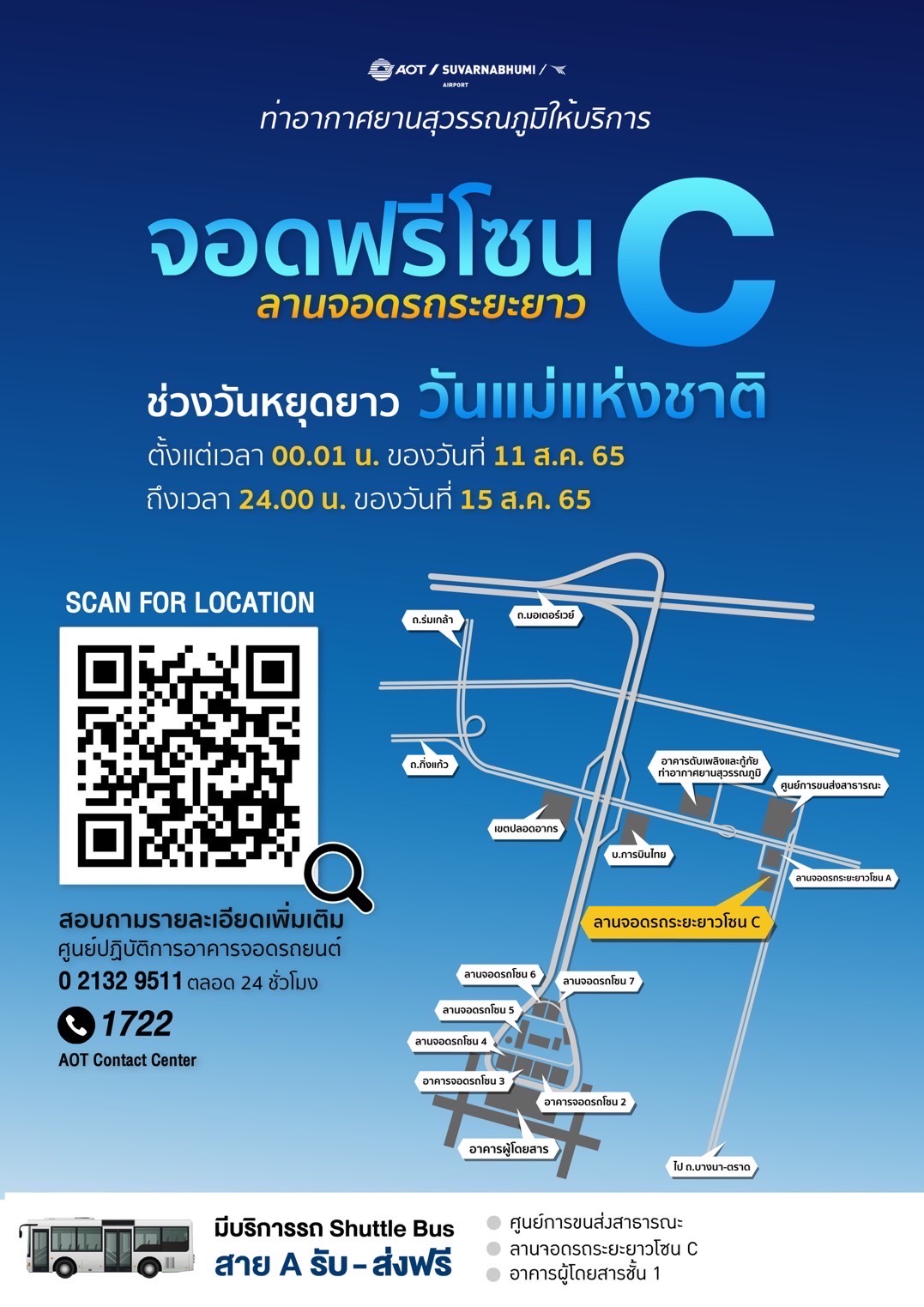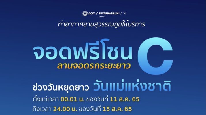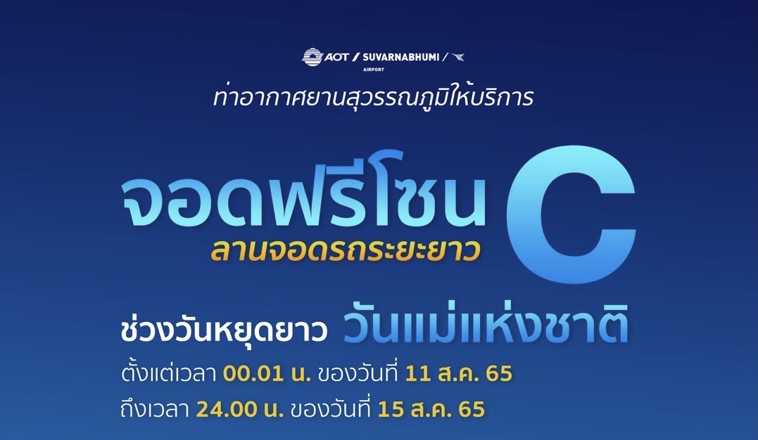 *****ท่าอากาศยานสุวรรณภูมิเปิดให้ผู้โดยสารผู้ใช้บริการจอดรถ ณ ลานจอดรถระยะยาวโซน C ฟรี ในวันหยุดยาว “วันแม่แห่งชาติ 2565” ระหว่างวันที่ 11 – 15 สิงหาคม 2565 นี้