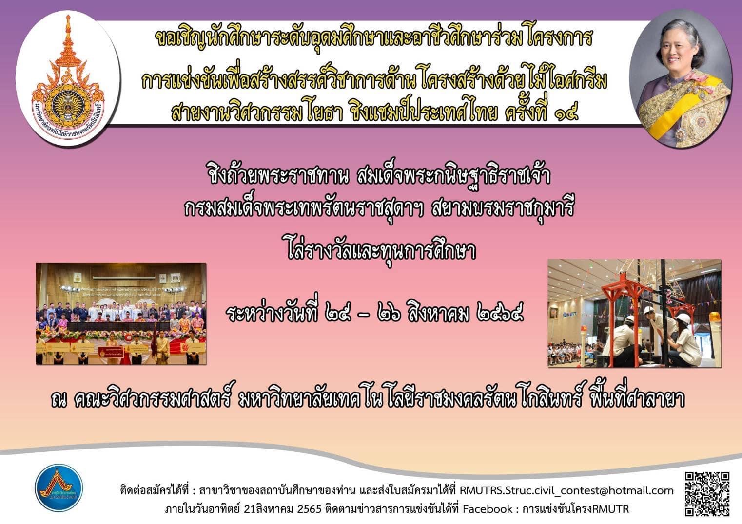 ขอเชิญชวนนักศึกษาระดับอุดมศึกษาและอาชีวศึกษา ร่วมโครงการการแข่งขันเพื่อสร้างสรรค์วิชาการด้านโครงสร้างด้วยไม้ไอศกรีม / ด้านโครงสร้างด้วยไม้และเหล็ก / ด้านโครงสร้างด้วยตะเกียบไม้ไผ่ สายงานวิศวกรรมโยธา ชิงแชมป์ประเทศไทย ชิงถ้วยพระราชทาน ระหว่างวันที่ 25-26 สิงหาคม 2565 ณ คณะวิศวกรรมศาสตร์ มหาวิทยาลัยเทคโนโลยีราชมงคลรัตนโกสินทร์