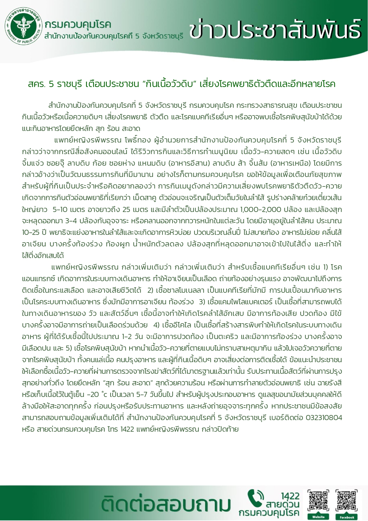ข่าวทั่วไป 21/08/2022 สคร.5ราชบุรี เตือนประชาชน“กินเนื้อวัวดิบ”เสี่ยงโรค Posted By: ไชยอนันต์ ดลชัยกรร์สกุล (บรรณาธิการ) ไชยอนันต์ ดลชัยกรร์สกุล (บรรณาธิการ) See author's posts