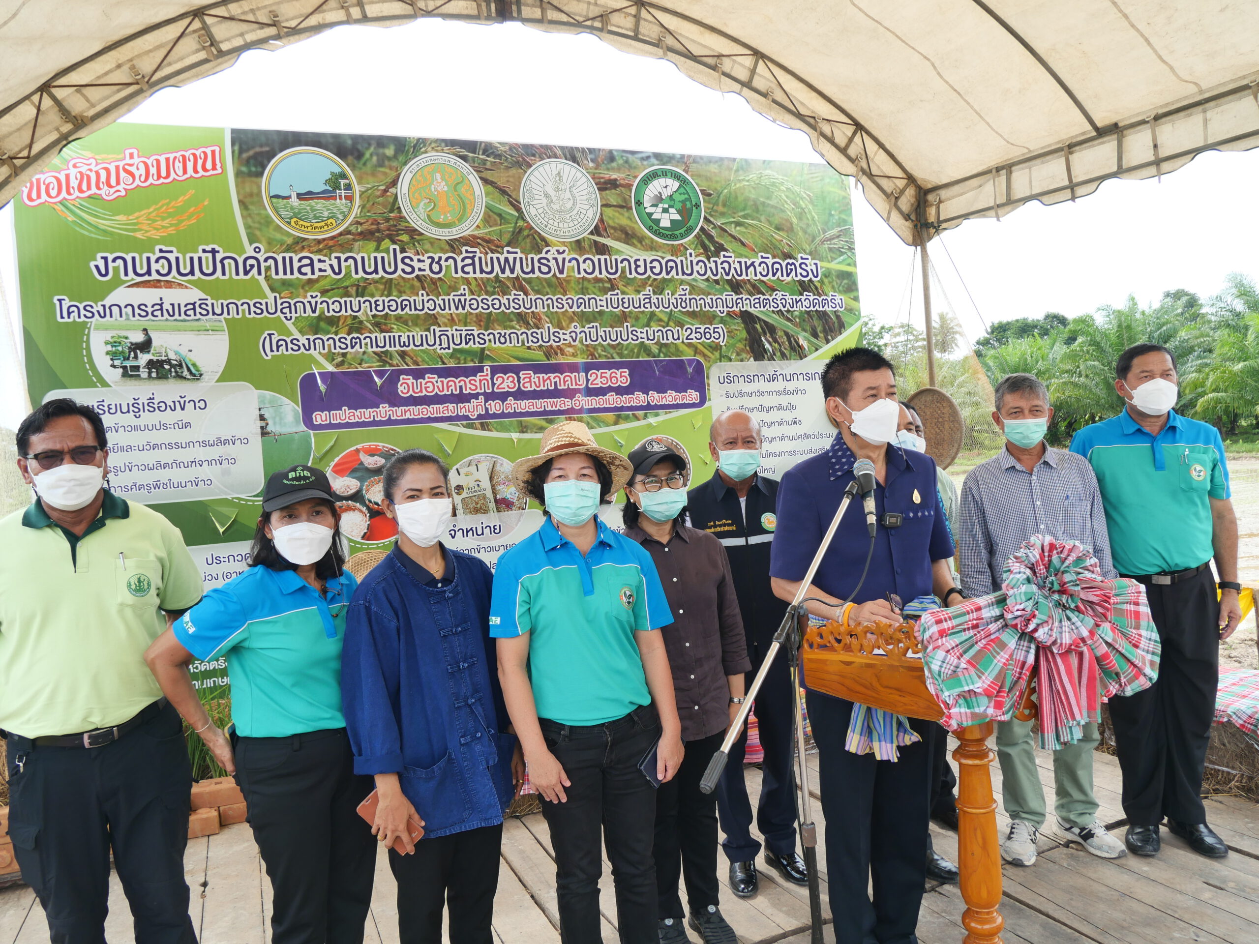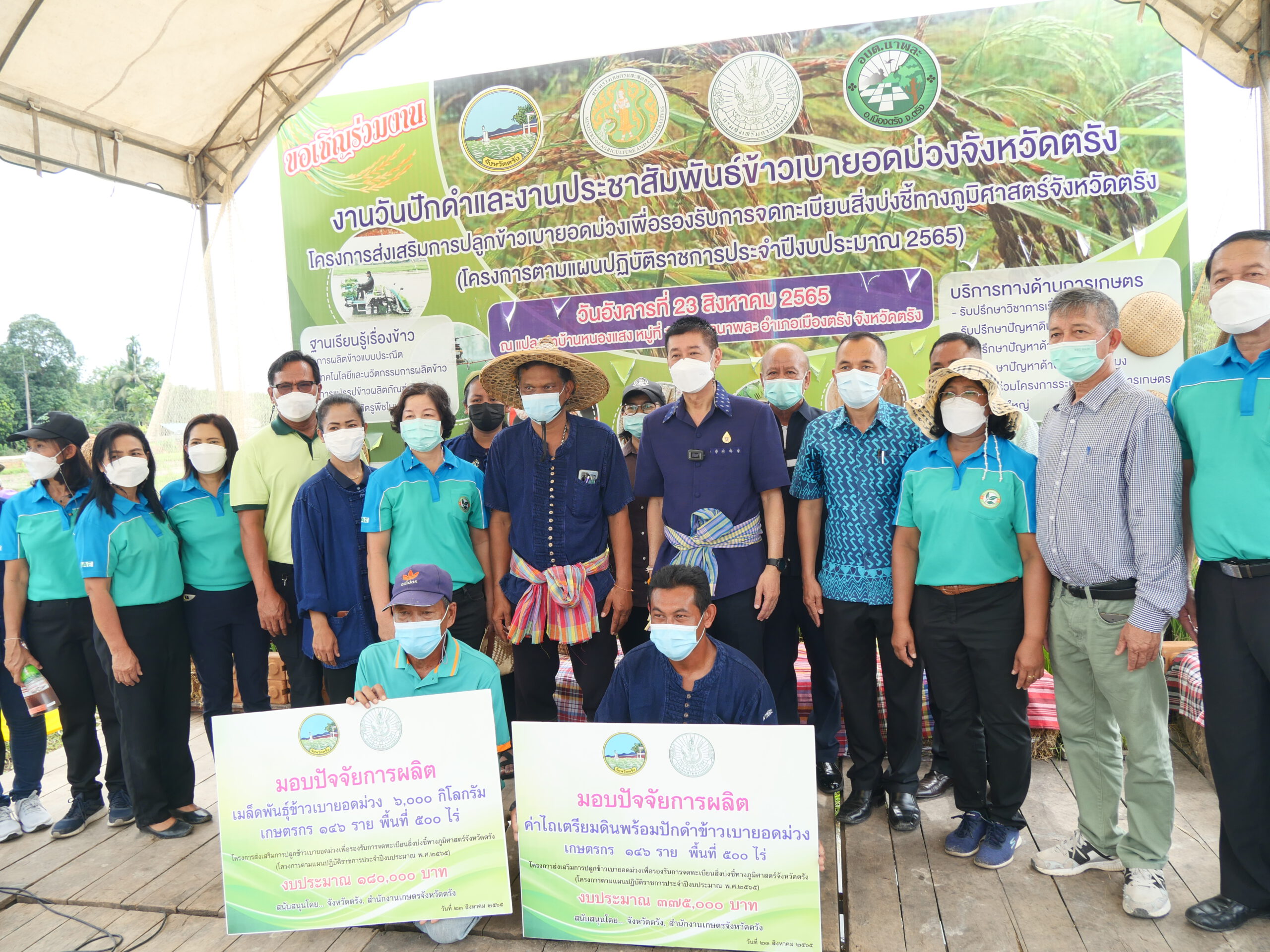ที่แปลงนาบ้านหนองแสง หมู่ที่ 10 ต.นาพละ อ.เมืองตรัง จังหวัดตรัง นายขจรศักดิ์ เจริญโสภา ผู้ว่าราชการจังหวัดตรัง เป็นประธานในพิธีเปิดงานวันปักดำและงานประชาสัมพันธ์ข้าวเบายอดม่วง ตามโครงการส่งเสริมการปลูกข้าวเบายอดม่วง เพื่อรองรับการจดทะเบียนสิ่งบ่งชี้ทางภูมิศาสตร์จังหวัดตรัง (โครงการตามแผนปฏิบัติราชการประจำปีงบประมาณ พ.ศ.2565)