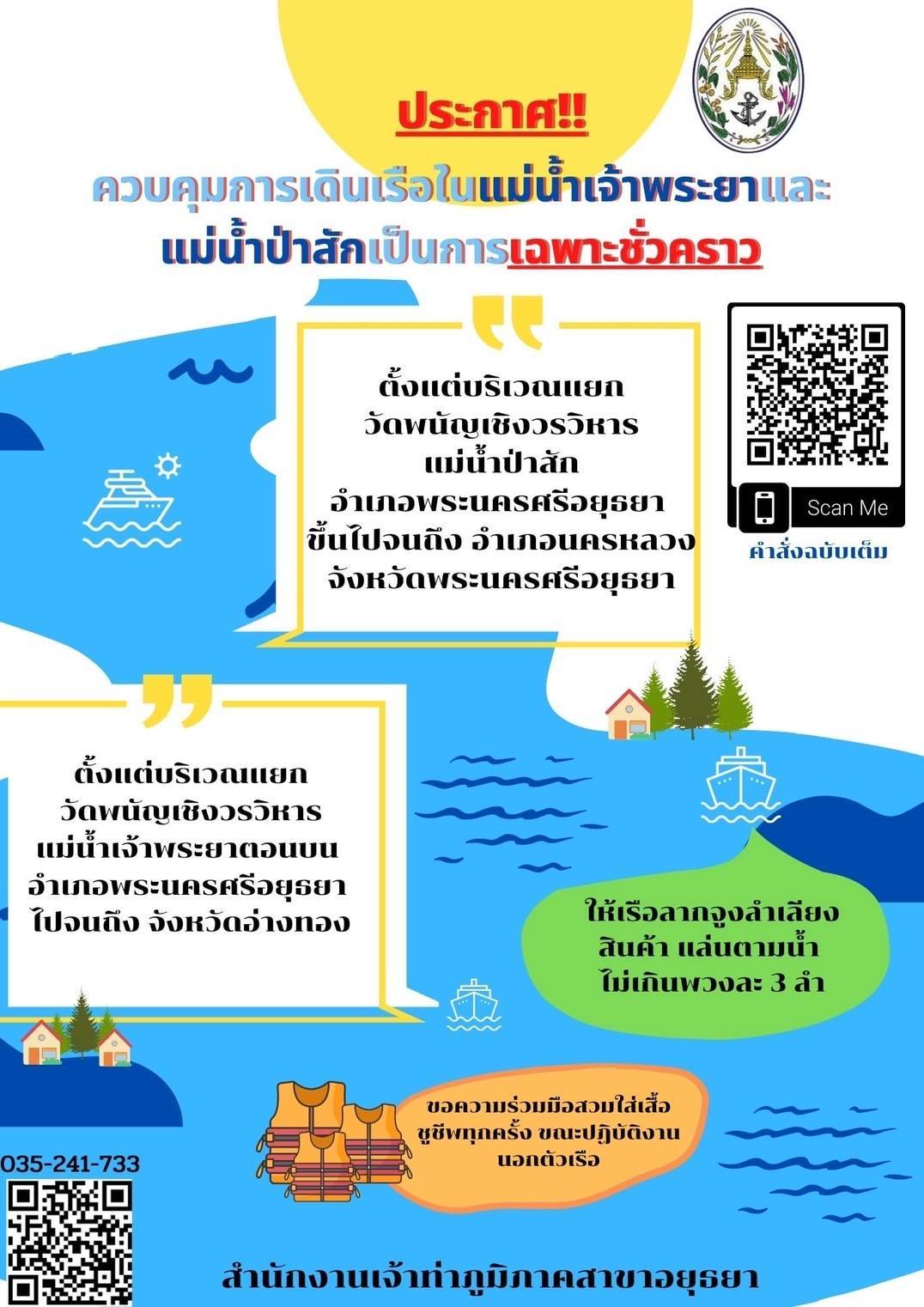 เจ้าท่าอยุธยา ประกาศการควบคุมการเดินเรือในแม่น้ำเจ้าพระยาและแม่น้ำป่าสัก หลังสถานการณ์น้ำเพิ่มขึ้นต่อเนื่อง
