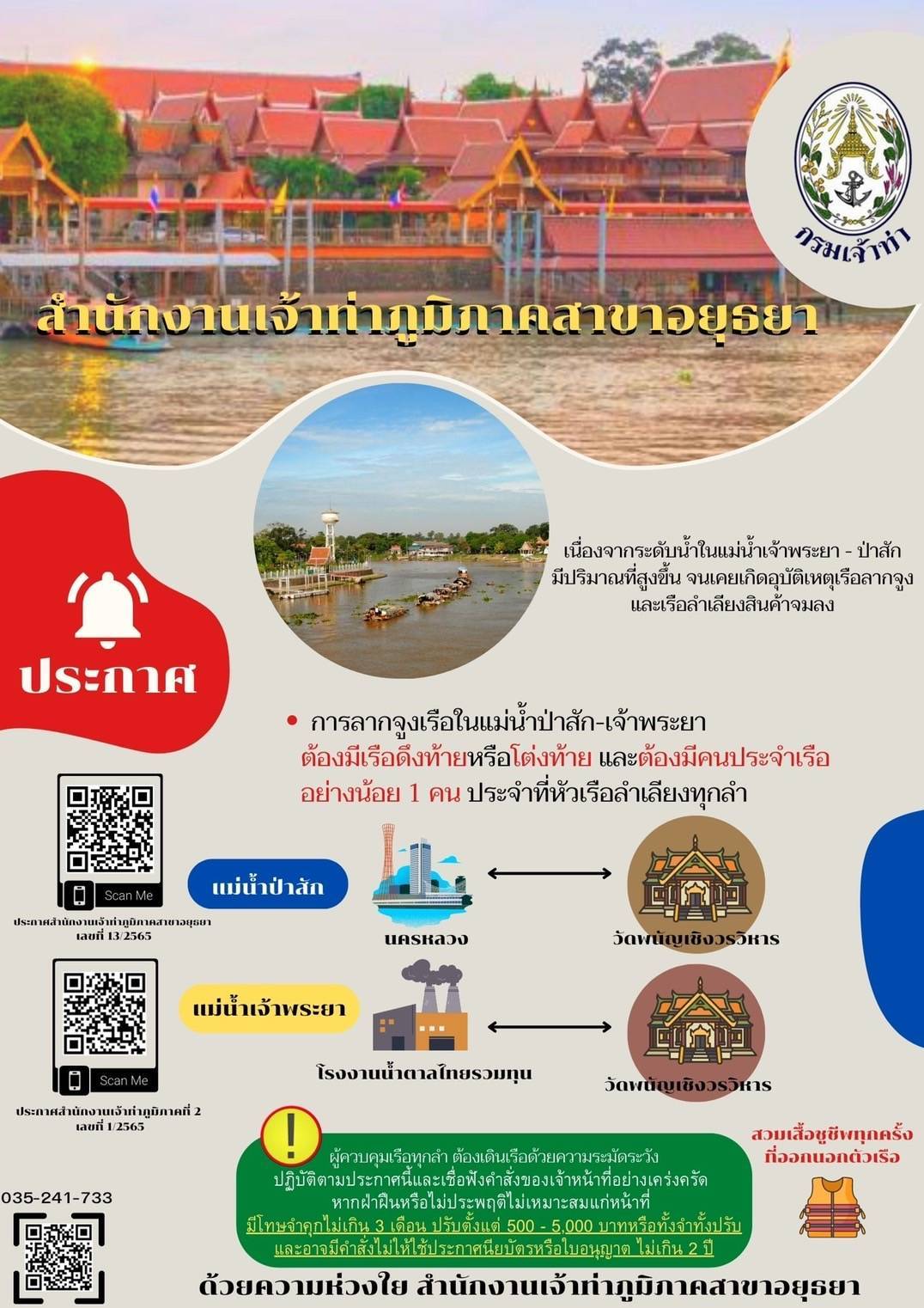ล่าสุด เจ้าท่าอยุธยาได้ออกประกาศแจ้งเตือนผู้ประกอบการ พี่น้องประชาชน คือตั้งแต่บริเวณแยกวัดพนัญเชิงวรวิหาร แม่น้ำป่าสัก อำเภอพระนครศรีอยุธยา ขึ้นไปจนถึงอำเภอนครหลวง จังหวัดพระนครศรีอยุธยา และตั้งแต่บริเวณแยกวัดพนัญเชิงวรวิหาร แม่น้ำเจ้าพระยาตอนบน อำเภอพระนครศรีอยุธยา ไปจนถึงจังหวัดอ่างทอง โดยให้เรือลากจูงลำเลียงสินค้ แล่นตามน้ำไม่เกินพวงละ 3 ลำ ควบคู่กับการสวมใส่เสื้อชูชีพทุกครั้งขณะปฏิบัติงานนอกตัวเรือ เพื่อเป็นการป้องกันอุบัติเหตุทางน้ำที่อาจจะเกิดขึ้น