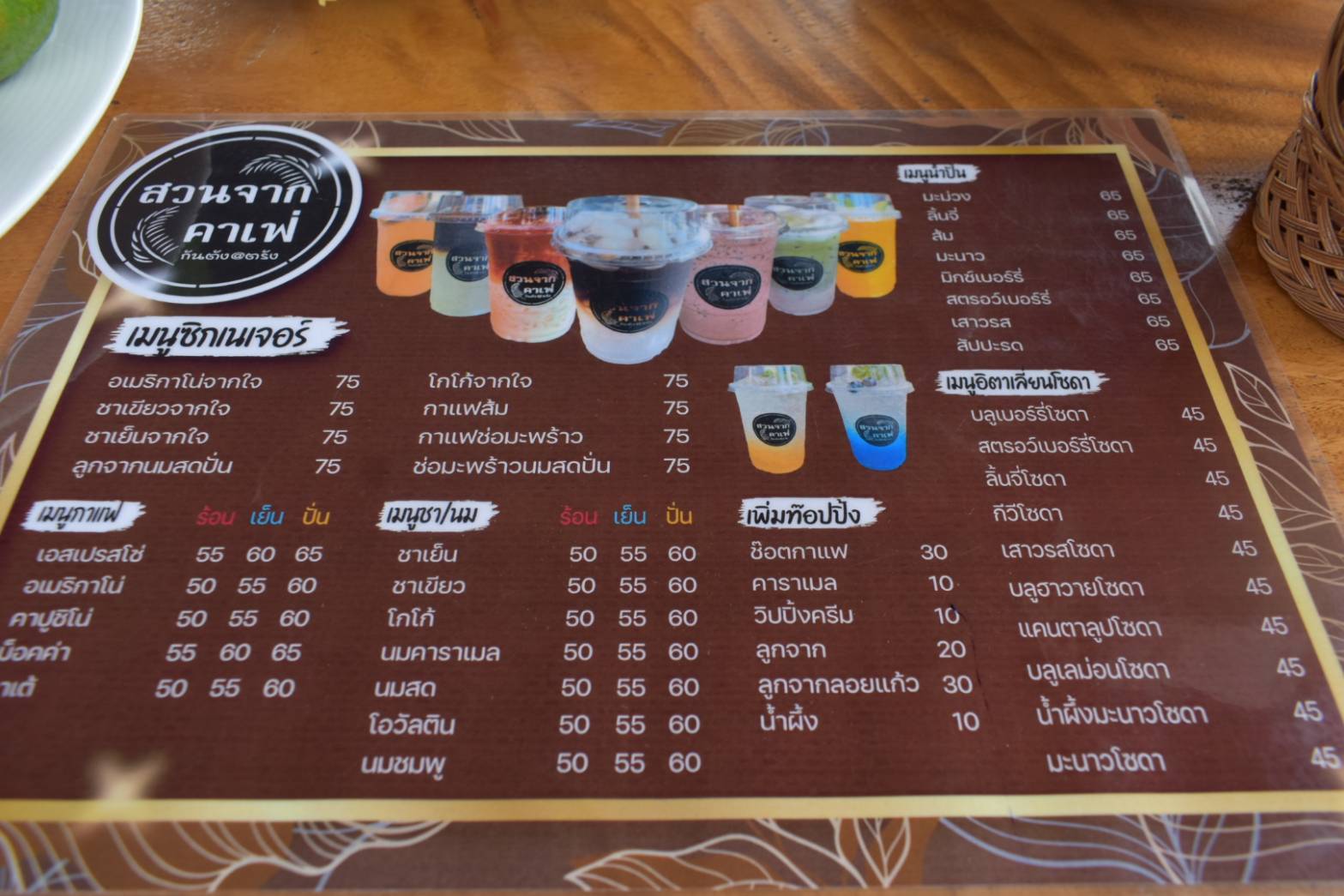 ด้านนางวัลคุ์วลี ผลิผล เจ้าของสวนจากคาเฟ่กล่าวว่า เมนูเด่นของร้านของอเมริกาโน่จากใจและขนมเค้กลูกจาก ราคาขายเริ่มต้นที่ 20-95 บาท ราพื้นบ้านไม่สูงมากนัก เพราะว่าเราจะยึดคนหลายระดับชั้นมาทานได้หมด ซึ่งในอนาคตจะนำลูกจากมาเป็นเมนูอาหารคาว ซึ่งลูกค้าที่มาชิมแล้วต่างบอกว่าจะกลับมากินอีกเพราะติดใจในรสชาติ และความแปลกใหม่ ส่วนจุดเด่นของทางร้านคือมีวิวสวนจาก เป็นธรรมชาติ มีต้นจากมีผลิตภัณฑ์จากใบจาก และผลิตภัณฑ์จากสวนจาก เลยตั้งชื่อว่า “สวนจากคาเฟ่”