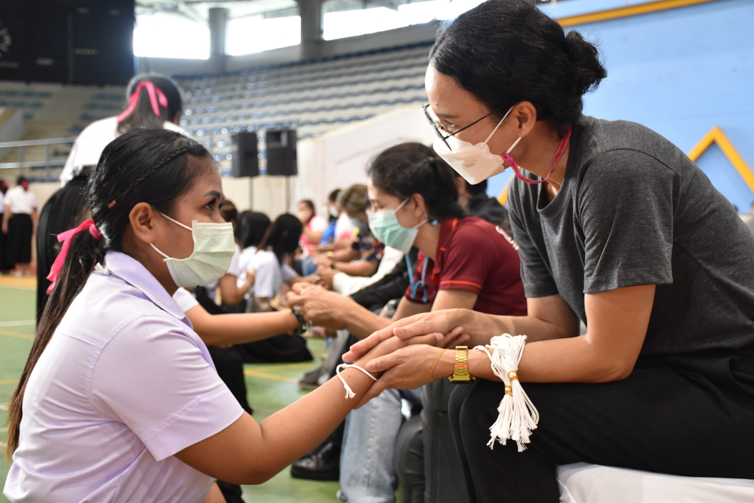 จากนั้นเมื่อเวลา 16.30 น. ณ อาคารกีฬาราชมงคลตรัง พิธีบายศรีสู่ขวัญนักศึกษาใหม่ และผู้ข้อมือเพื่อรับพรจากครูอาจารย์ รวมถึงรุ่นพี่นักศึกษา สืบทอดประเพณีอันดีงาม ส่งเสริมให้มีความรักสามัคคีในหมู่คณะ มีความเป็นหนึ่งเดียวกันรู้จักการให้อภัย มีน้ำใจต่อกัน การจัดโครงการในครั้งนี้ได้รับการสนับสนุนด้วยดี จากงานพัฒนานักศึกษาและศิษย์เก่าสัมพันธ์