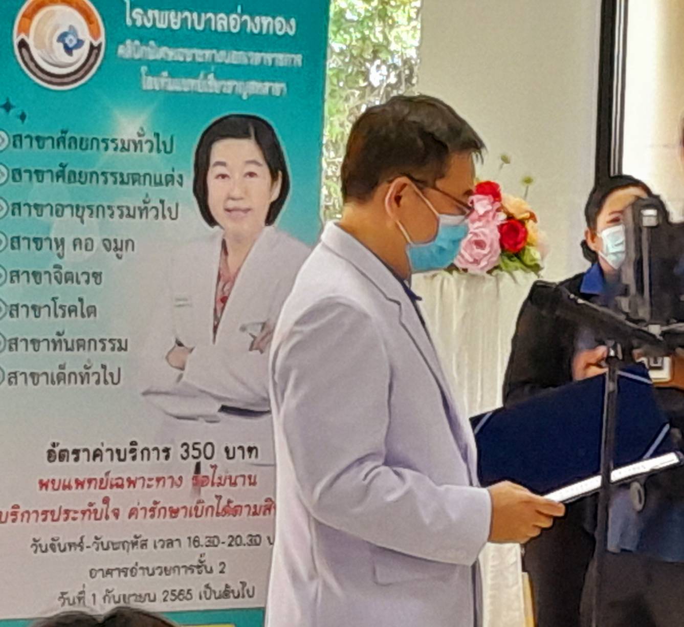 เมื่อวันที่ 1 กันยายน 2565 เวลา 15.00 น. แพทย์หญิงดวงพร อัศวราชัย ผู้อำนวยการโรงพยาบาลอ่างทอง เป็นประธาน เปิดคลินิกพิเศษเฉพาะทาง นอกเวลาราชการ ณ อาคารอำนวยการชั้น 2 ของโรงพยาบาลอ่างทองโดยมีนายแพทย์ณรงค์ คันธกุลดุษฎี รองผู้อำนวยการภารกิจด้านพัฒนาระบบบิริการ และสนับสนุนบริการสุขภาพ ประธานกรรมการคลินิกพิเศษเฉพาะทางนอกเวลาราชการ กล่าวรายงานวัตถุประสงค์