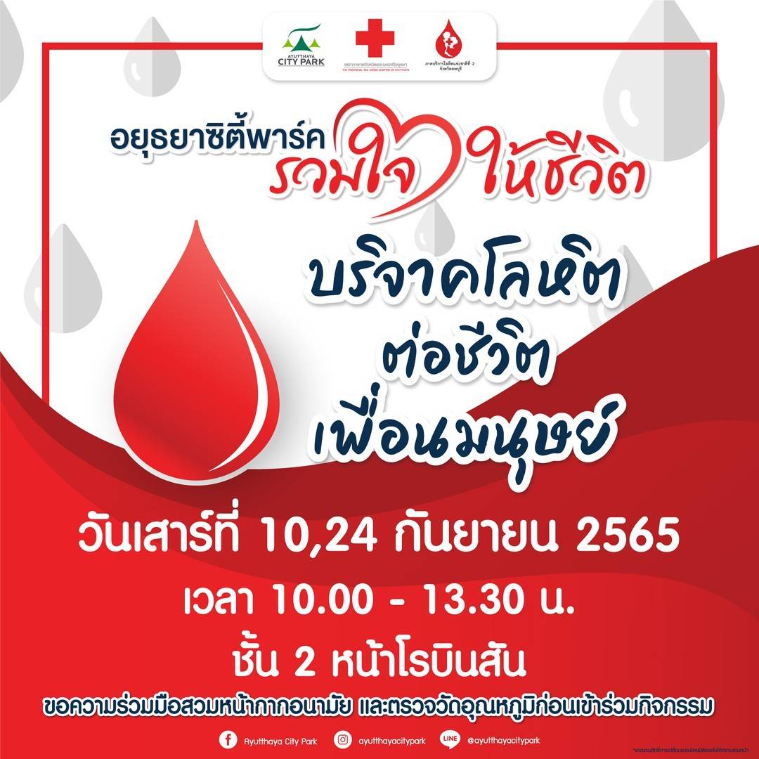 ศูนย์การค้าอยุธยาซิตี้พาร์ค ร่วมกับ สำนักงานภาคบริการโลหิตแห่งชาติที่ 2 จังหวัดลพบุรี และเหล่ากาชาดจังหวัดพระนครศรีอยุธยา ขอเชิญชวนทุกท่านที่สุขภาพดี ร่างกายแข็งแรง ร่วมบริจาคโลหิต เพื่อมอบให้กับผู้ป่วยที่มีความต้องการเลือดจำนวนมาก ในกิจกรรม “อยุธยาซิตี้พาร์ค รวมใจให้ชีวิต”