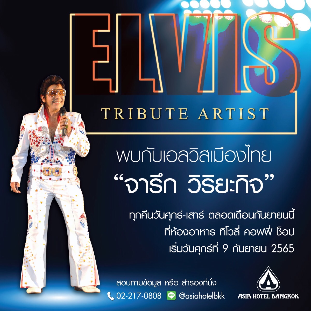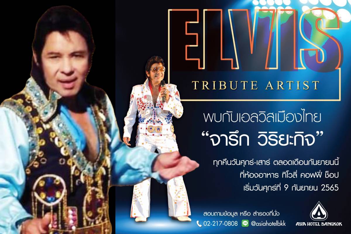 ‘จารึก วิริยะกิจ’ Elvis เมืองไทย ชวนหวนรำลึกราชาเพลงร็อก’ Elvis Presley’ ให้เหล่าบรรดาแฟนเพลงราชาเพลงร็อกในตำนาน Elvis Presley ได้หายคิดถึง…อีกครั้งหลังจากห่างหายไปถึง 2ปี จารึกก็กลับมาสร้างความสุขด้วยเสียงเพลงอีกครั้งที่ห้องอาหารทิโวลี่ คอฟฟี่ ช๊อป ชั้นG ที่โรงแรมเอเชีย กรุงเทพ เริ่มศุกร์ที่ 9 กันยายน 2565 ร้องทุกวันศุกร์กับเสาร์ของเดือนกันยายน2565