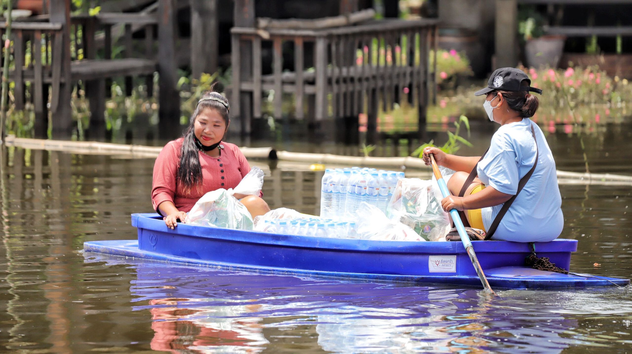 โดยชาวบ้านที่อยู่หมู่ที่4 ชุมชนวัดบางหลวง หลังจากรับถุงยังชีพแล้ว ต่างนำสิ่งของขึ้นเรือ และโป๊ะโฟม พายกลับไปยังบ้านเรือนของตัวเอง เนื่องจากสภาพเส้นทางการสัญจรได้ถูกน้ำเออล้นเข้าท่วมหมดแล้ว