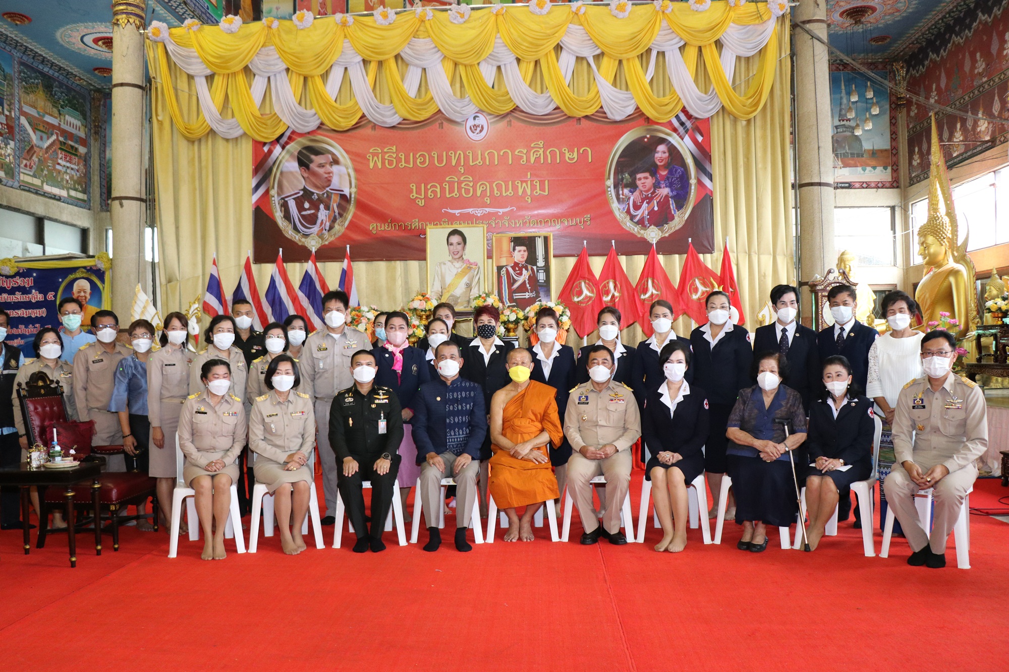 วันที่ 16 กันยายบน 2565 ที่ ศาลาการเปรียญวัดไชยชุมพลชนะสงคราม พระอารามหลวง อำเภอเมือง จังหวัดกาญจนบุรี นายจีระเกียรติ ภูมิสวัสดิ์ ผู้ว่าราชการจังหวัดกาญจนบุรี เป็นผู้แทนพระองค์ในการมอบทุนสนับสนุนการศึกษาแก่เด็กออทิสติกและเด็กพิการในมูลนิธิคุณพุ่ม จังหวัดกาญจนบุรี พร้อมด้วย นางรชยา ภูมิสวัสดิ์ นายกเหล่ากาชาดจังหวัดกาญจนบุรโดยมี นางสาวอรวรรณ เจือจาน ผู้อำนวยการศูนย์การศึกษาพิเศษประจำจังหวัดกาญจนบุรี กล่าวต้อนรับ และพลตำรวจตรีกมลสันติ กลั่นบุศย์ ประธานคณะกรรมการสถานศึกษาขั้นพื้นฐาน ศูนย์การศึกษาพิเศษประจำจังหวัดกาญจนบุรี กล่าวรายงานฯ พร้อมด้วย หัวหน้าส่วนราชการ คณะครู อาจารย์ นักเรียน และผู้ปกครอง เข้าร่วมในพิธีฯ โดยผู้เข้ารับทุนทั้งหมดได้เข้ารับประทานทุนเบื้องหน้าพระรูปทูลกระหม่อมหญิงอุบลรัตนราชกัญญา สิริวัฒนาพรรณวดี ทูลกระหม่อมหญิงอุบลรัตนราชกัญญา สิริวัฒนาพรรณวดี ได้ทรงมีพระเมตตาประทานทุนให้เด็กพิการที่มีฐานะยากจนทั่วประเทศ ซึ่งศูนย์การศึกษาพิเศษประจำจังหวัดกาญจนบุรี ได้รับพิจารณาอนุมัติทุนการศึกษา ประจำปี การศึกษา 2565 ทั้งหมด 130 ทุน ทุนละ 5,000 บาท รวมเป็นเงิน 650,000 บาทและในครั้งนี้ได้รับสนับสนุนทุนการศึกษาเพิ่มเติมจาก จากหลายภาคส่วนในจังหวัดกาญจนบุรี