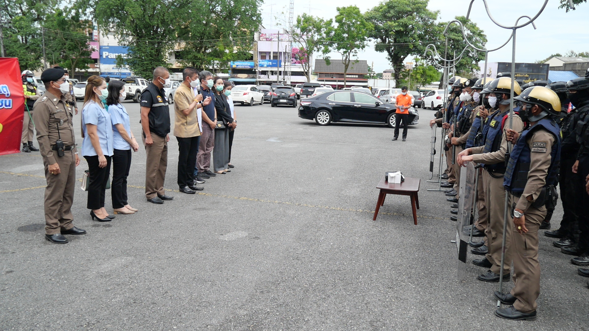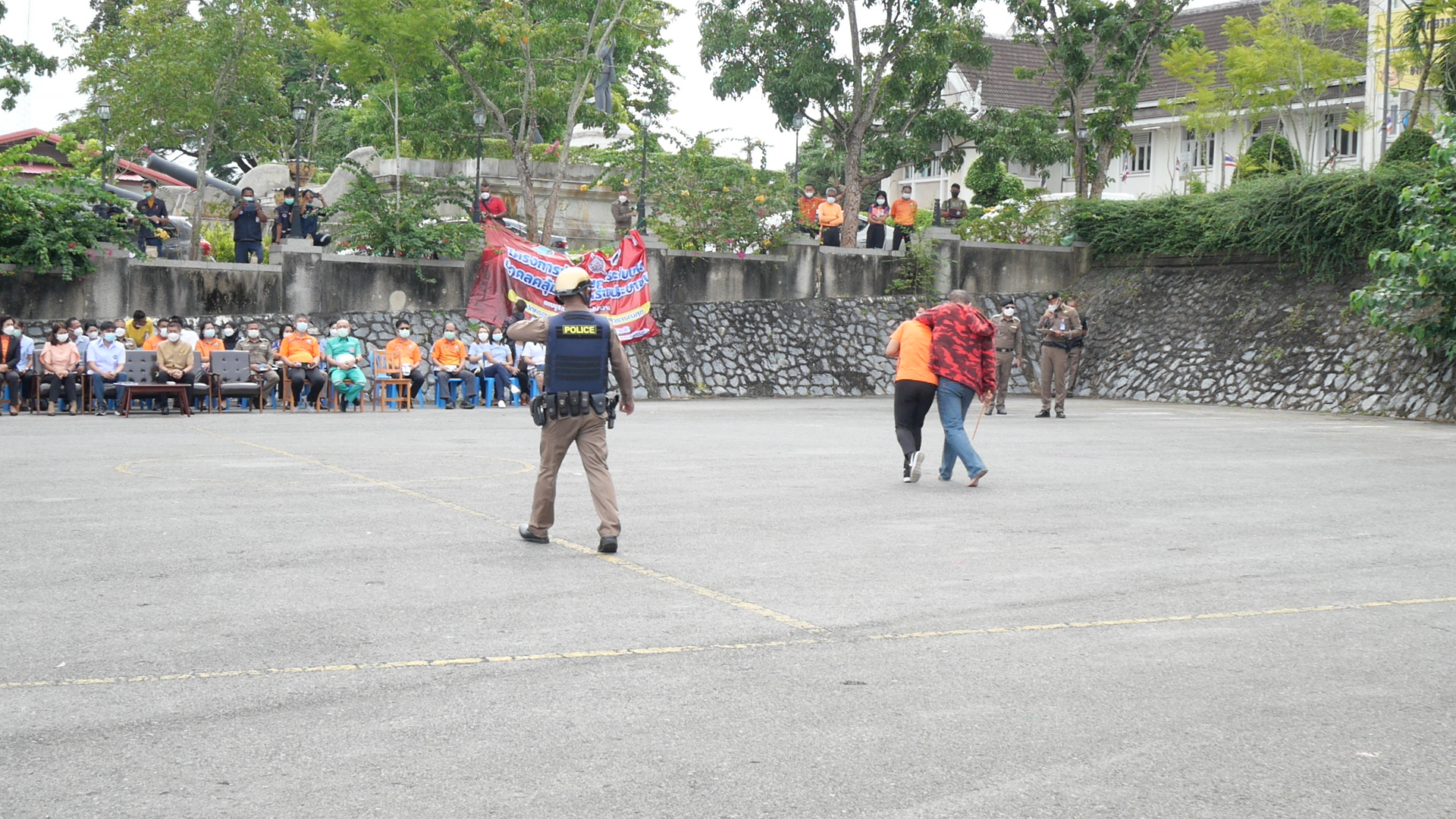 หลังจากนั้น ณ บริเวณลานพระบรมราชานุสาวรีย์รัชกาลที่ 5 ทางเจ้าหน้าที่ตำรวจ สภ. เมืองตรัง ได้สาธิตการควบคุมผู้ก่อเหตุคลุ้มคลั่งและผู้ก่อก่อเหตุจับประชาชนเป็นตัวประกัน ทางเจ้าหน้าที่ได้ปฏิบัติตามยุทธวิธีที่ได้รับการฝึกมา ตั้งแต่การควบคุมพื้นที่ การเจรจา การประสานงานและขอกำลังสนับสนุนในการเข้าระงับเหตุ รวมถึงการปฐมพยาบาลผู้ที่ได้รับบาดเจ็บ ผลกรปฏิบัติเป็นไปด้วยดี การเข้าปฏิบัติมีประสิทธิภาพ ทางผู้ว่าราชการจังหวัดตรัง พึงพอใจและมั่นใจว่าจะสามารถเข้าระงับและช่วยเหลือประชาชนได้ อีกทั้งจังหวัดตรัง เป็นจังหวัดแรกที่ให้ความสำคัญของการเกิดเหตุคลุ้มคลั่ง ซึ่งเป็นเหตุการณ์ที่ทำให้ประชาชนเดือดร้อน
