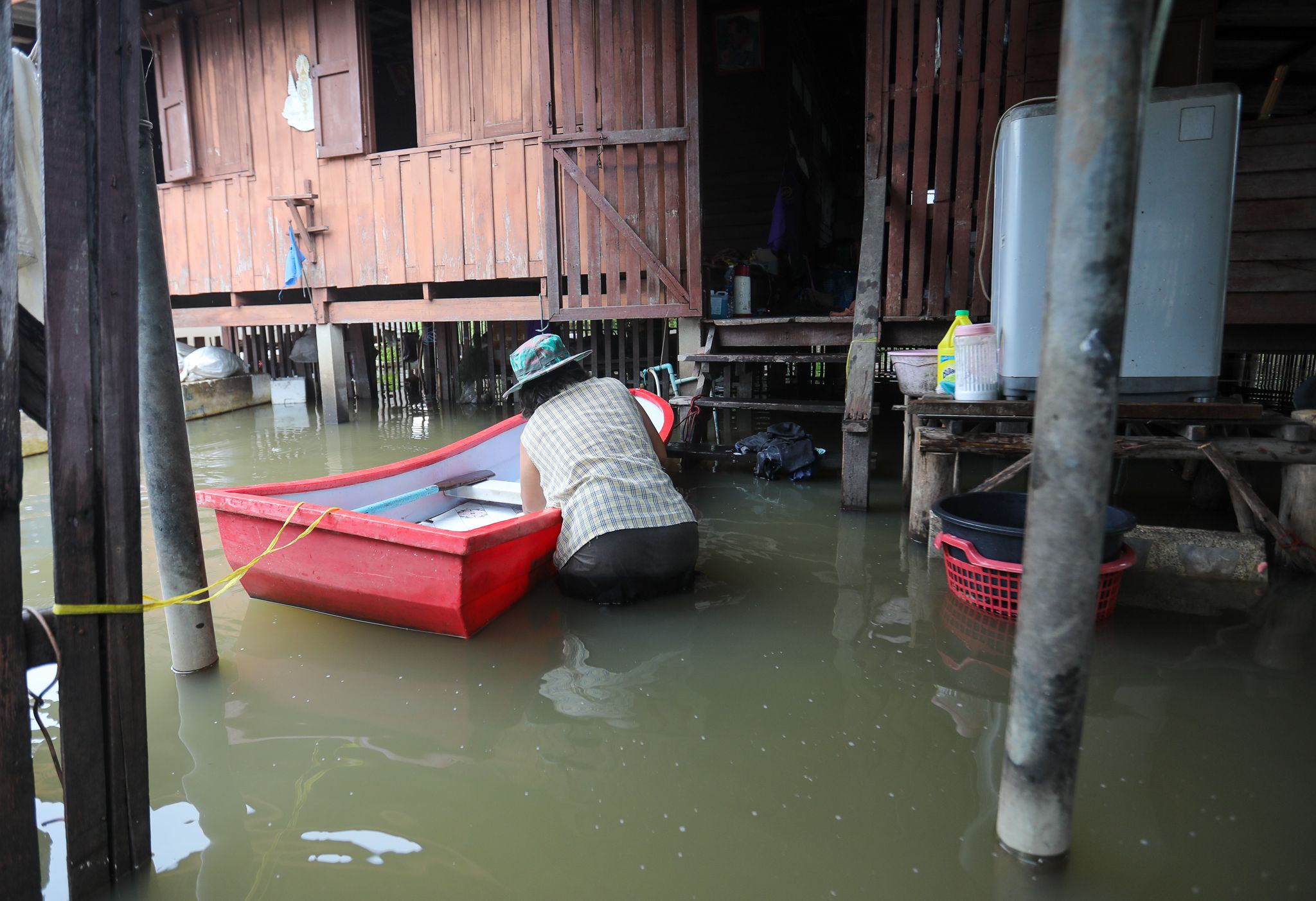 โดยในชุมชนหน้าวัดบางหลวง ถนนทางเดินเข้าออกน้ำสูงกว่า 50 ซม.และท่วมเข้าบ้านทุกหลังคาเรือน การสัญจรไปมาต้องเดินลุยน้ำเข้าบ้าน ชาวบ้านเริ่มนำเรือ ออกมาใช้เตรียมความพร้อมรับมือกับสถานการณ์ฝนตกจากพายุโนรู