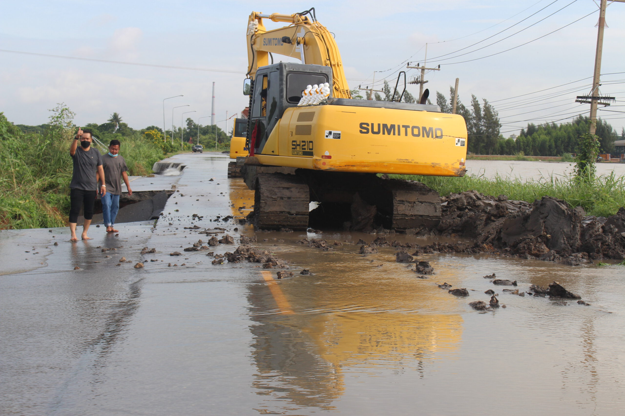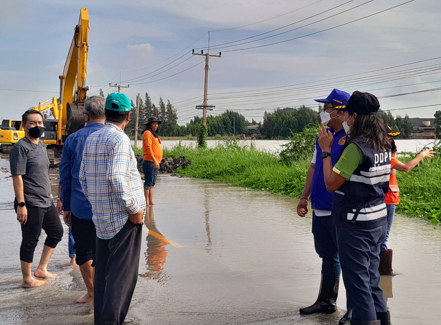 ต่อมาช่วงเวลา 07.30 น นางสาวเอกรัตน์ นาคาคง รองผู้ว่าราชการจังหวัดอ่างทอง พร้อม นางสาวสุพีพร โมรา ปภ.จ.อ่างทอง นายศราวุธ เผ่าพยัฆ นายก อบต.เอกราช นายเฉลิม เผ่าพยัฆ เจ้าของบ่อทรายในพื้นที่ พร้อมด้วยนายไพรัตน์ ทองหยอด นายก อบต.นรสิงห์ และผู้นำท้องที่ กำนันตำบลเอกราช ได้ดำเนินการนำเครื่องจักรกล และรถบรรทุกดิน มาทำคันดินกั้นน้ำเป็นแนวยาว เป็นการระงับเหตุเบื้องต้น และได้ประสานไปยังหน่วยงานต่างๆให้เร่งช่วยเหลือเป็นการด่วน ส่วนถนนเส้นนี้ ต้องปิดการสัญจรไปมาอย่างชั่วคราว เนื่องจากมีการพังทลายของผิวจราจรหลายจุด อีกทั้งมีน้ำท่วมขังสูงไม่สามารถสัญจรได้ จึงขอประชาสัมพันธ์ให้ทราบโดยทั่วกัน