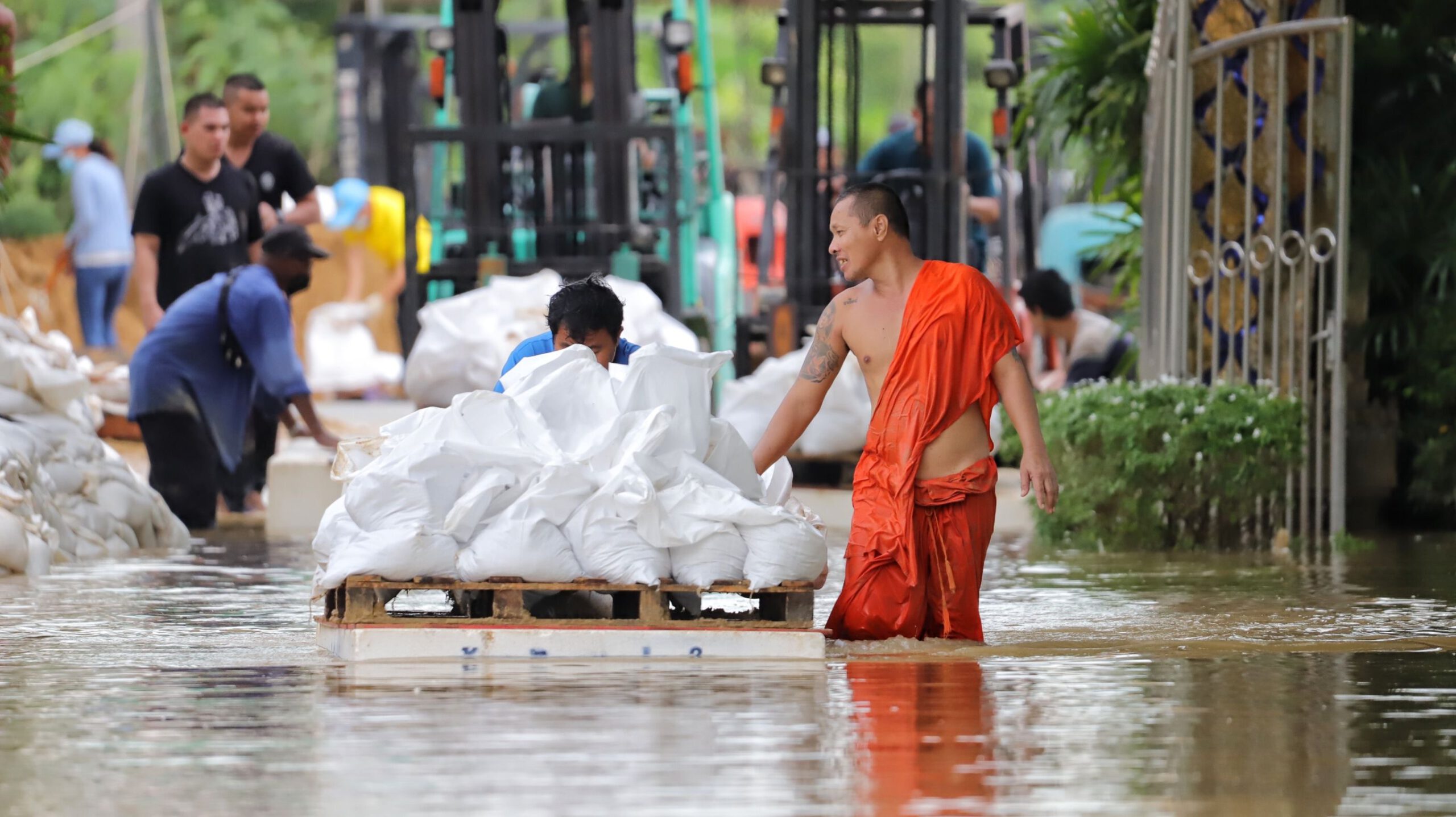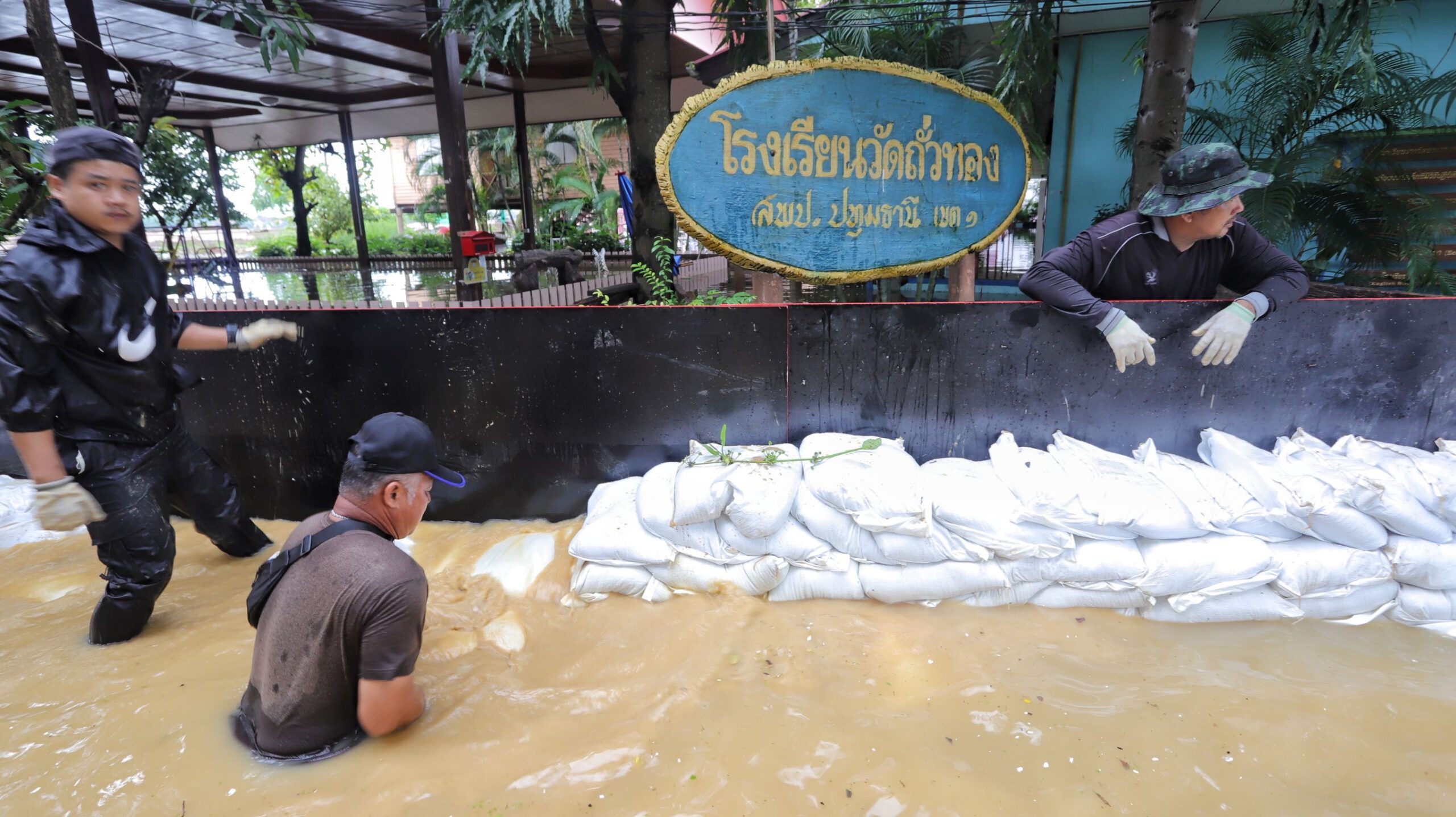ปทุมธานี คนปทุมไม่ทิ้งกัน ชาญลุยน้ำแจกข้าวกล่องชาวบ้าน วัดชุมชนเร่งเสริมแนวกระสอบทรายทำคันกั้นน้ำ