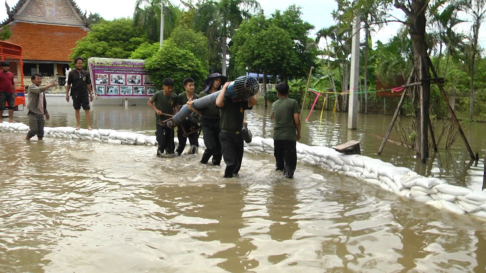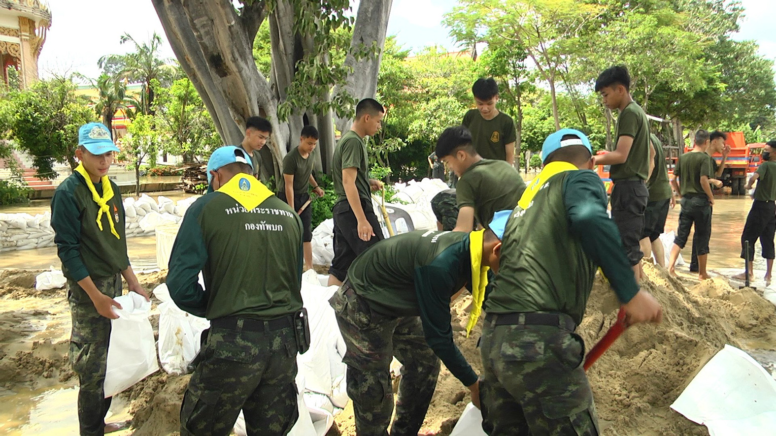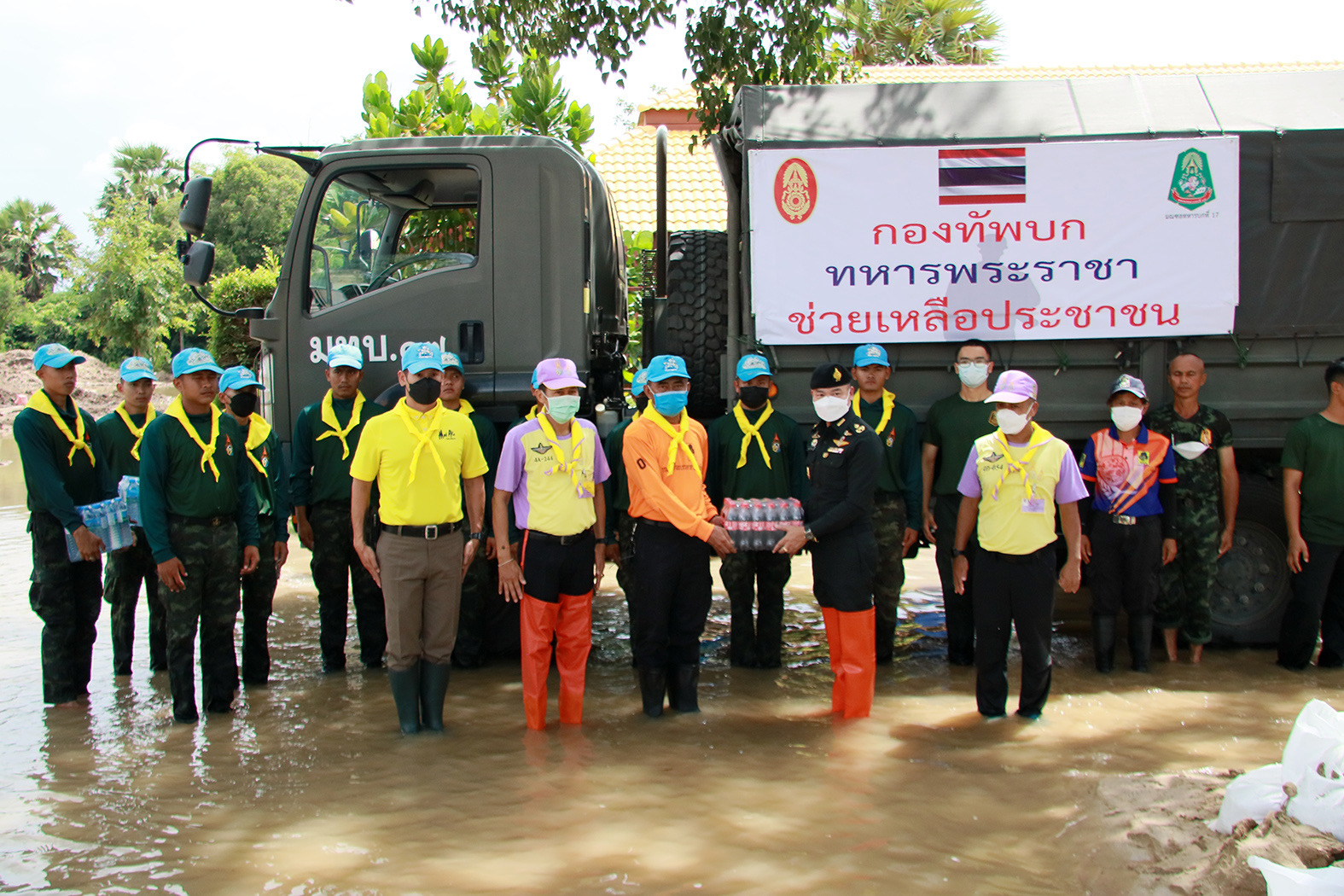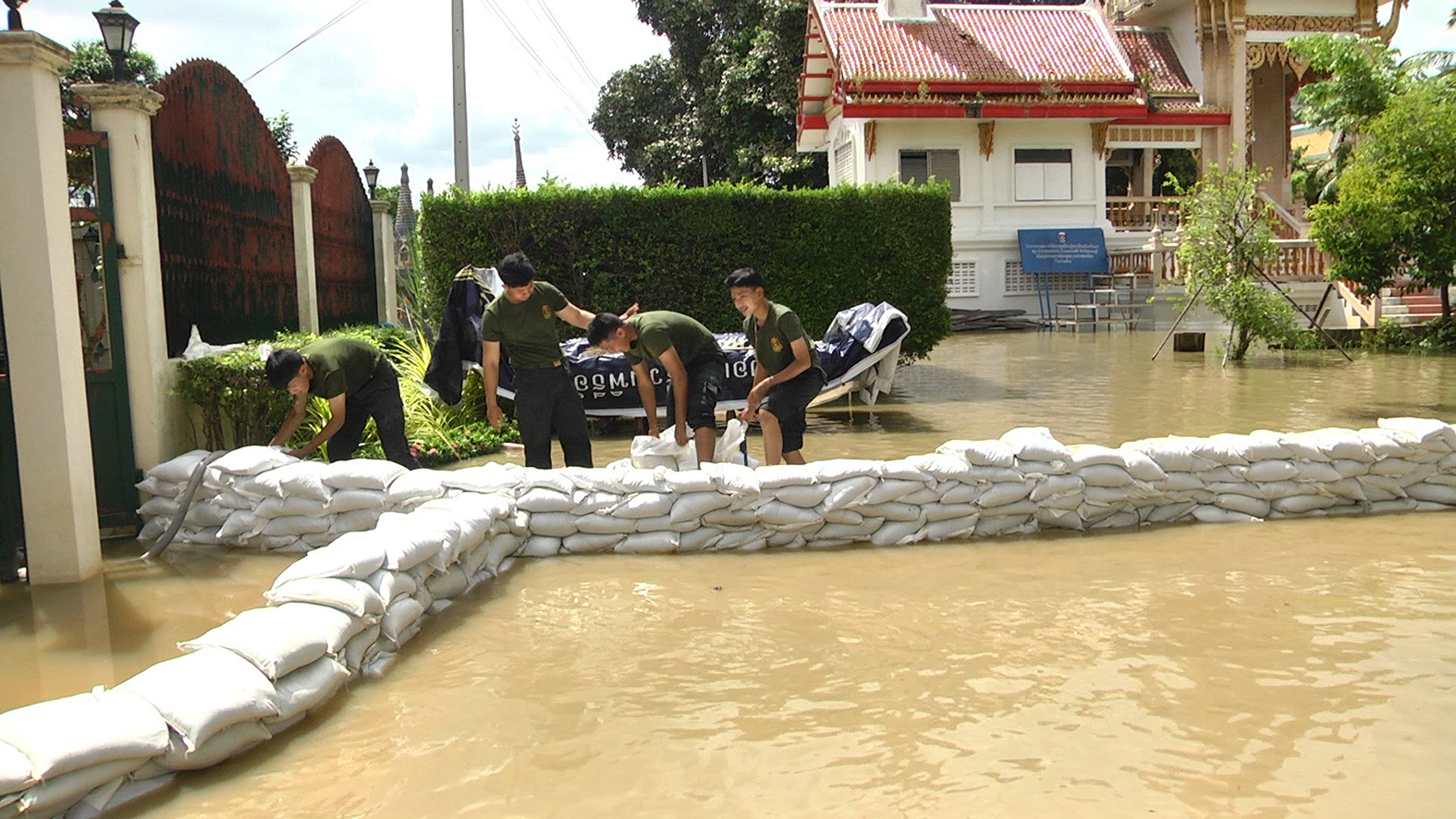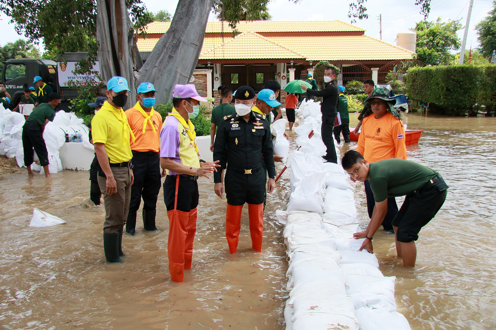 กำลังพลจิตอาสามณฑลทหารบกที่ 17 ร่วมกับส่วนราชการและหน่วยงานที่เกี่ยวข้องในพื้นที่ ช่วยกรอกกระสอบทรายทำแนวป้องกันน้ำท่วมวัดสำปะซิว อำเภอเมืองสุพรรณบุรี และช่วยเหลือชาวบ้านในชุมชนที่ได้รับผลกระทบจากอุกภัย
